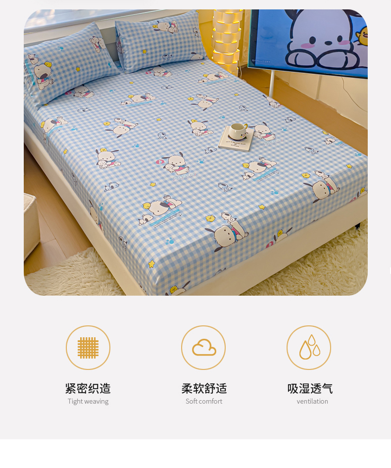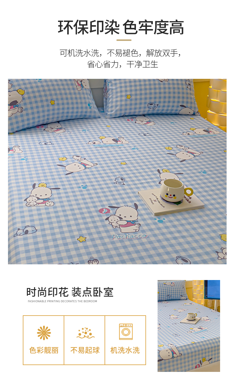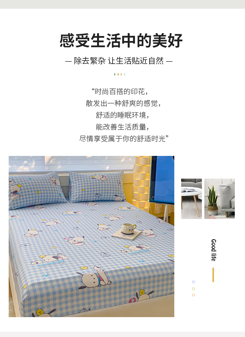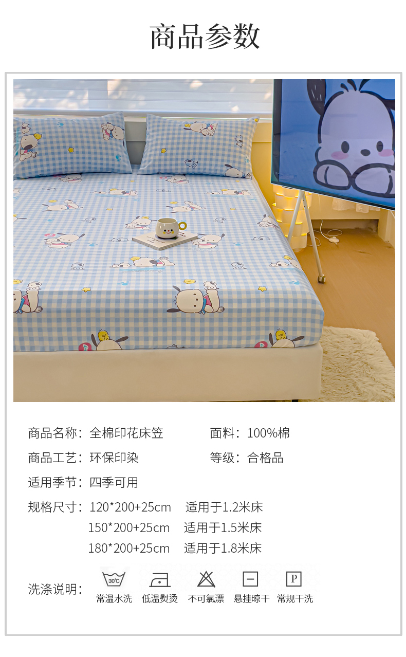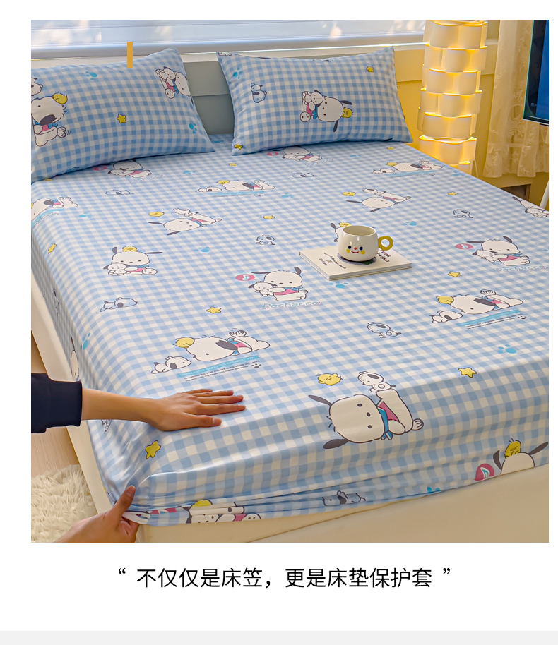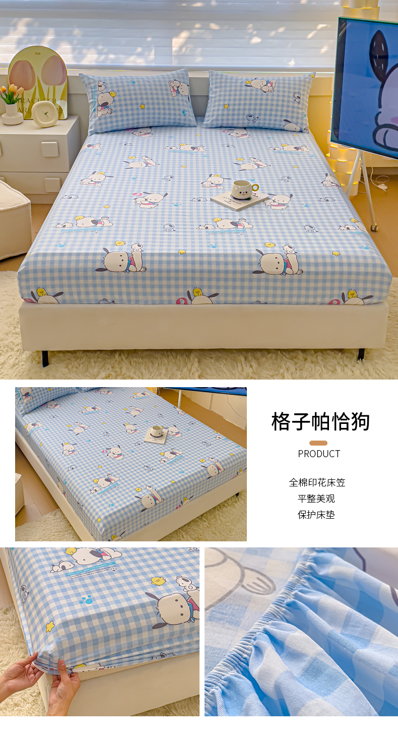 • 91家纺网 家纺一手货源 找家纺 金丝鸟家纺 2024新款全棉三丽鸥系列床笠 格子帕恰狗