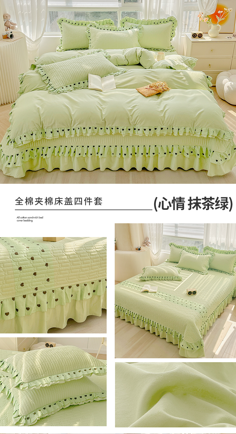 当前位置: 91家纺网 > 商品网购 > 床品套件 > 四件套 > 全棉普通四件套 > 宜凡家纺 2024新品全棉夹棉双层花边床盖四件套-心情 心情 抹茶绿