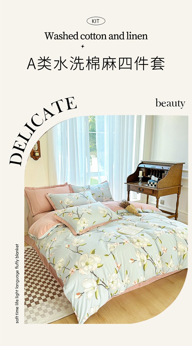 当前位置: 91家纺网 > 商品网购 > 床品套件 > 四件套 > 水洗棉四件套 > 卡普家居2025新款A类水洗棉麻四件套 悠悠花海