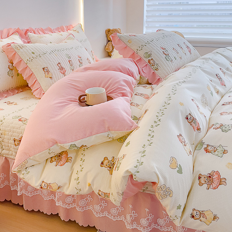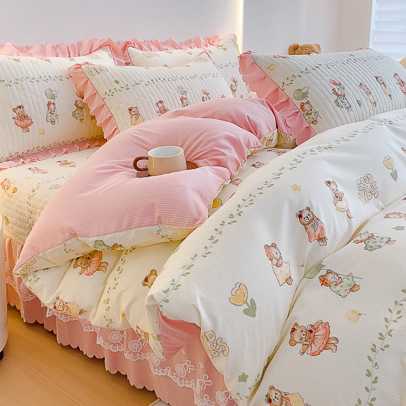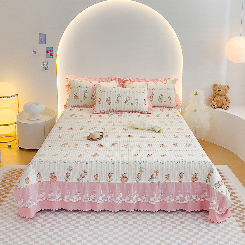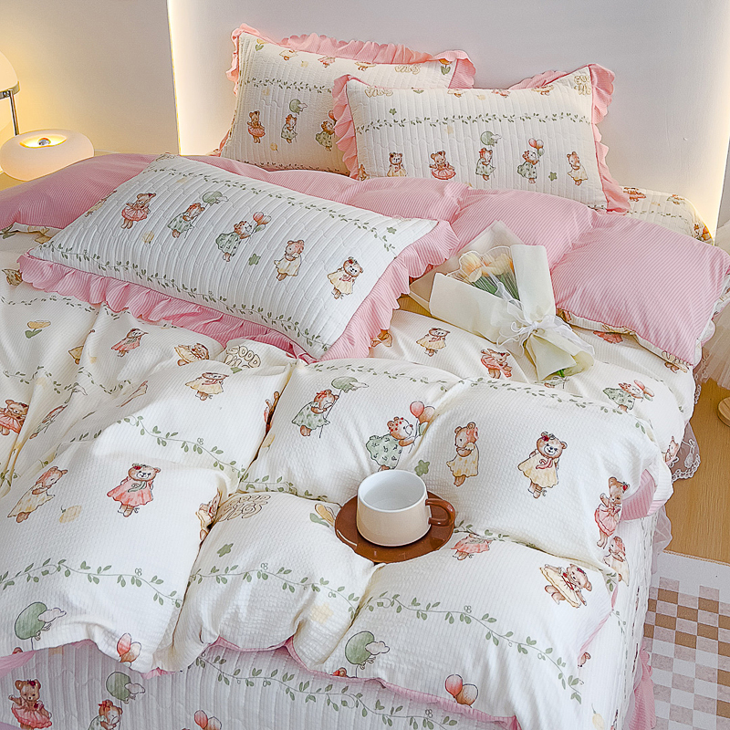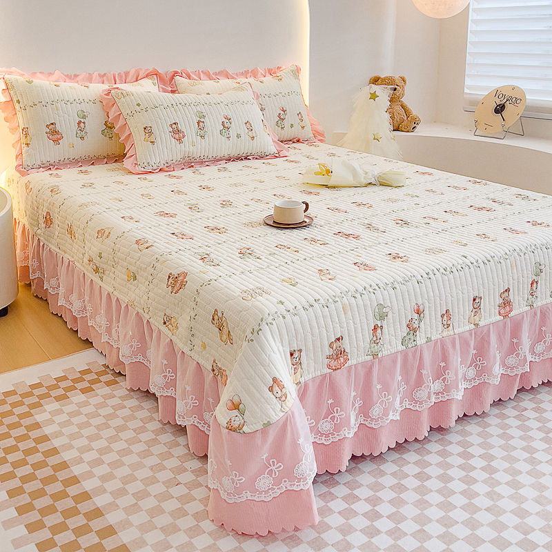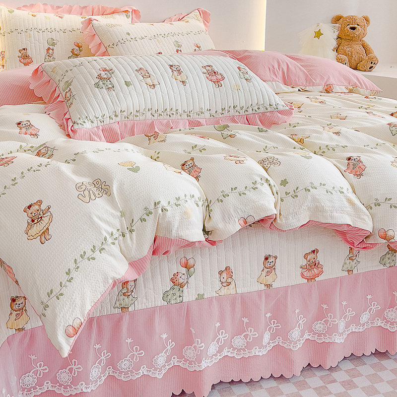 2024直播爆款泡泡棉床盖款四件套双层蕾丝花边夹棉床裙款三件套 小熊派对