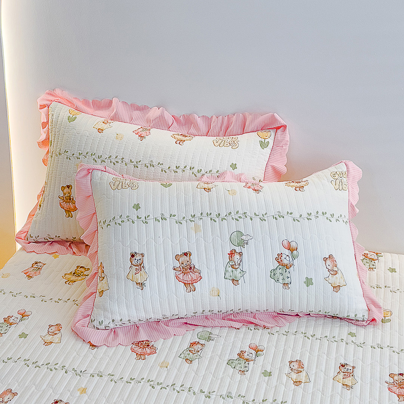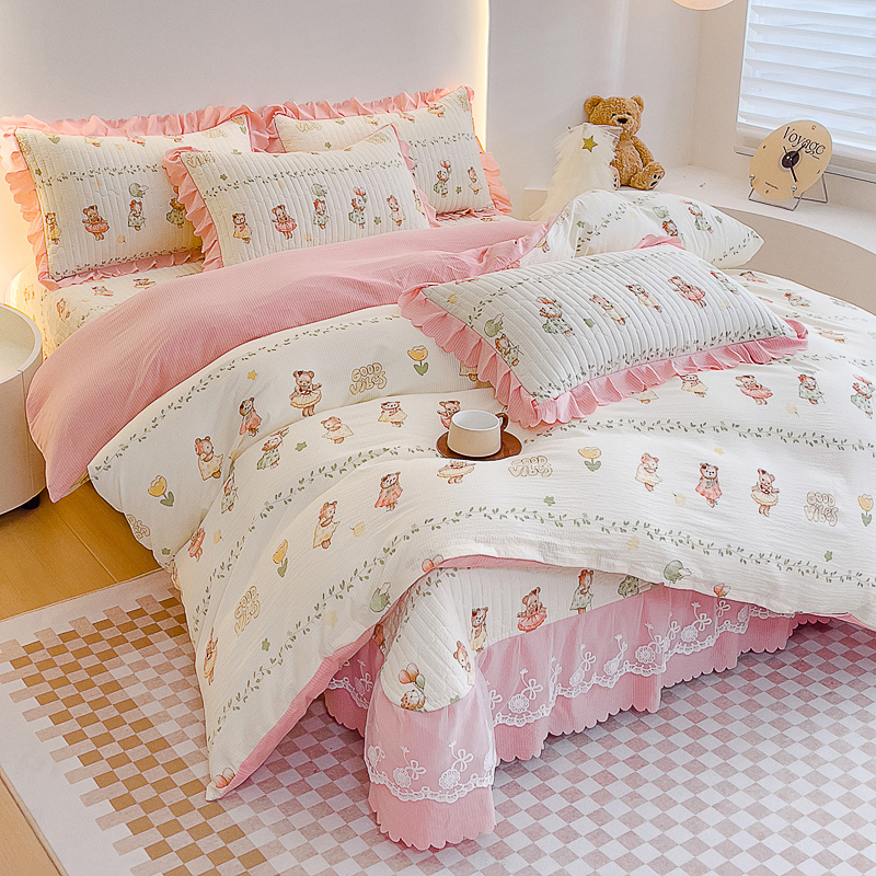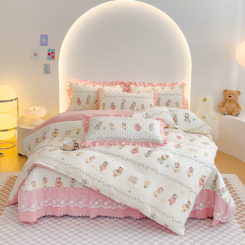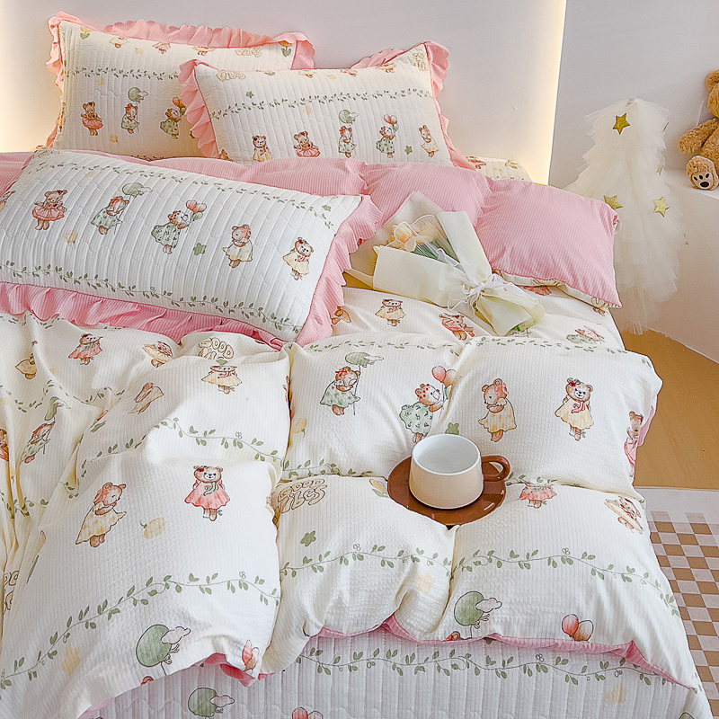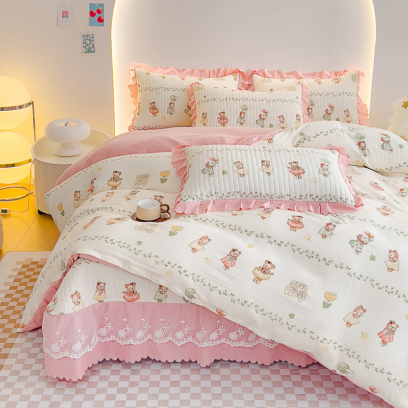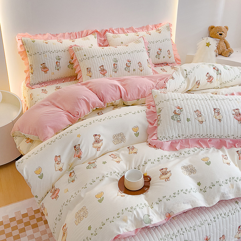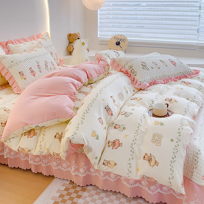 2024直播爆款泡泡棉床盖款四件套双层蕾丝花边夹棉床裙款三件套 小熊派对