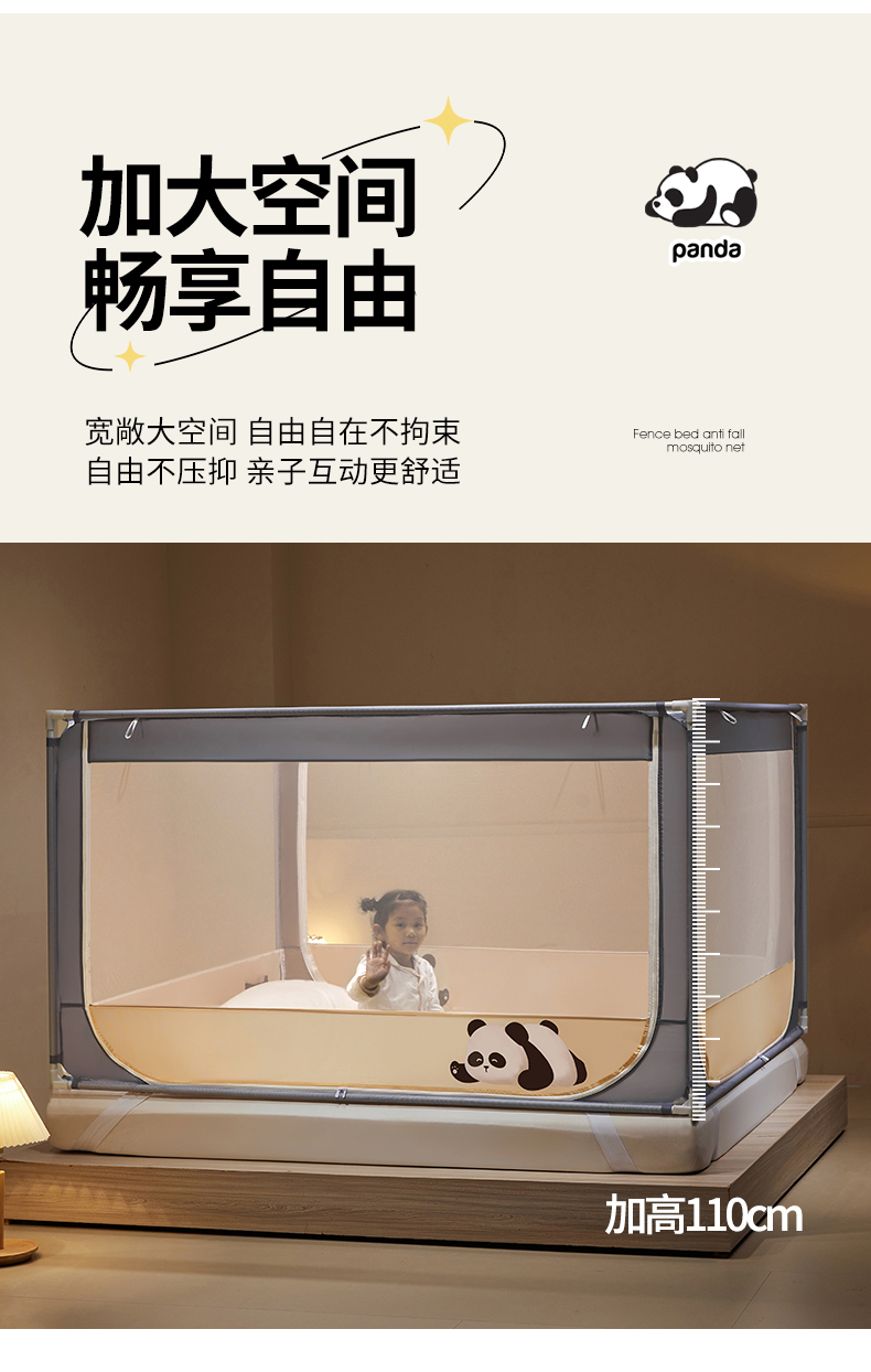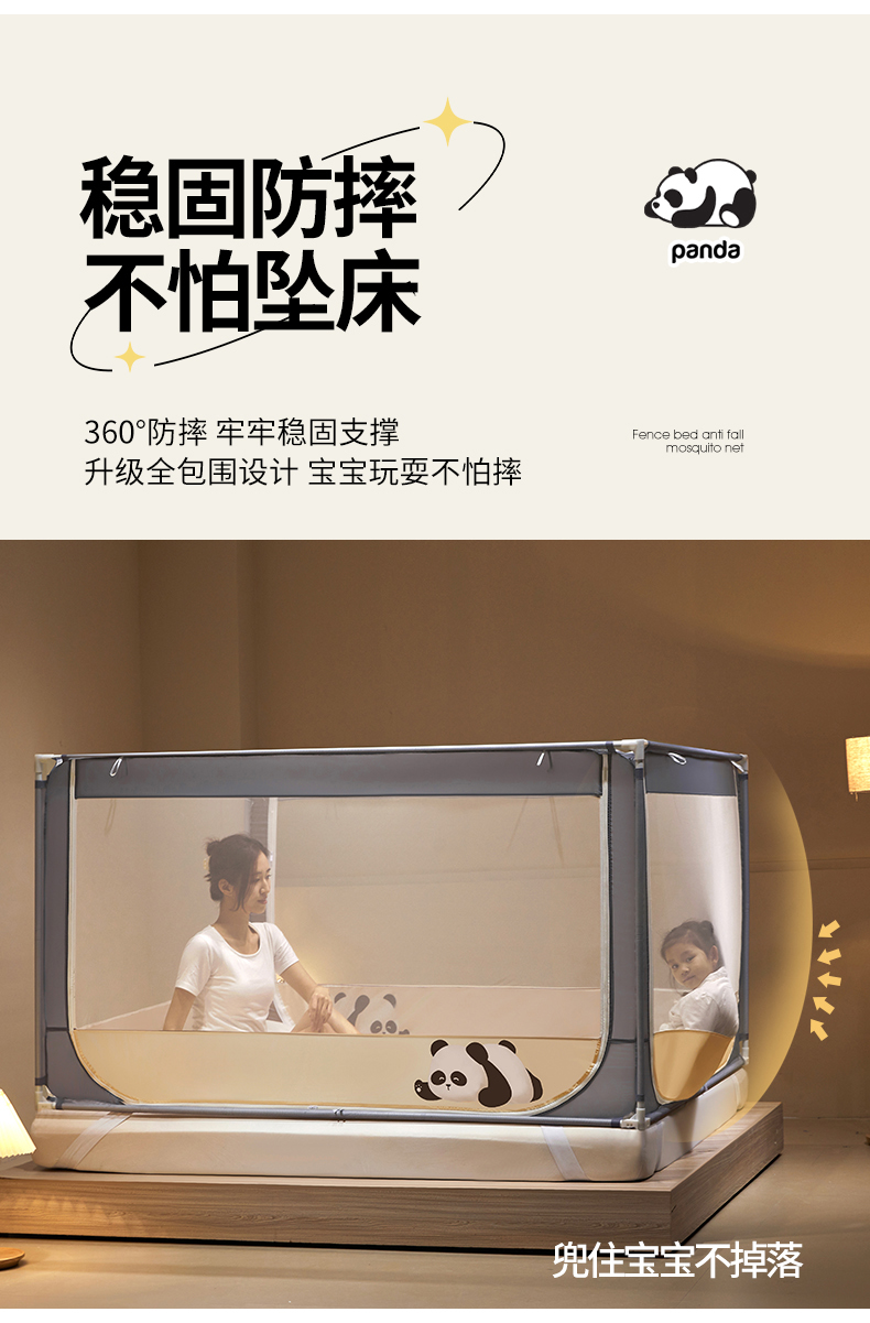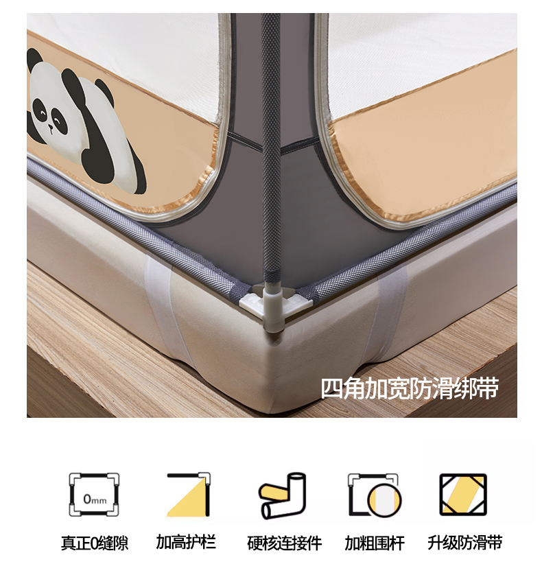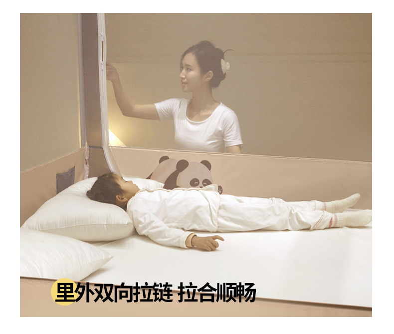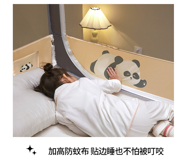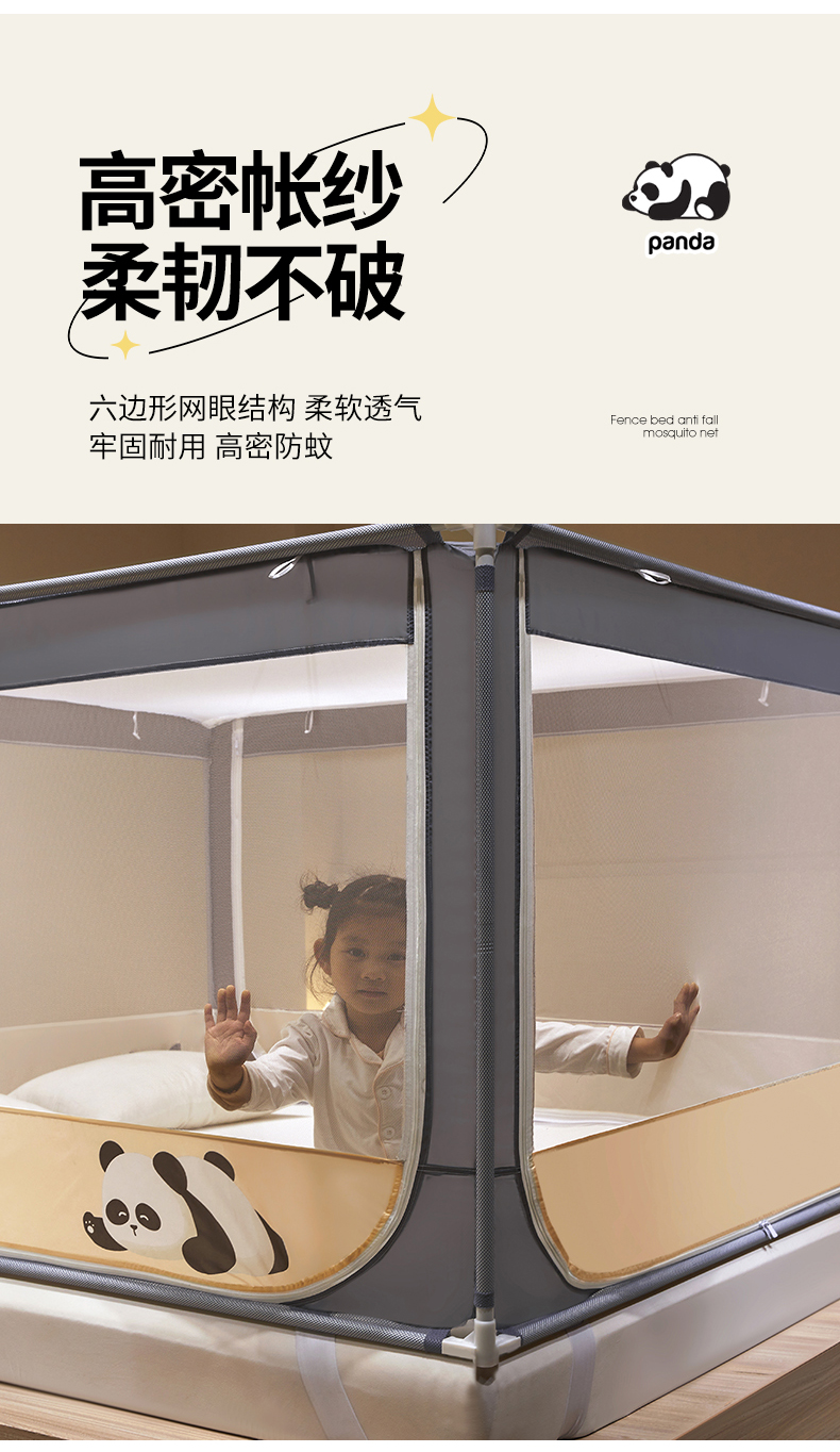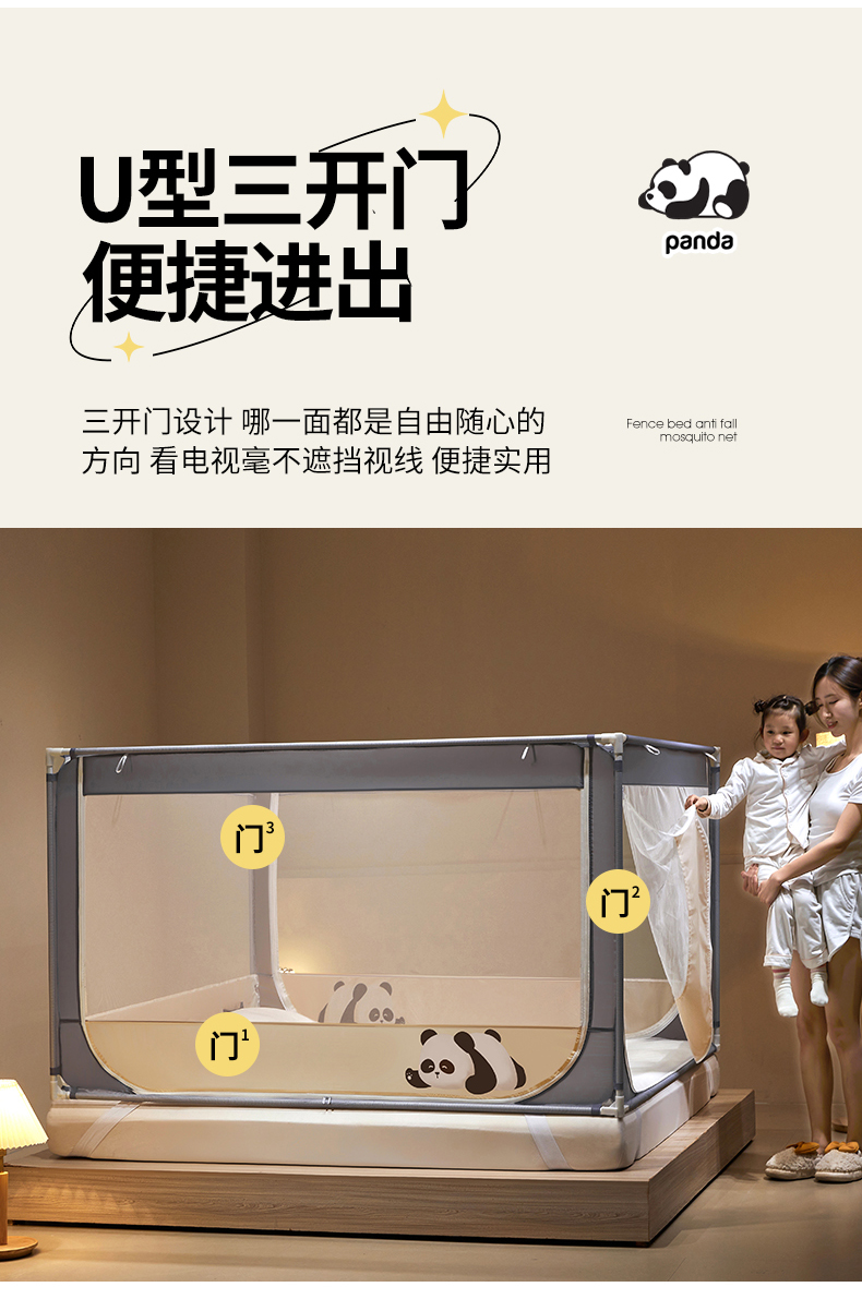 商品名称: 伊而梦蚊帐 2024新款围栏防摔U形三开门坐床蚊帐 围栏款-熊猫-杏