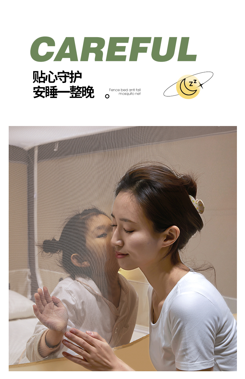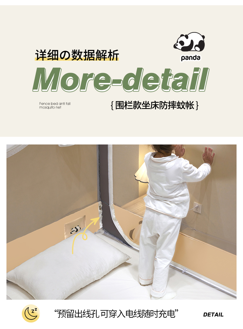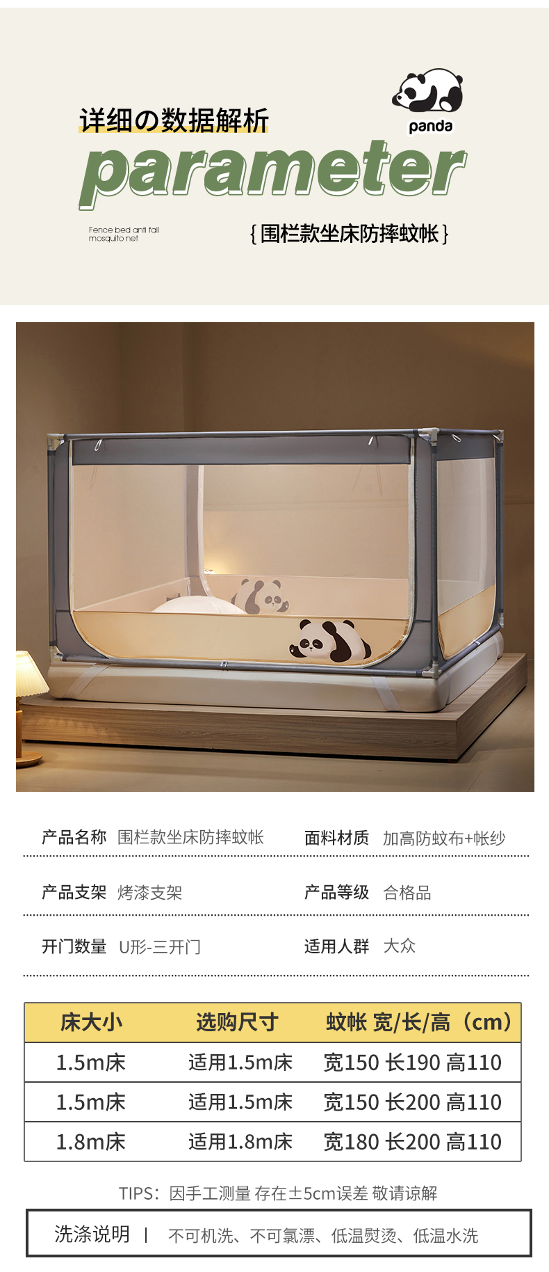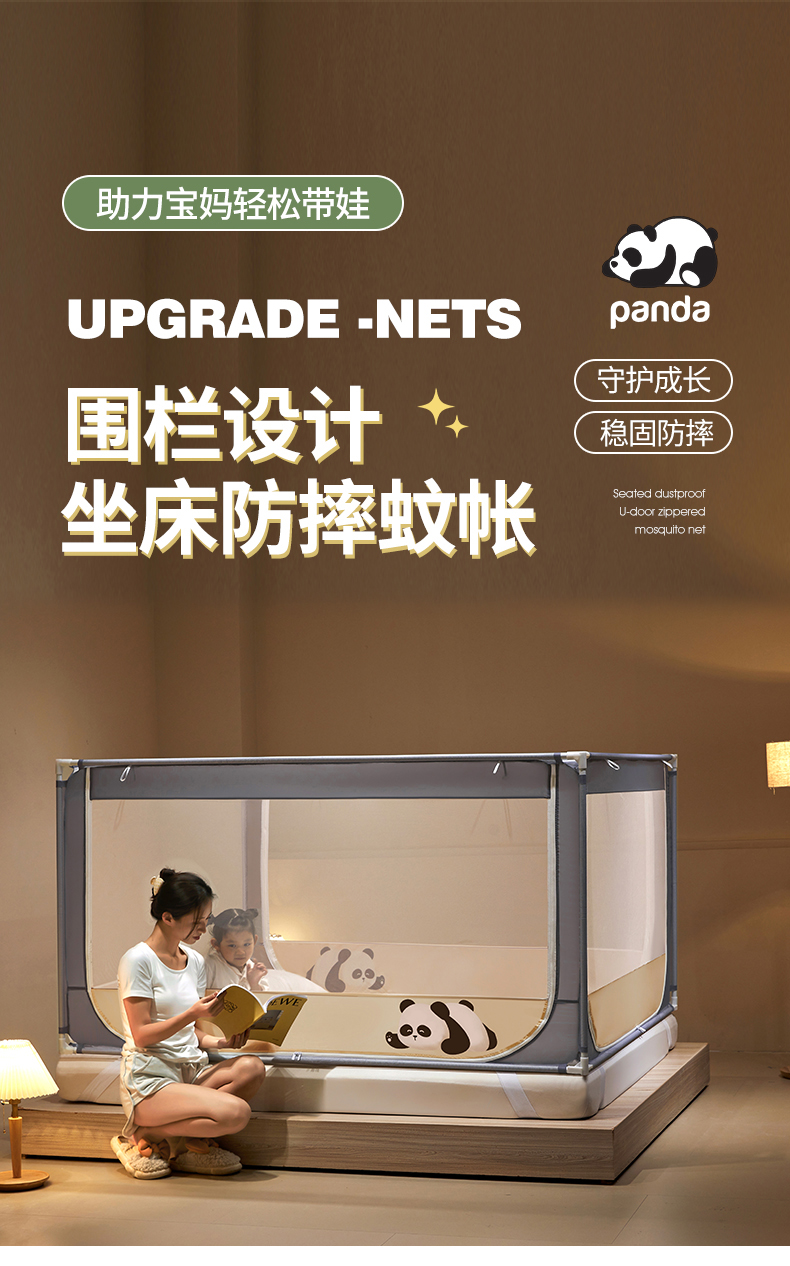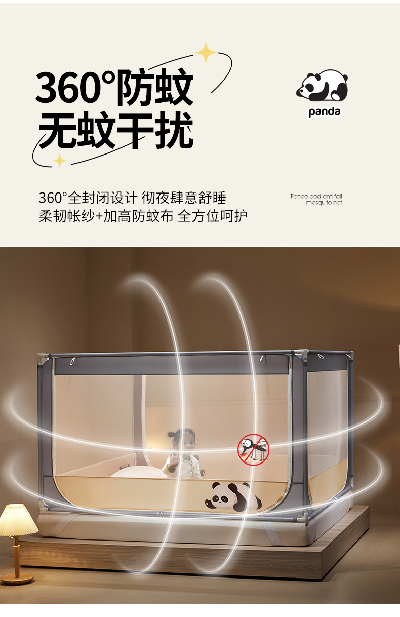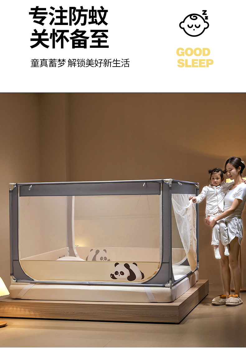 商品名称: 伊而梦蚊帐 2024新款围栏防摔U形三开门坐床蚊帐 围栏款-熊猫-杏