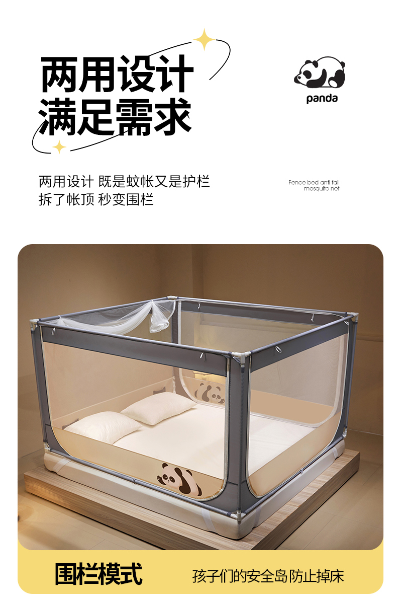 伊而梦蚊帐 2024新款围栏防摔U形三开门坐床蚊帐 围栏款-熊猫-杏