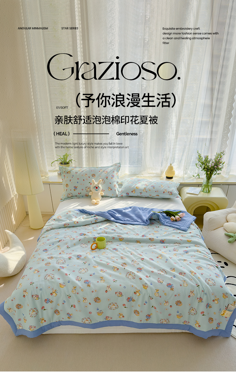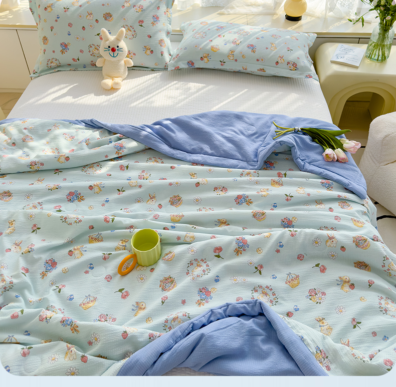 蓝冰家纺 2024新款亲肤舒适泡泡棉印花夏被 花丛兔
