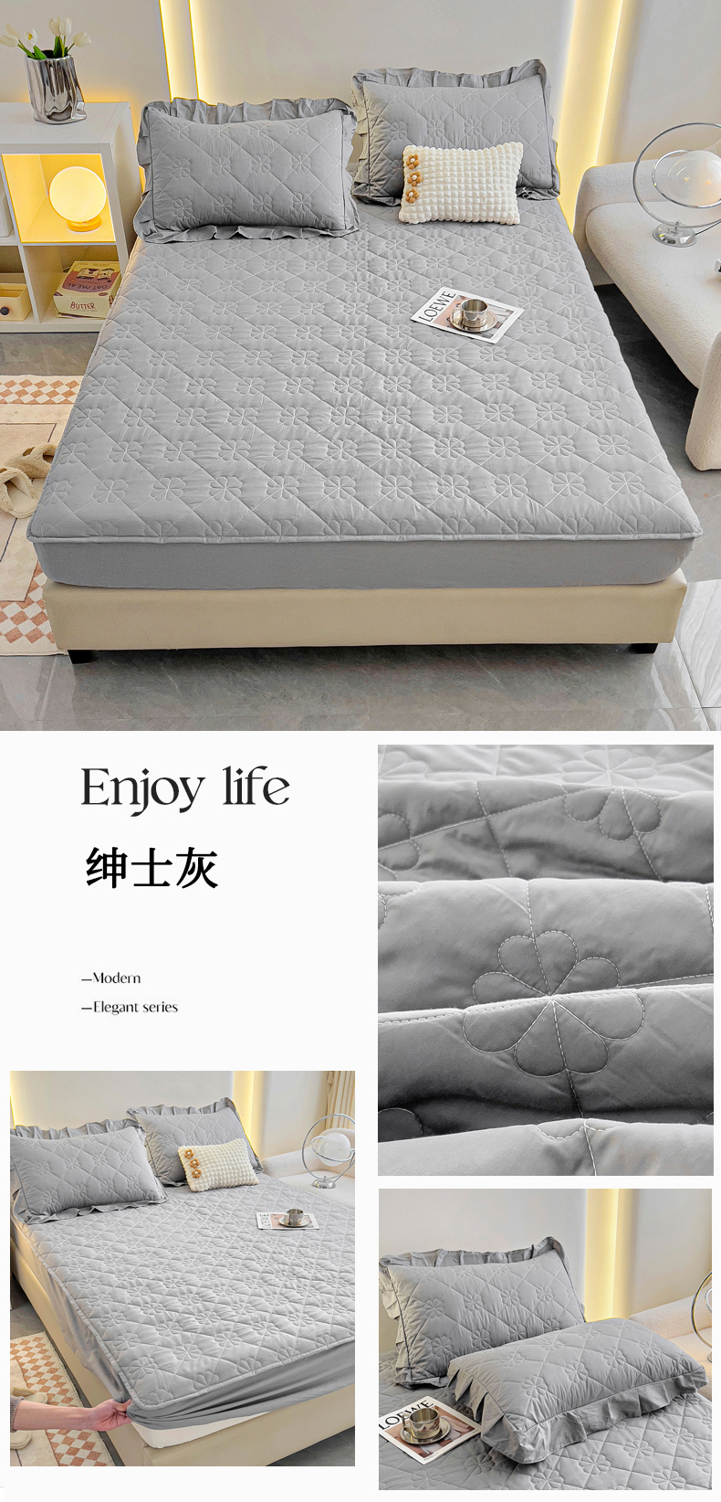 • 91家纺网 家纺一手货源 找家纺 情煊家纺 2024新款全棉亲肤夹棉纯色床笠 绅士灰