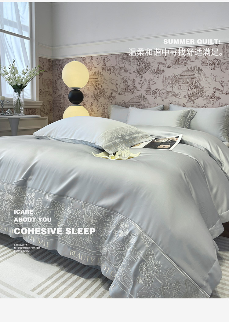 商品名称: 2024新款A类母婴级凉感真丝夏季裸睡丝滑床单床笠轻奢刺绣四件套 慕云灰