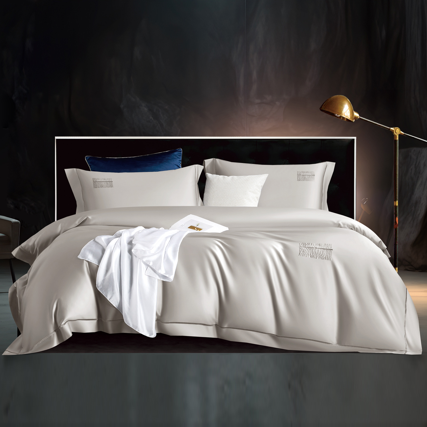 总玖玖爱家纺 纯棉100支贡缎长绒棉刺绣被套三件套四件套加大四件套,白色,高级灰,卡其,蓝灰,绿色,浅桔,深蓝,紫豆沙
