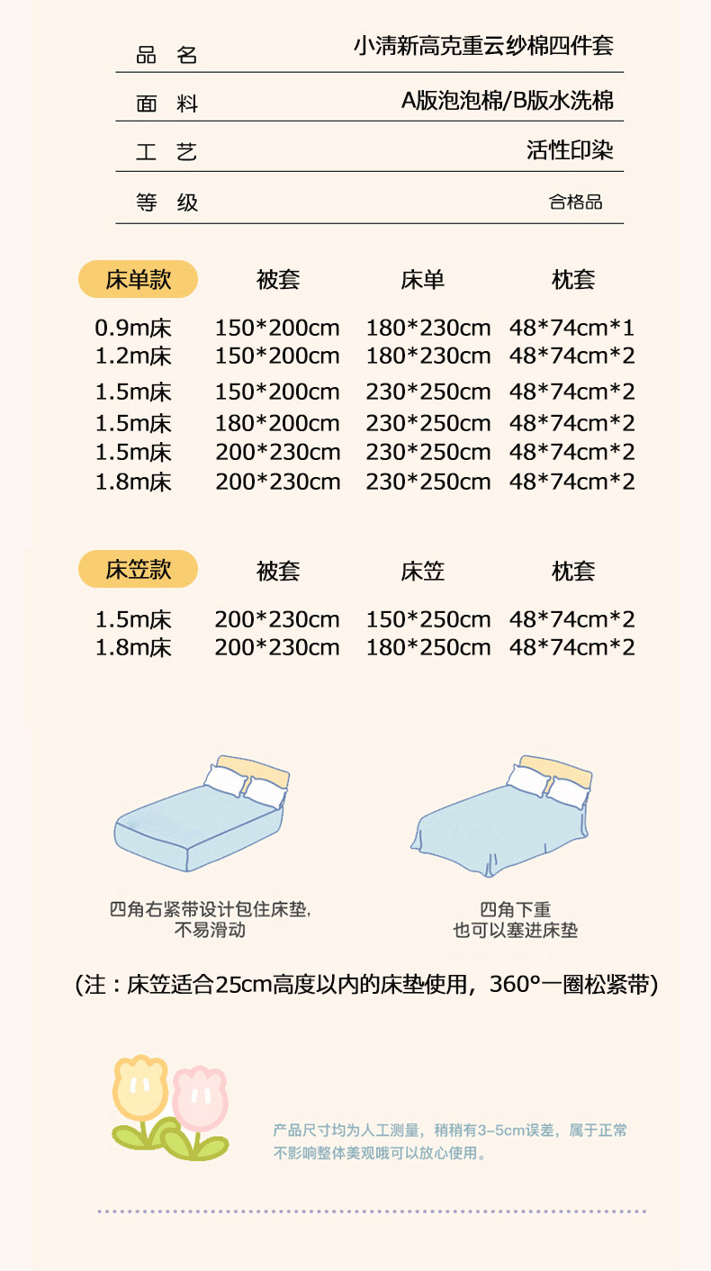 1.50m床:被套150×200 床单230*250 枕套48×74*2只 | ¥48.00 |