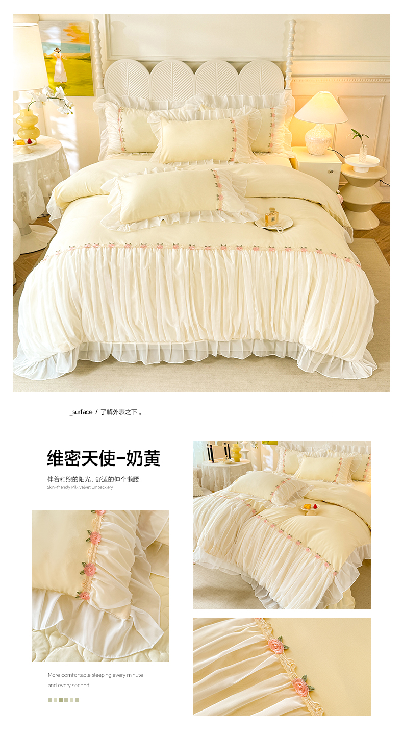 当前位置: 91家纺网 > 商品网购 > 床品套件 > 四件套 > 其它四件套 > 逸尚阁 2024新款水洗磨毛蕾丝拼接四件套--维密天使系列 维密天使-奶黄