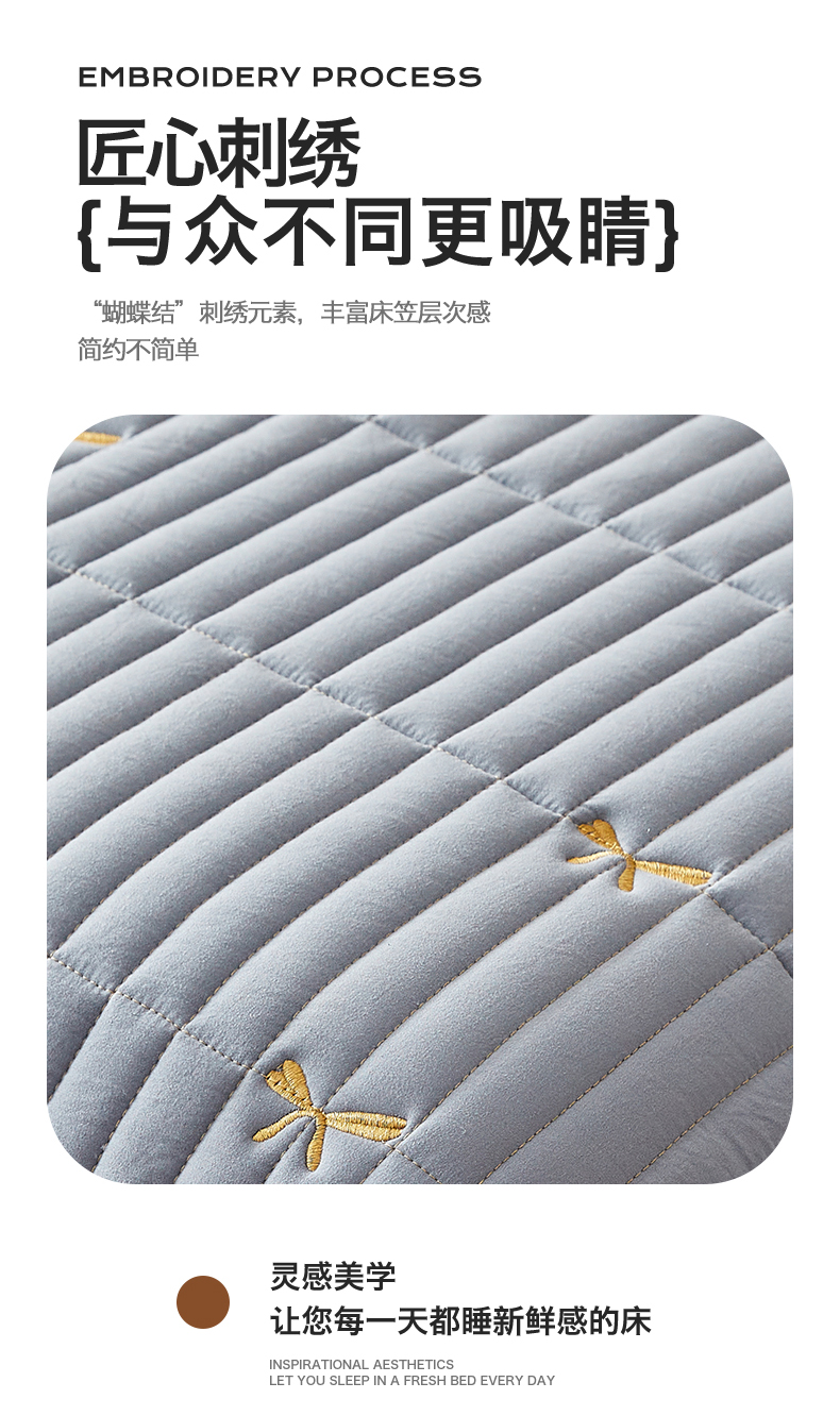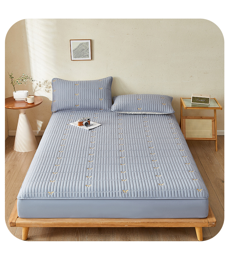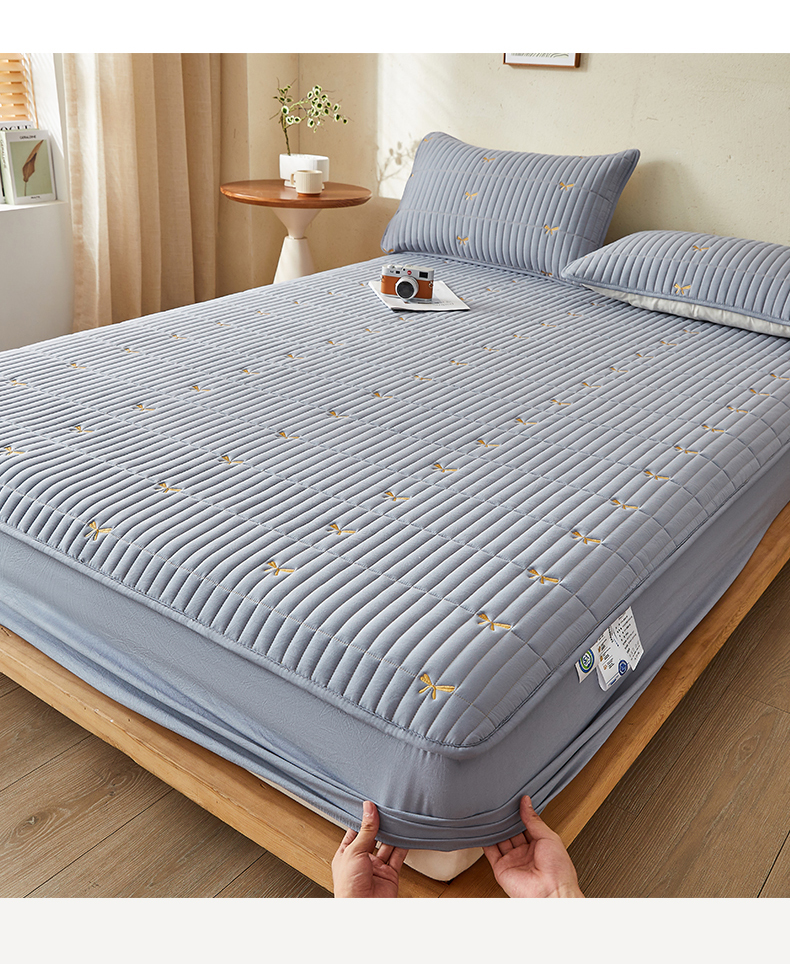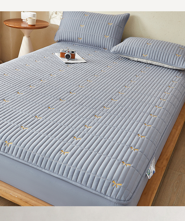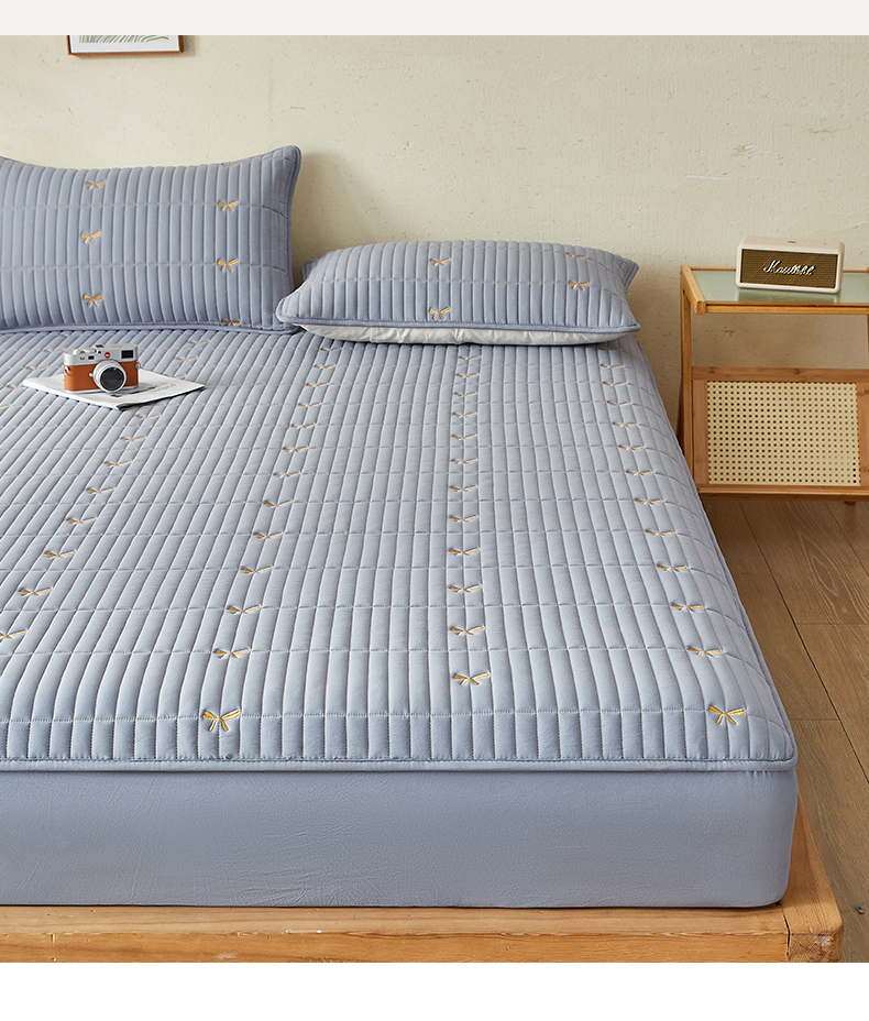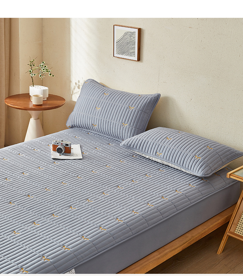 叠派家纺 2024新款水洗棉刺绣夹棉床笠 蝴蝶结-蓝灰