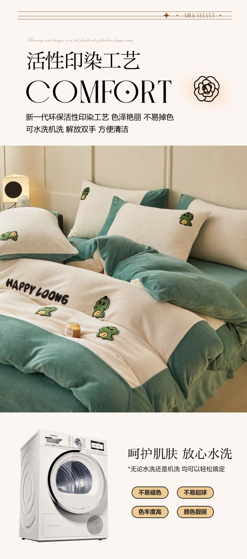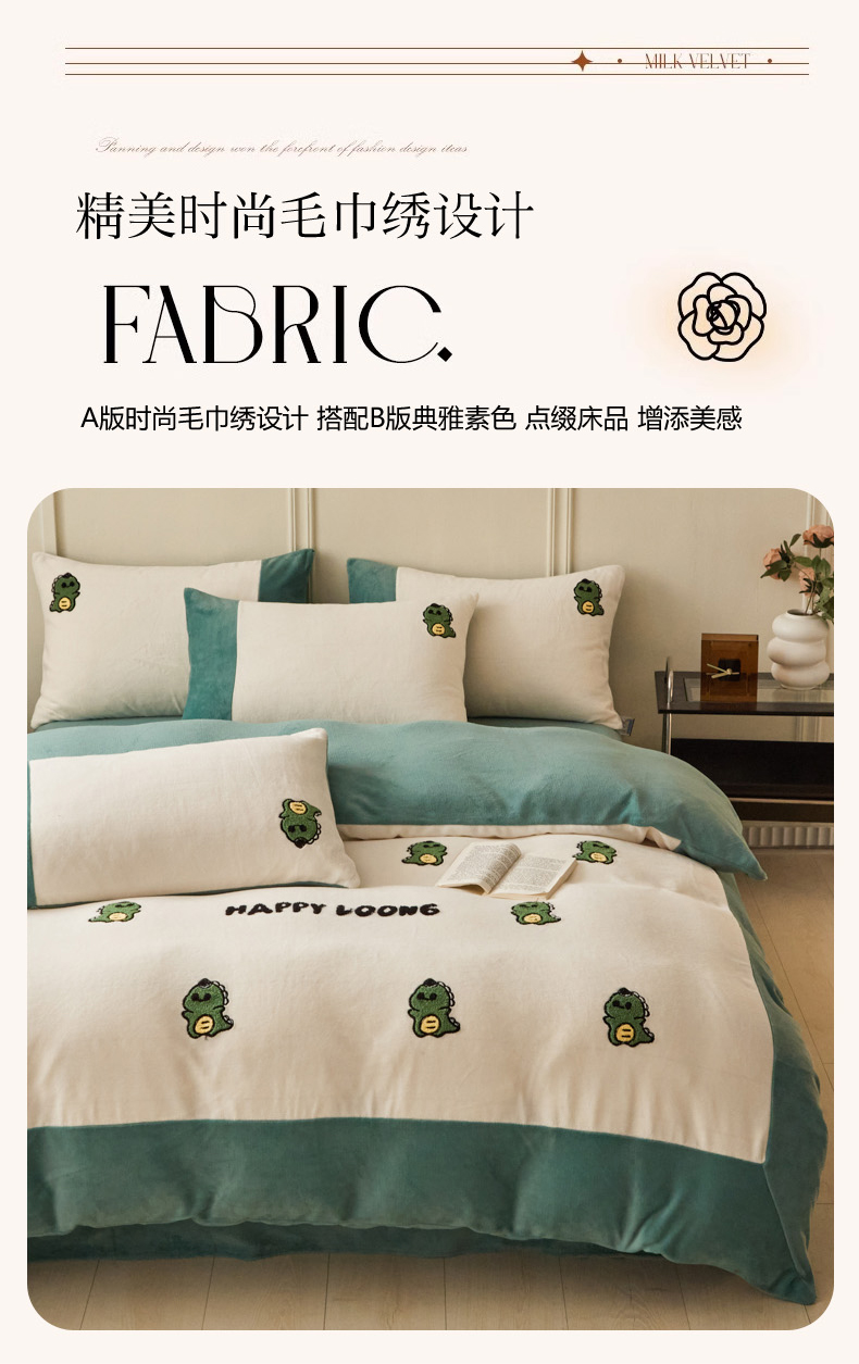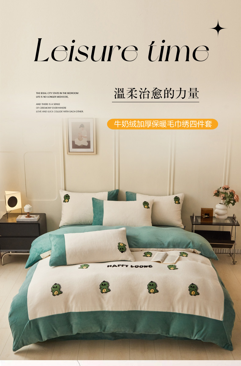 (总)恋佳居 2025新款高克重全工艺牛奶绒毛巾绣四件套,嗨皮狗复古紫,嗨皮狗咖色,嗨皮狗米色,恐龙绿色,恐龙米色,熊猫绿色,熊猫米色,中式熊猫绿色,中式熊猫米色