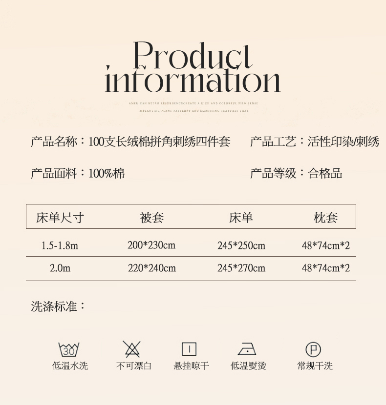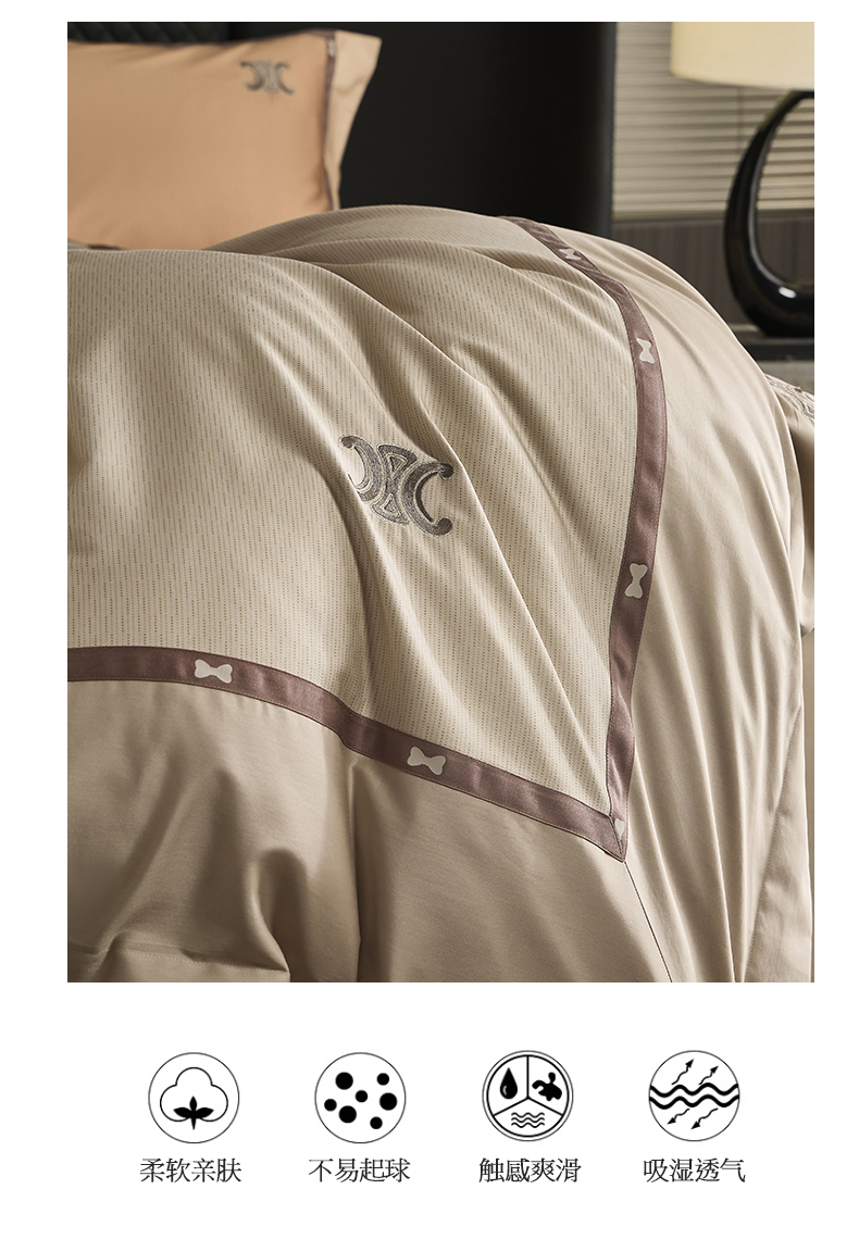 商品名称:名品优仓 2024新款高支高密长绒棉数码印花加织带刺绣拼角款四件套-斯琳娜 斯琳娜-流光灰