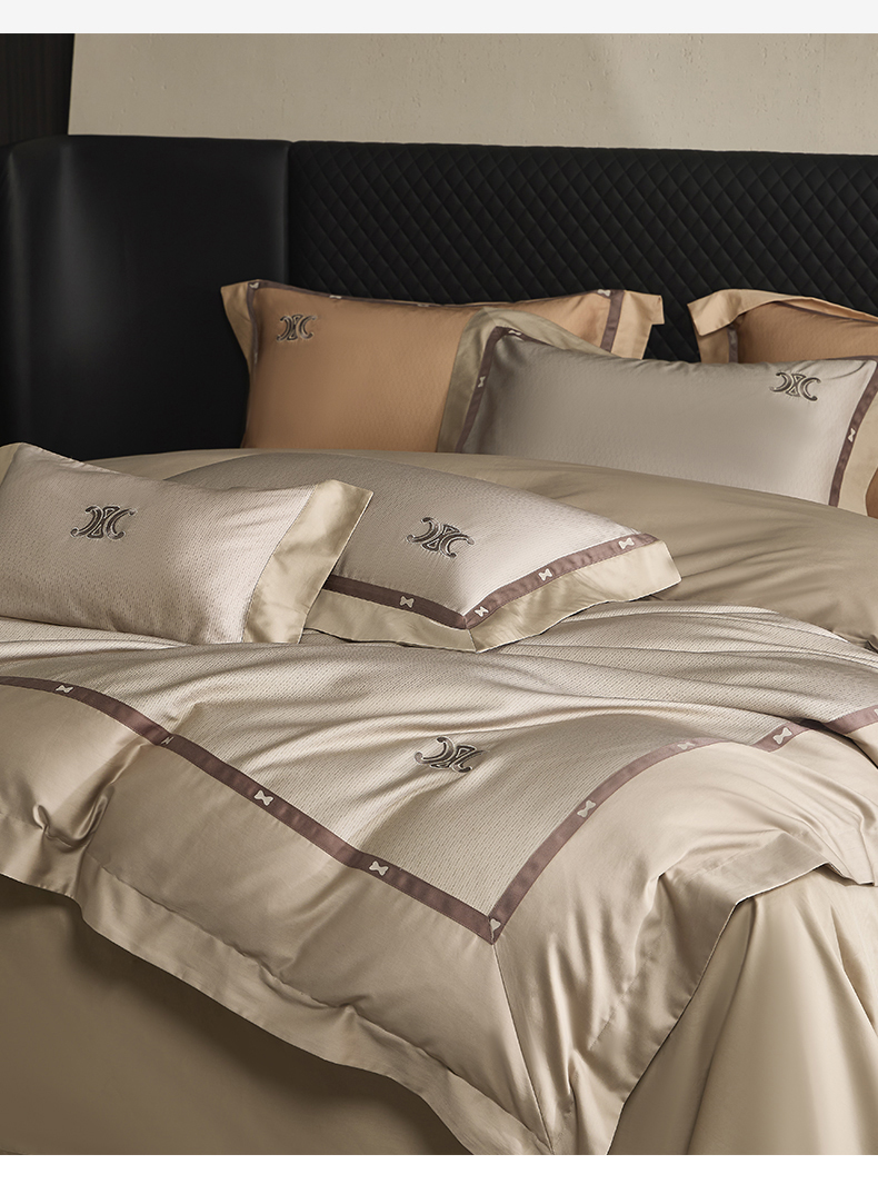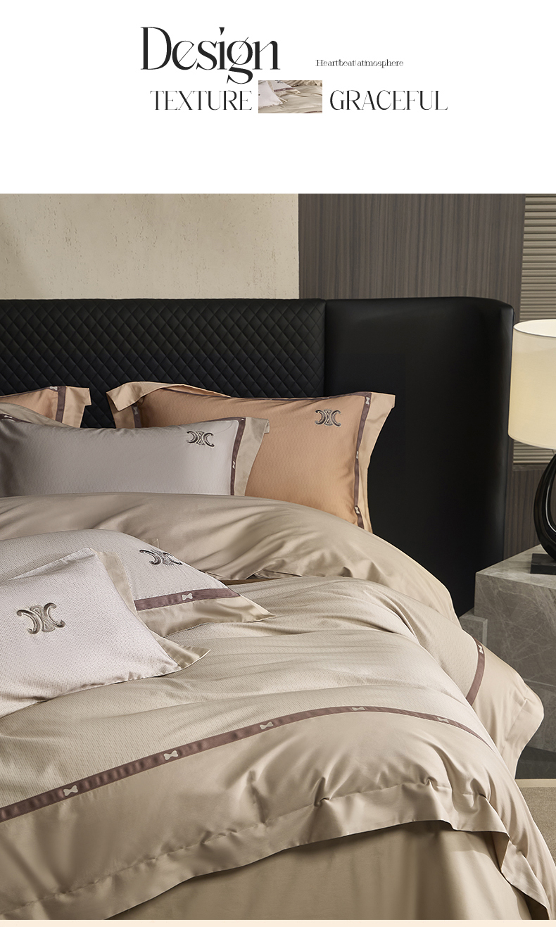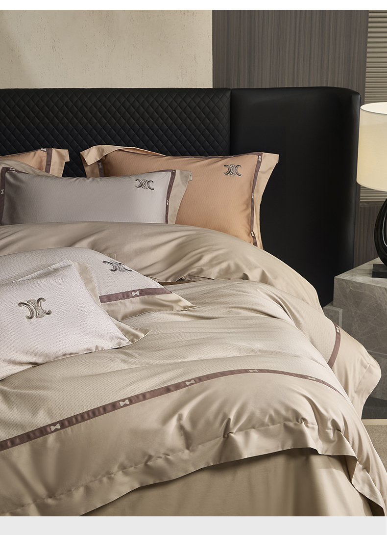 名品优仓 2024新款高支高密长绒棉数码印花加织带刺绣拼角款四件套-斯琳娜 斯琳娜-流光灰