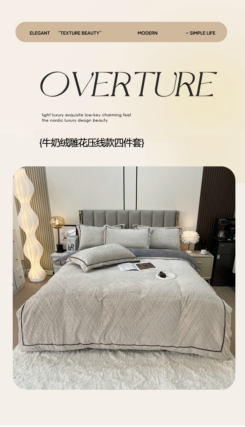 鑫利来家纺 2024新款牛奶绒雕花压线款四件套 欧式-柯南灰