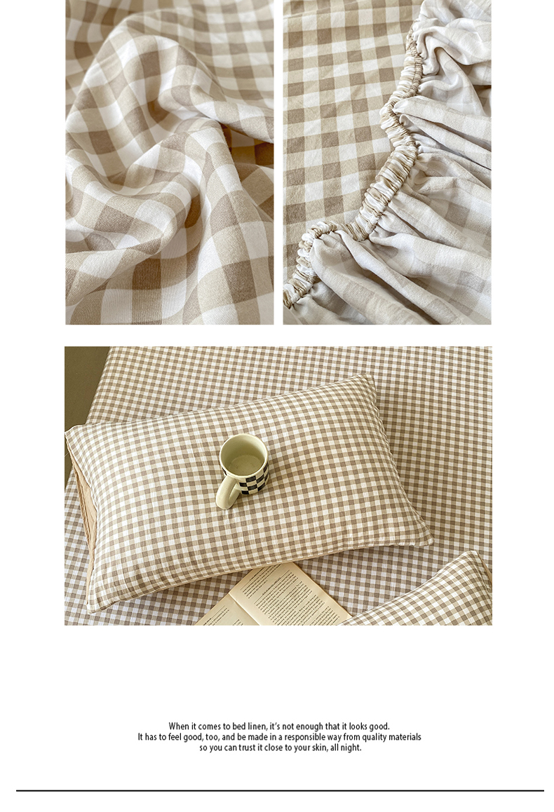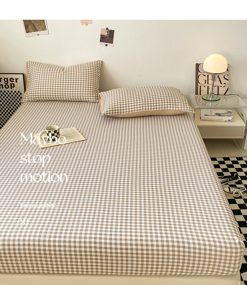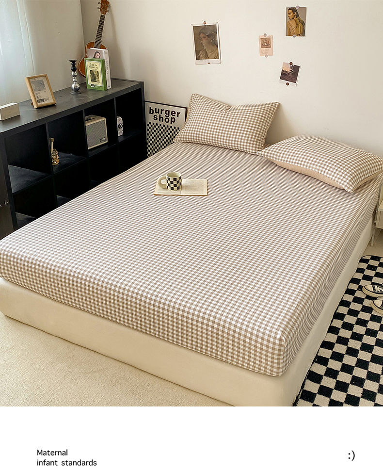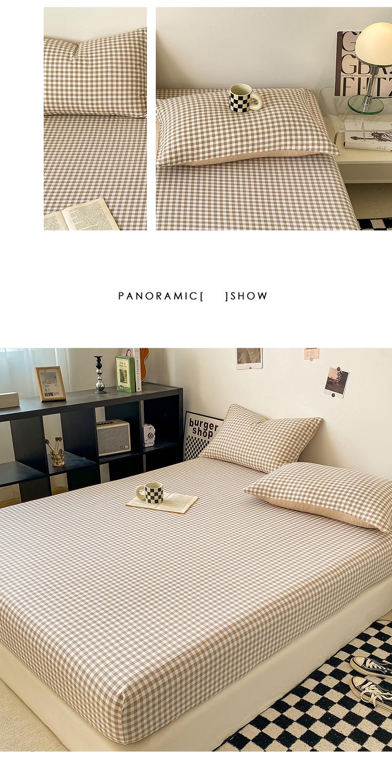 悦织湾家纺 2025新款日式简约格子水洗棉单品床笠系列 布丁咖