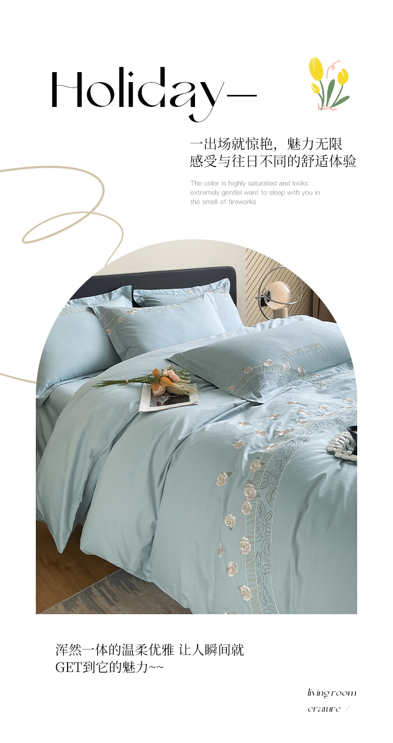(总)理想家家纺 2025新款纯棉轻奢刺绣四件套--心愿系列场景二,心愿粉,心愿红,心愿黄,心愿蓝