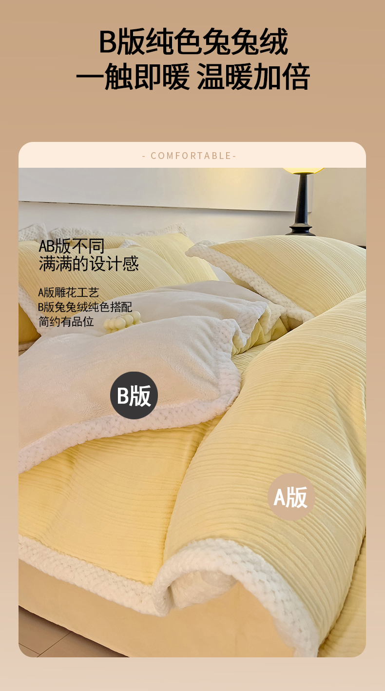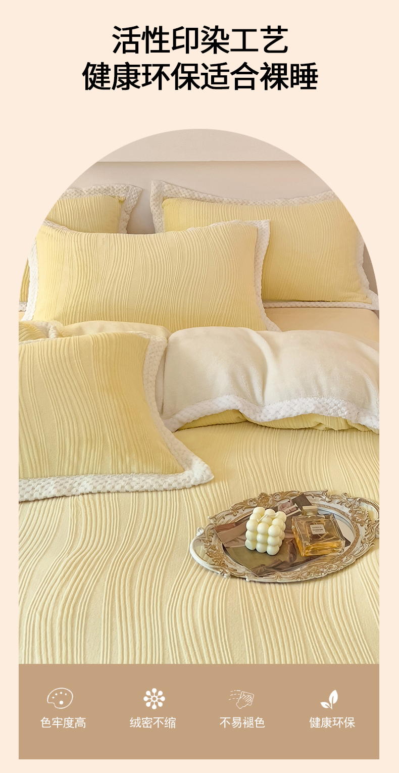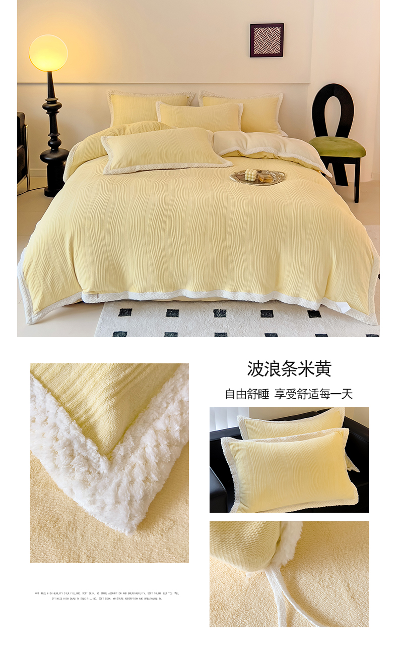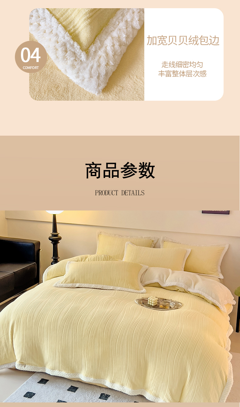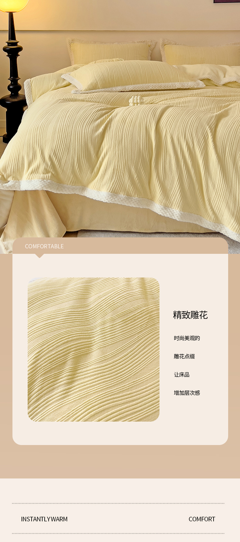 商品名称:2024新款简约包边全消光雕花牛奶绒兔兔绒四件套 包边绒 波浪条米黄