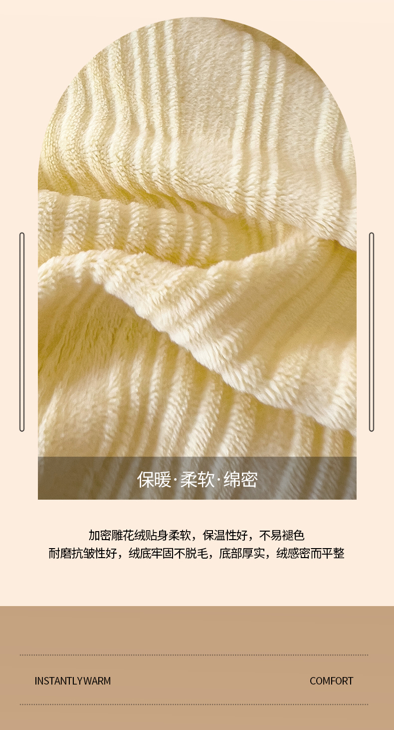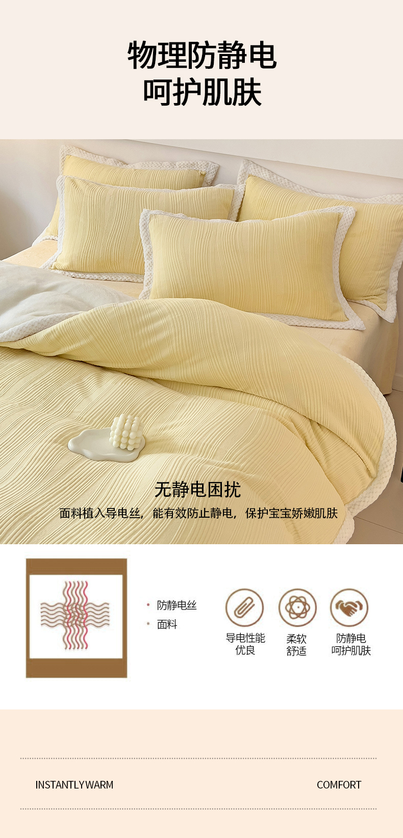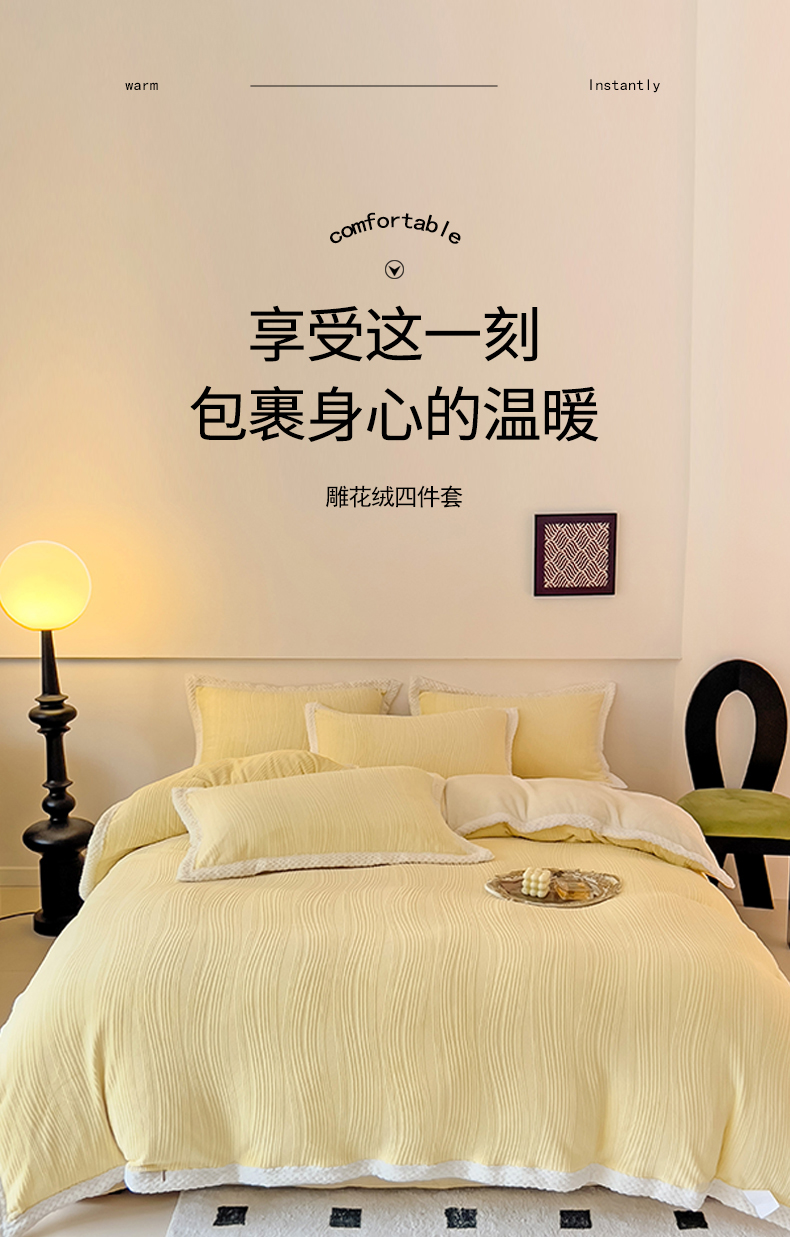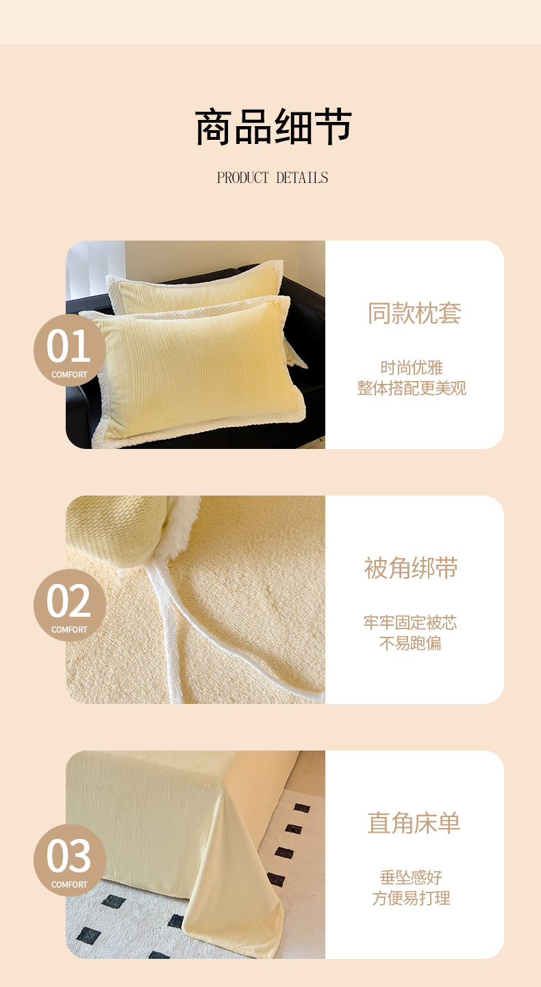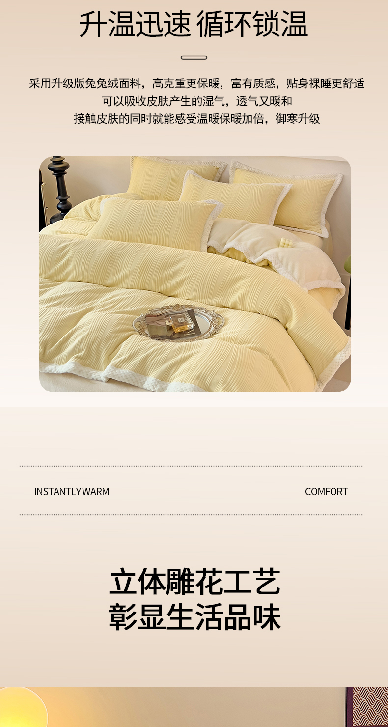 商品名称:2024新款简约包边全消光雕花牛奶绒兔兔绒四件套 包边绒 波浪条米黄