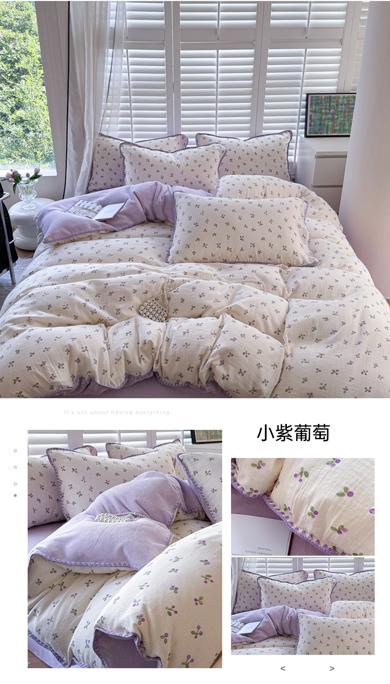 眠屿家纺 2024新款全棉皱皱纱牛奶绒四件套 小紫葡萄