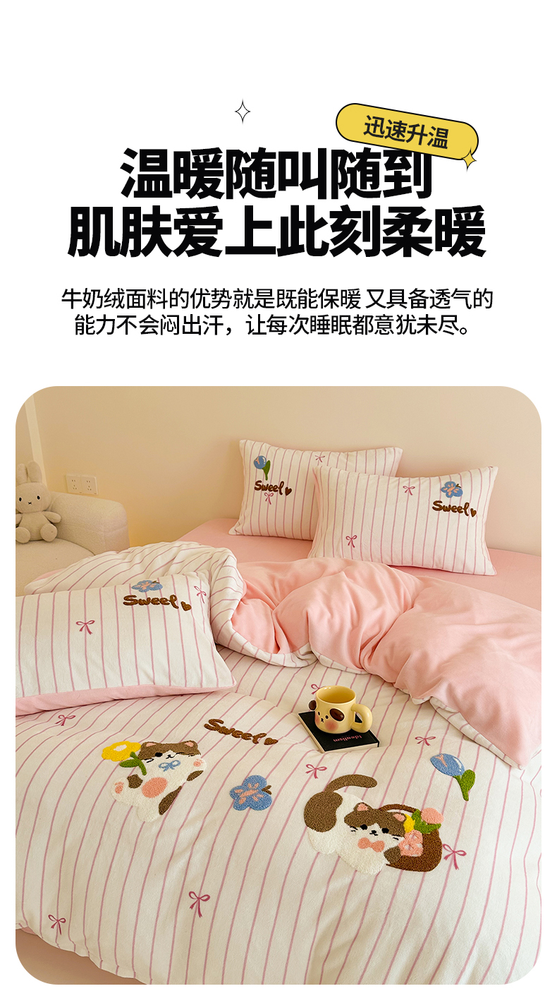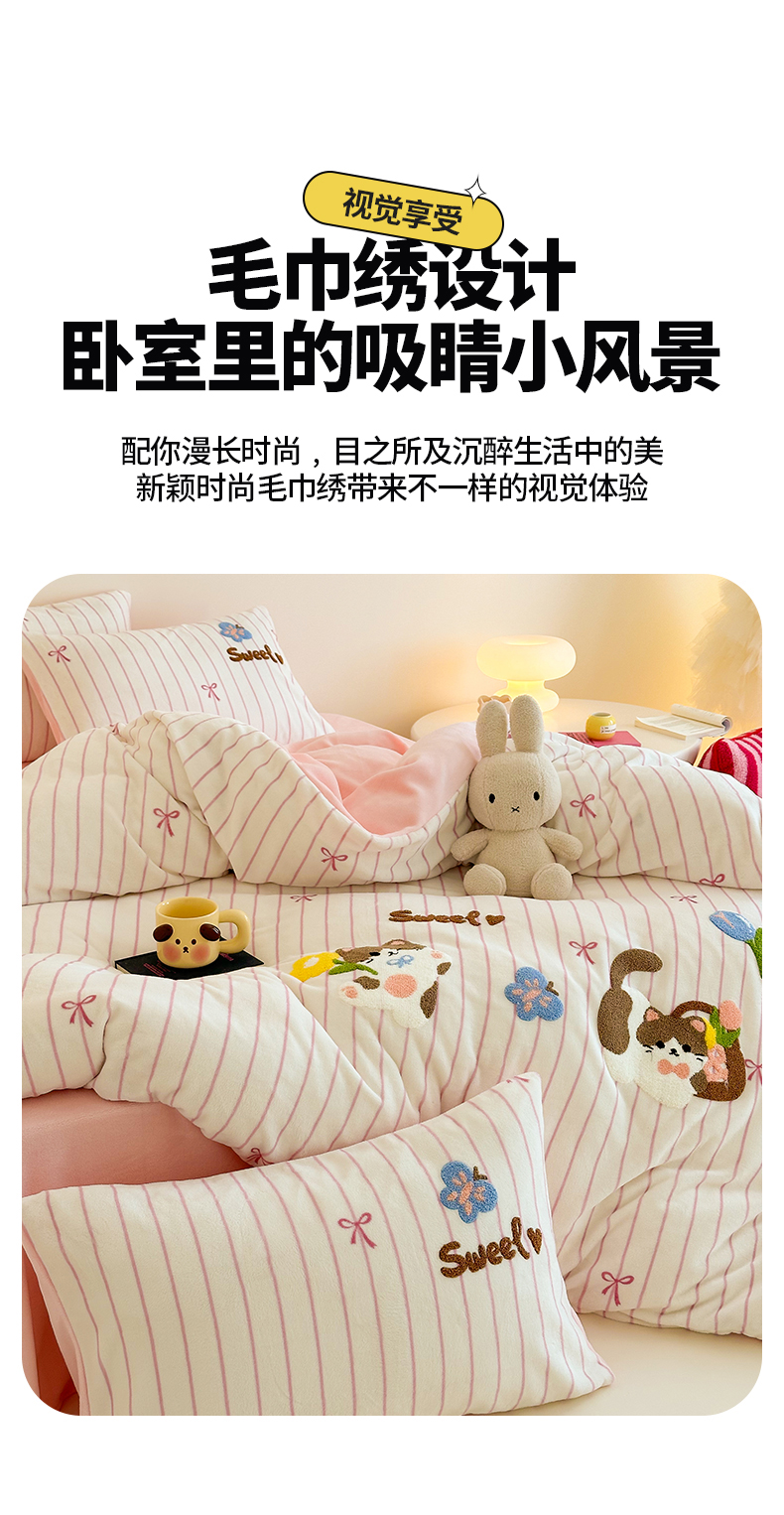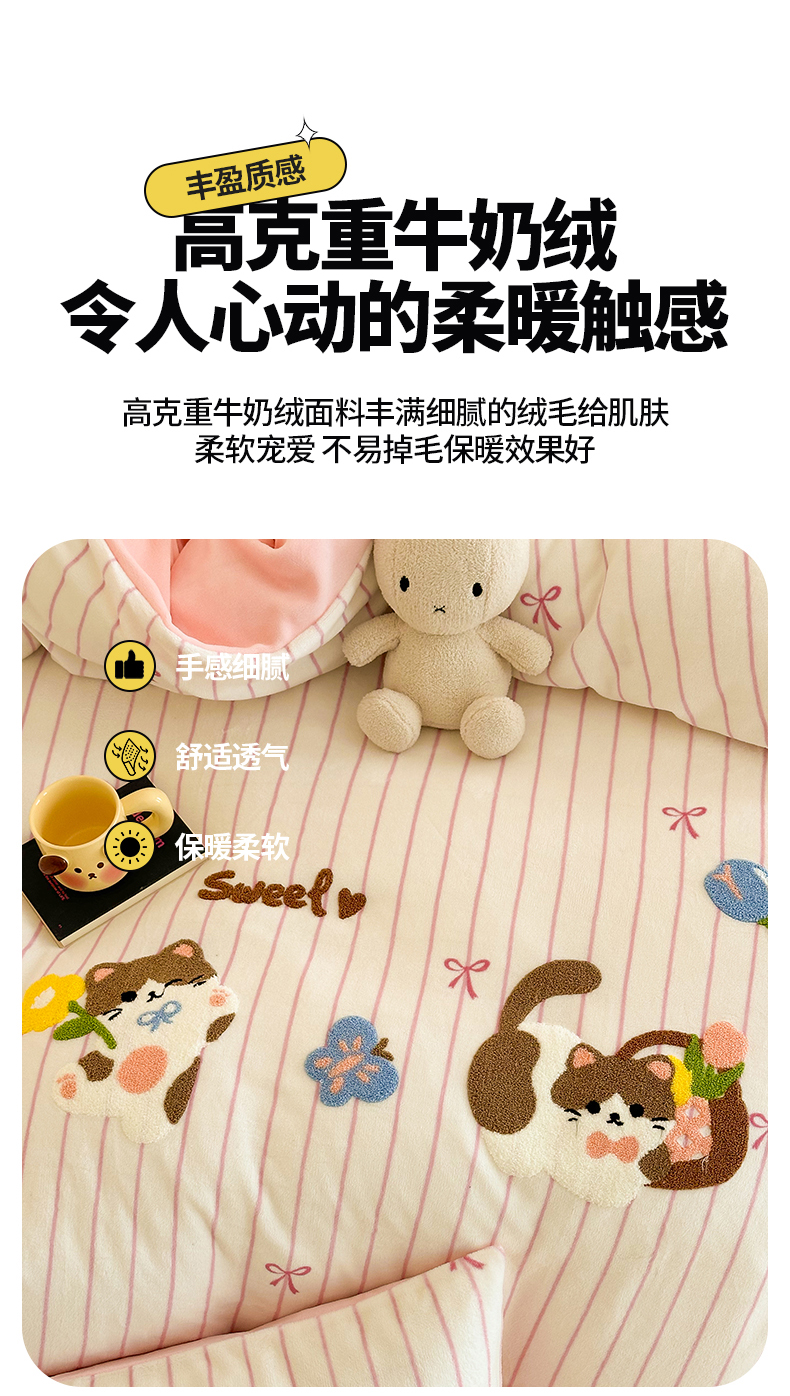 商品名称:沐棉家居 2024新款高克重条纹牛奶绒毛巾绣四件套 小花猫-粉