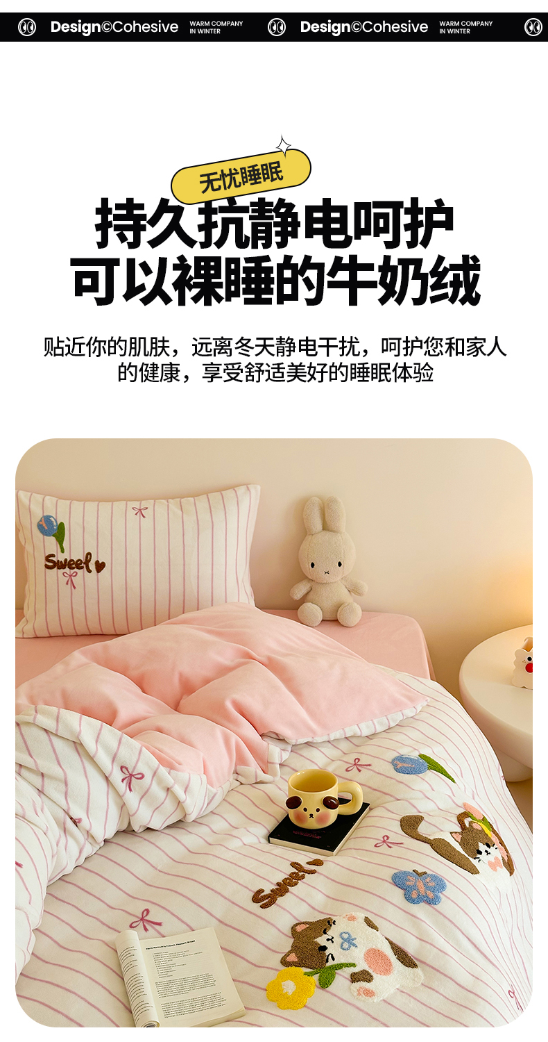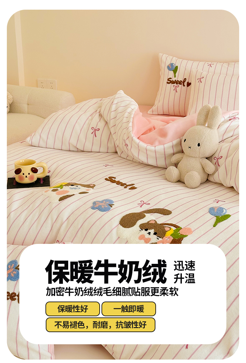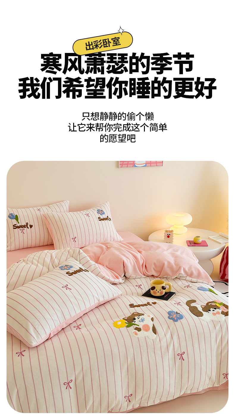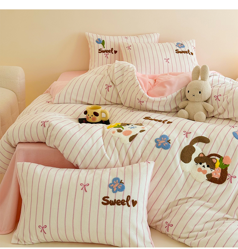 商品名称:沐棉家居 2024新款高克重条纹牛奶绒毛巾绣四件套 小花猫-粉