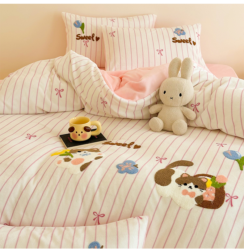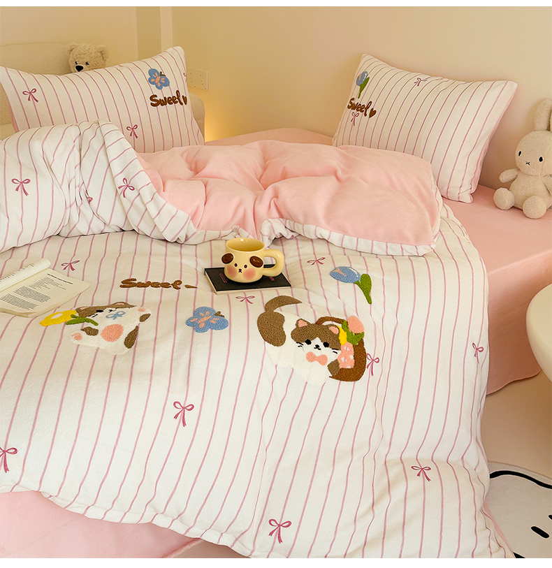沐棉家居 2024新款高克重条纹牛奶绒毛巾绣四件套 小花猫-粉