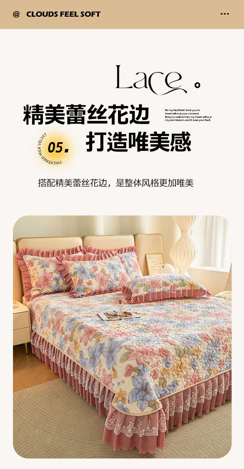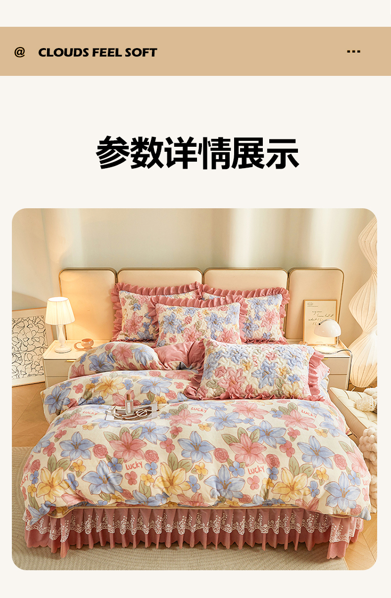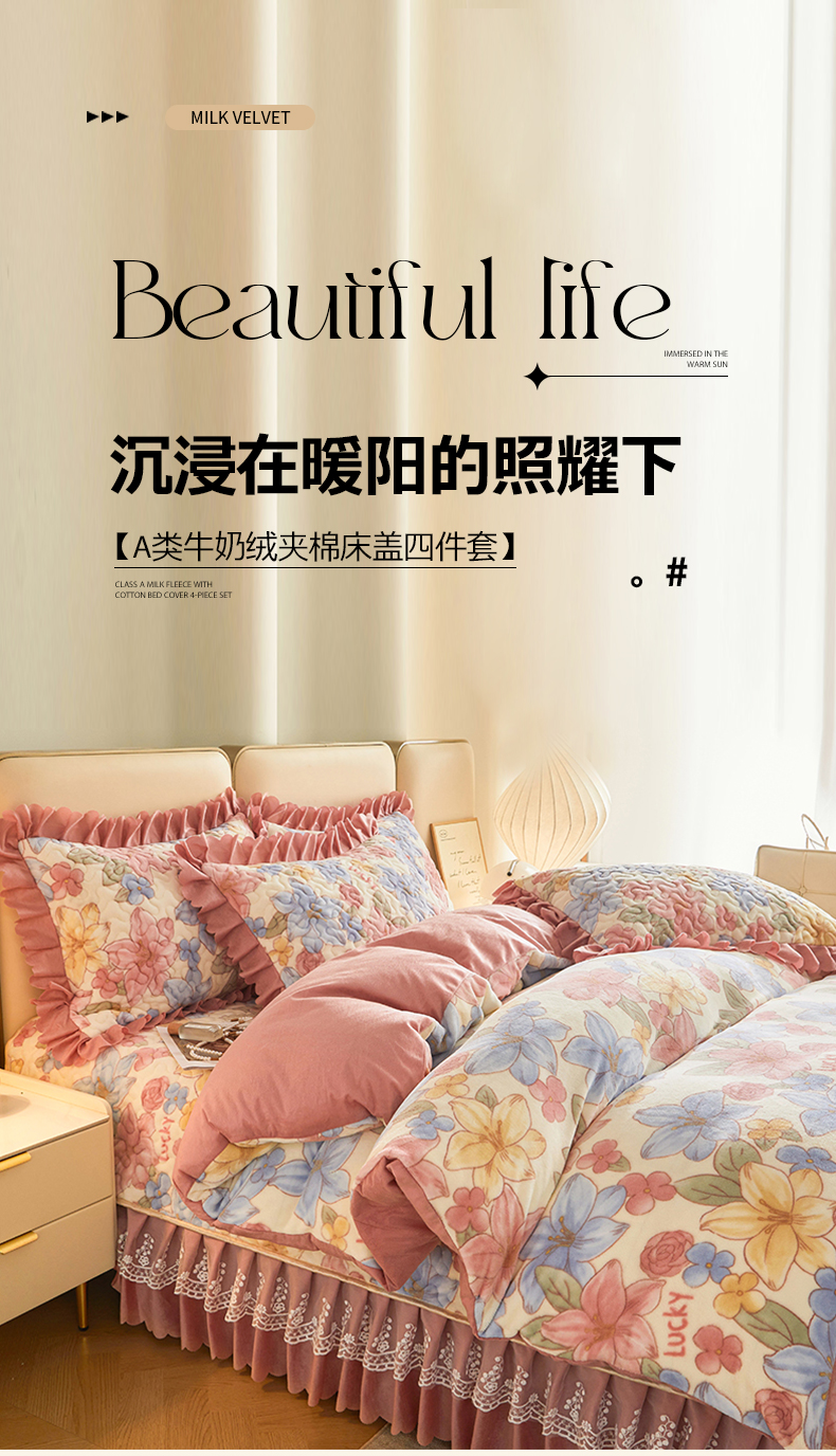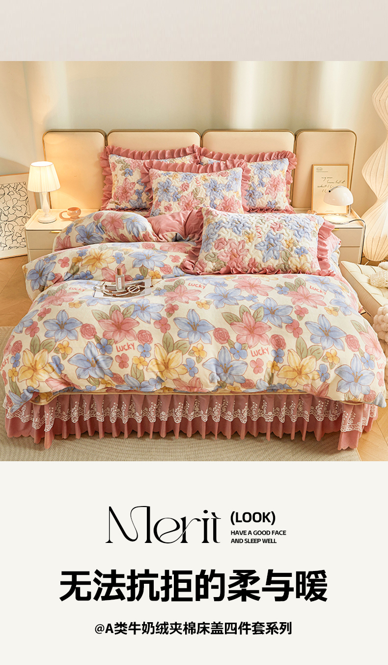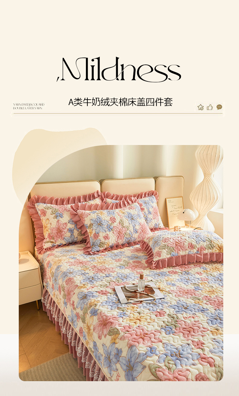 • 91家纺网 家纺一手货源 找家纺 艾裙海 2025新款高克重加厚保暖A类牛奶绒夹棉床盖系列四件套 花开物语
