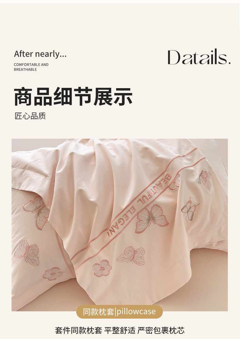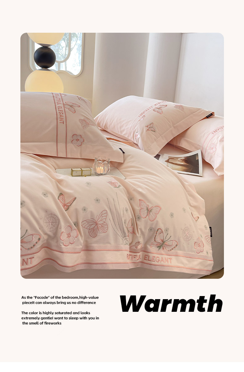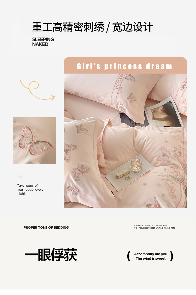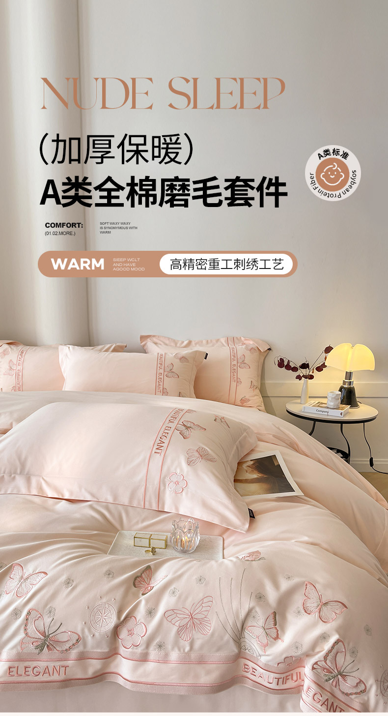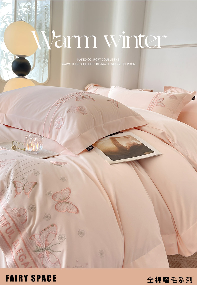 秋冬新品A类纯棉加厚磨毛四件套轻奢简约风蝴蝶床单被套床上用品晨光蝶语-白桃