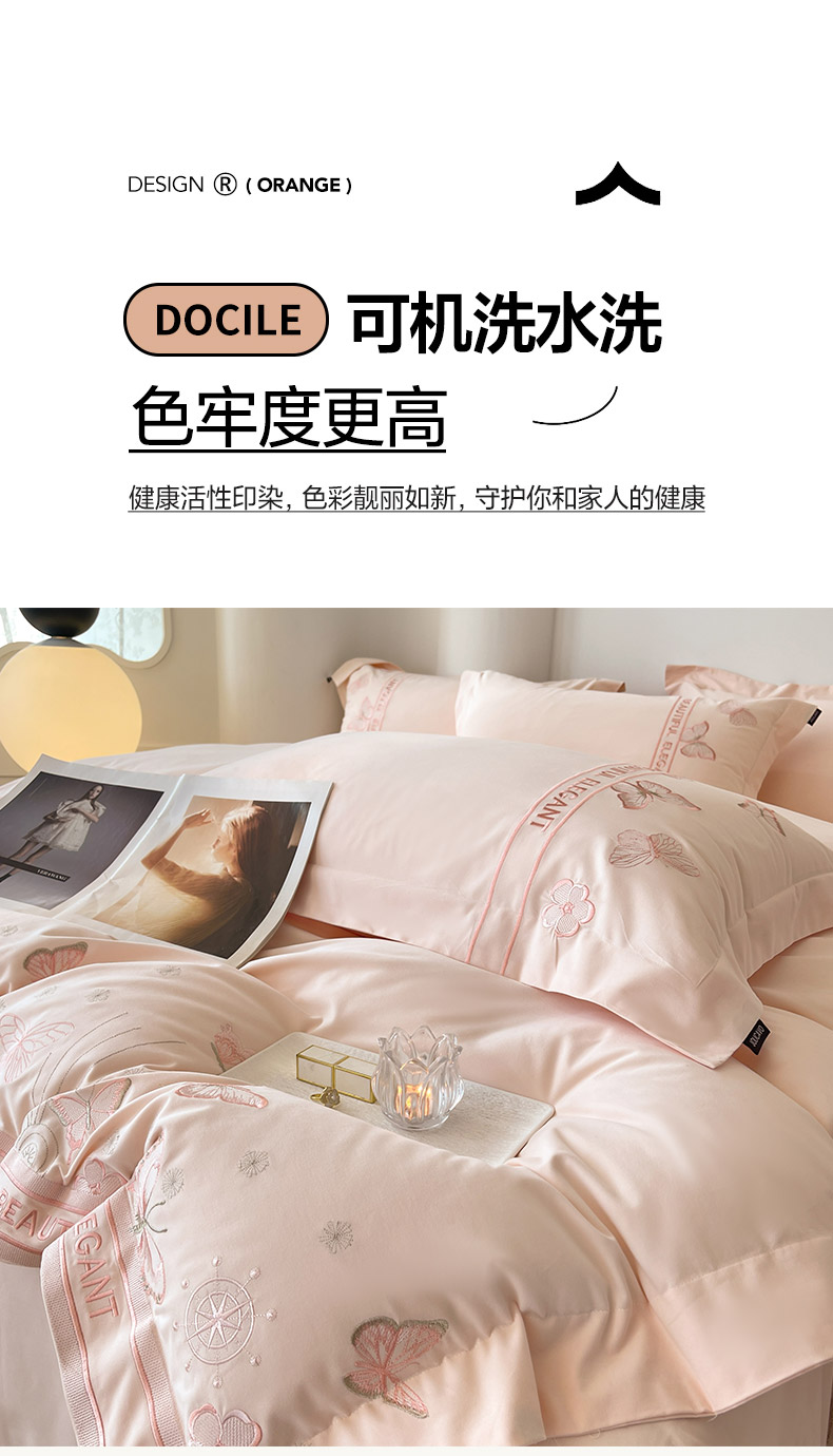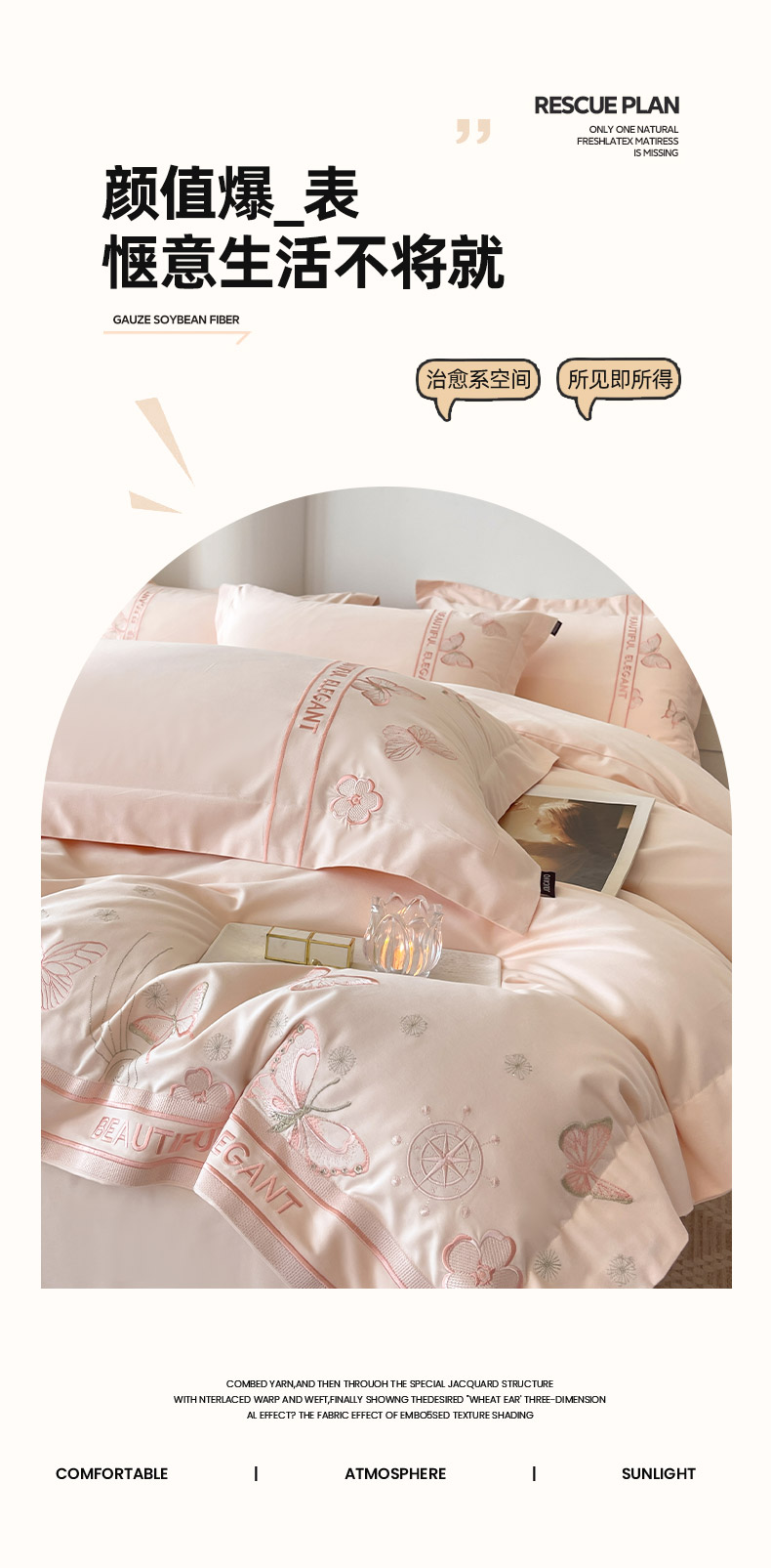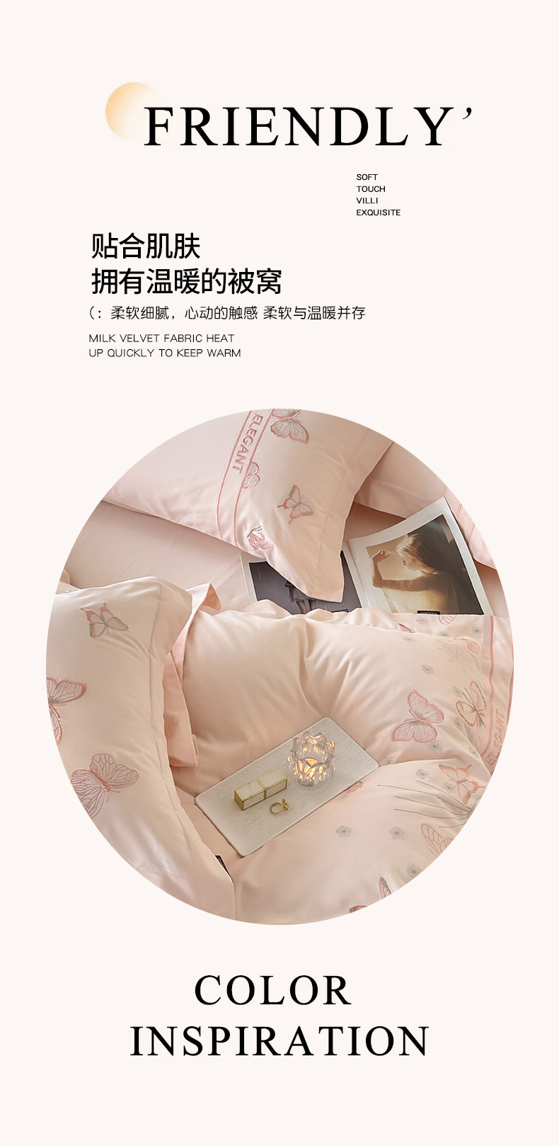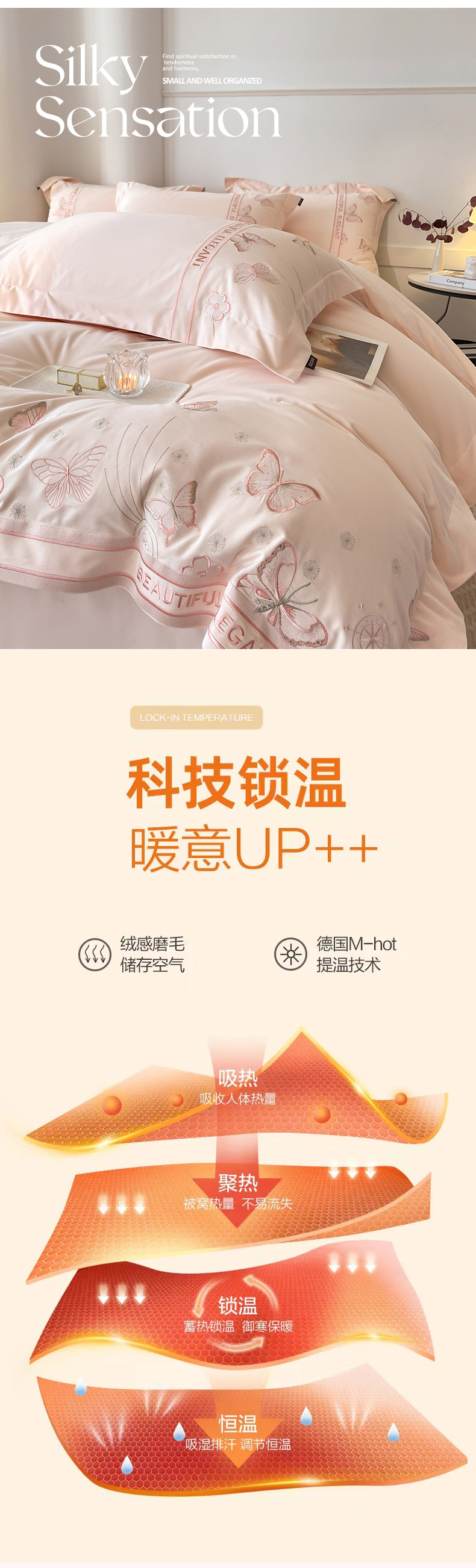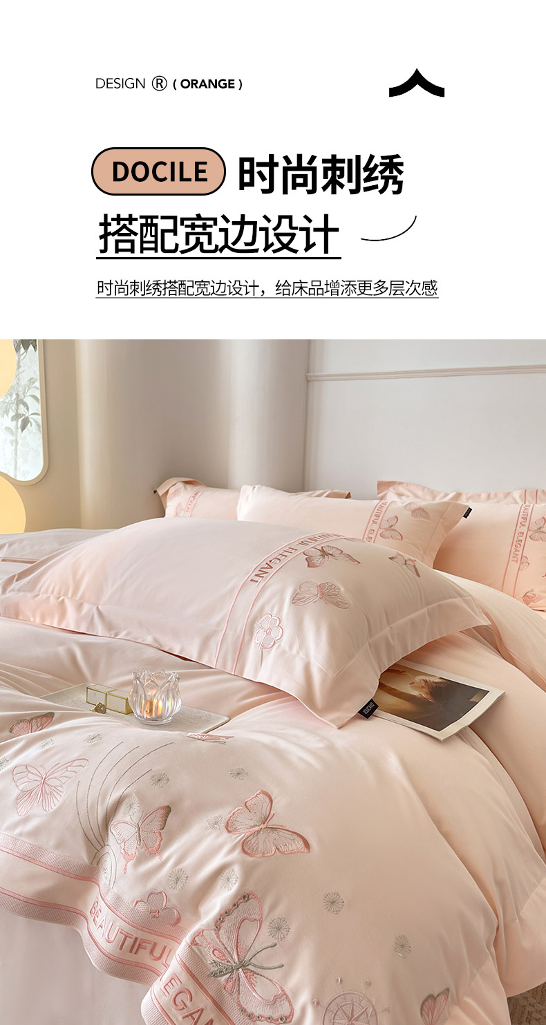 秋冬新品A类纯棉加厚磨毛四件套轻奢简约风蝴蝶床单被套床上用品晨光蝶语-白桃