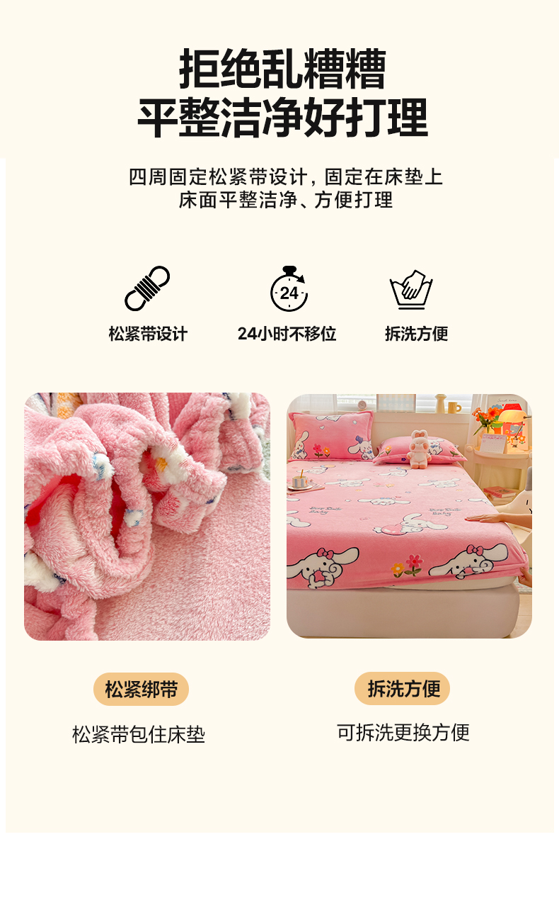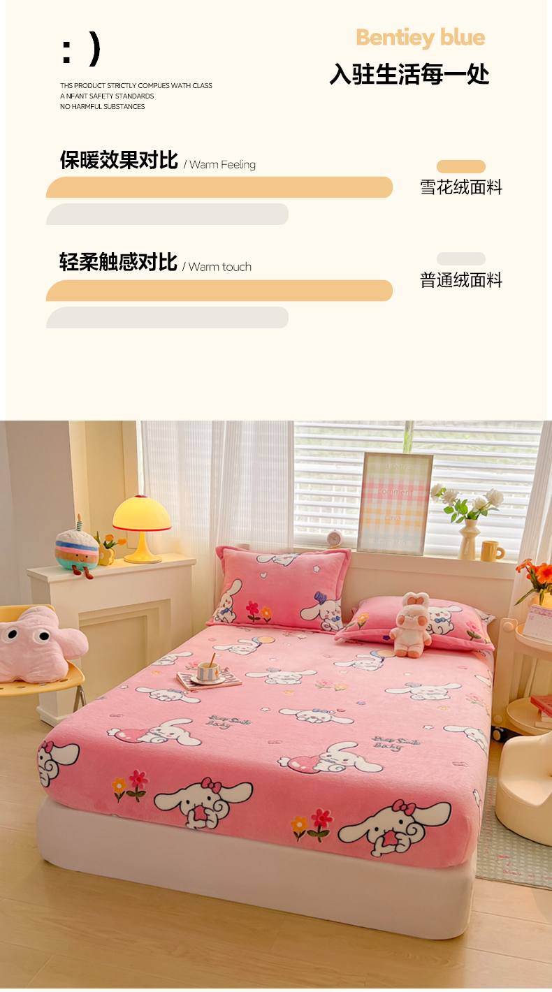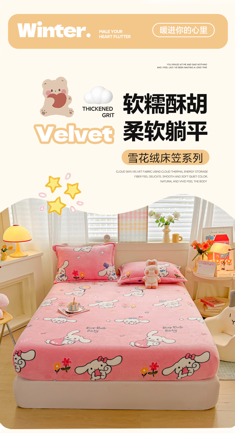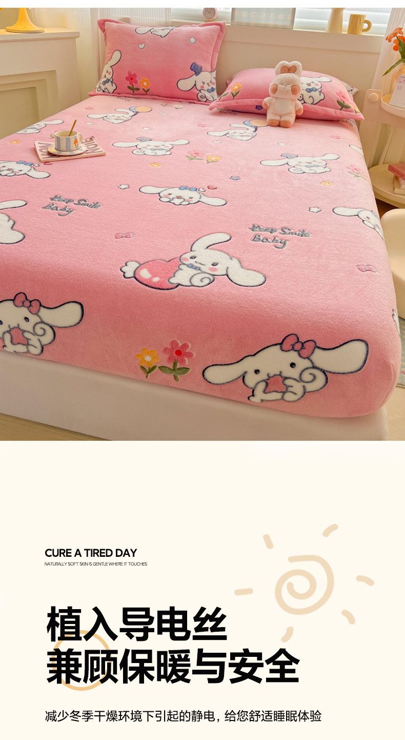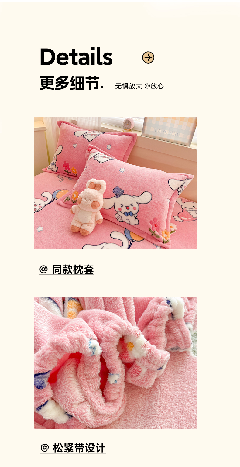 • 91家纺网 家纺一手货源 找家纺 韩巢家纺 2024新款加厚雪花绒卡通印花保暖牛奶绒珊瑚绒床笠三件套 大耳朵兔