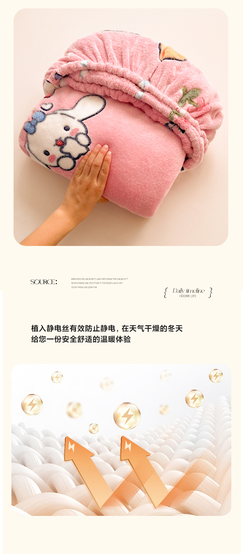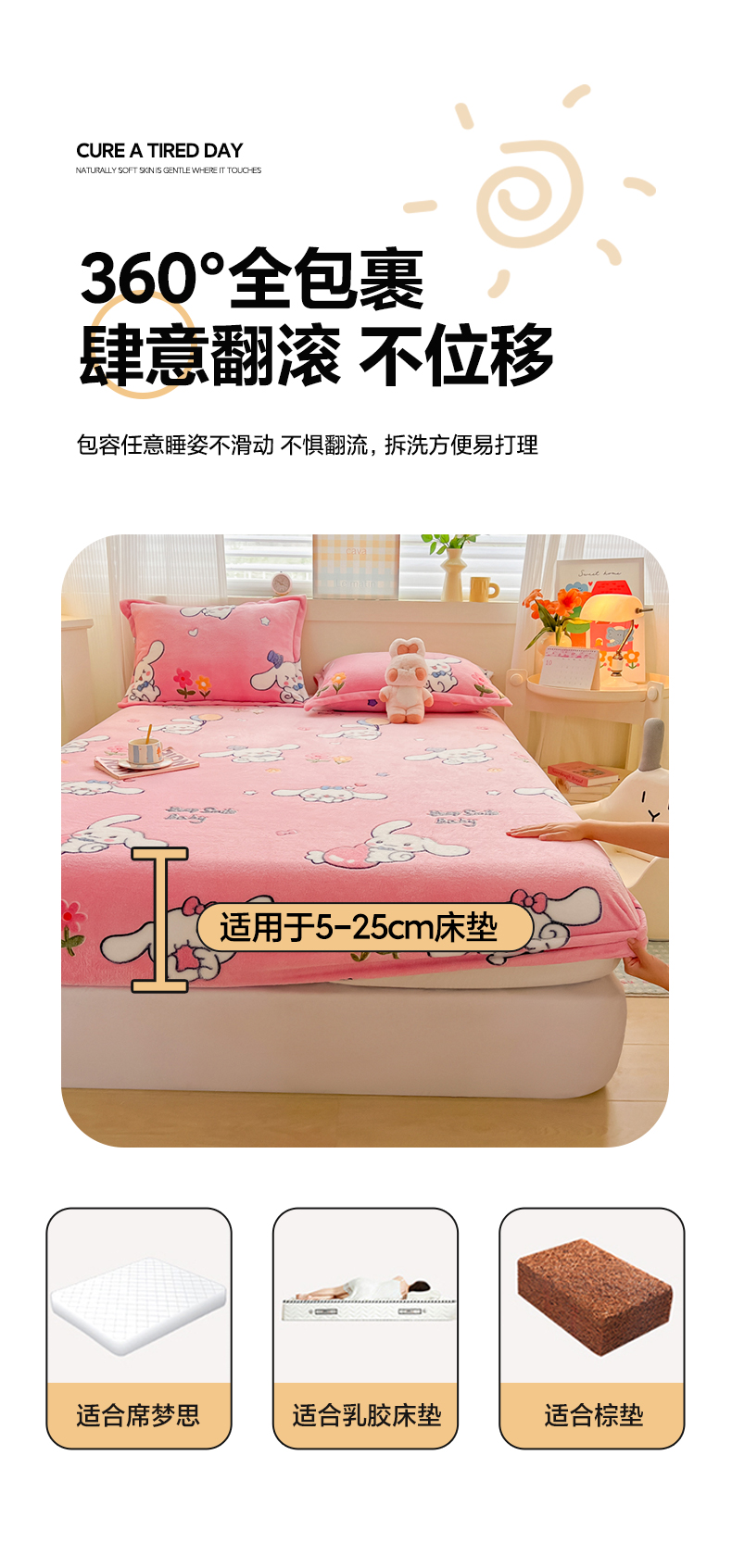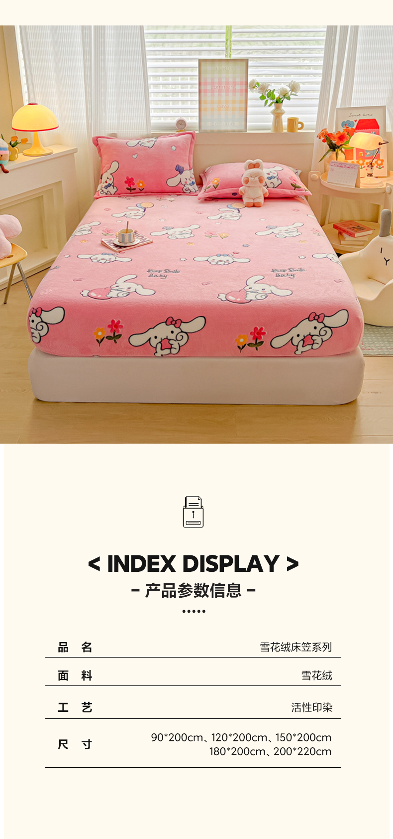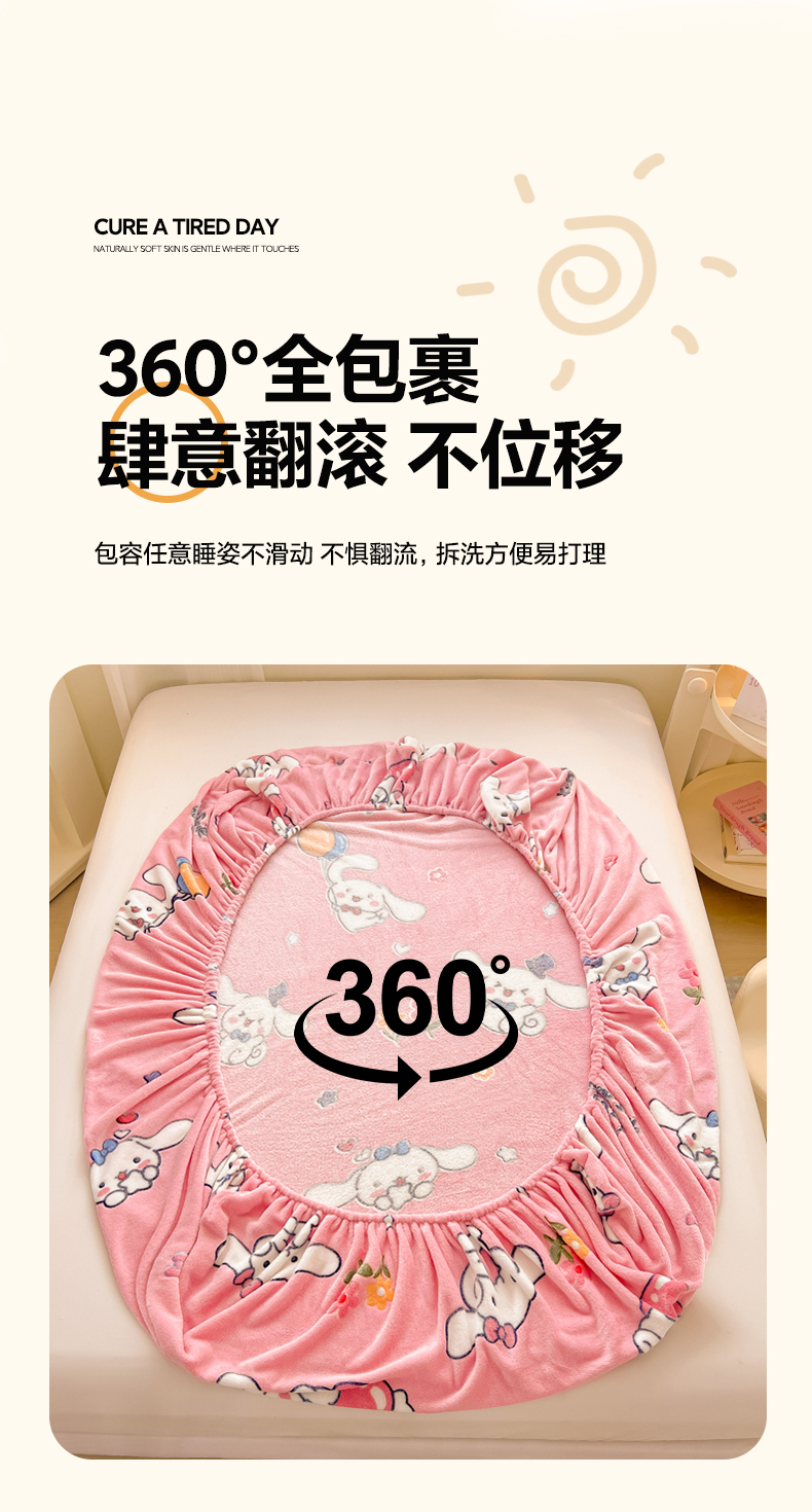 • 91家纺网 家纺一手货源 找家纺 韩巢家纺 2024新款加厚雪花绒卡通印花保暖牛奶绒珊瑚绒床笠三件套 大耳朵兔