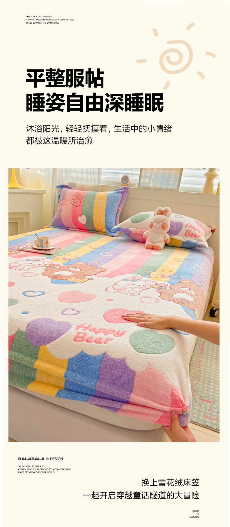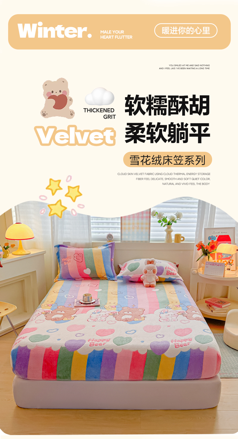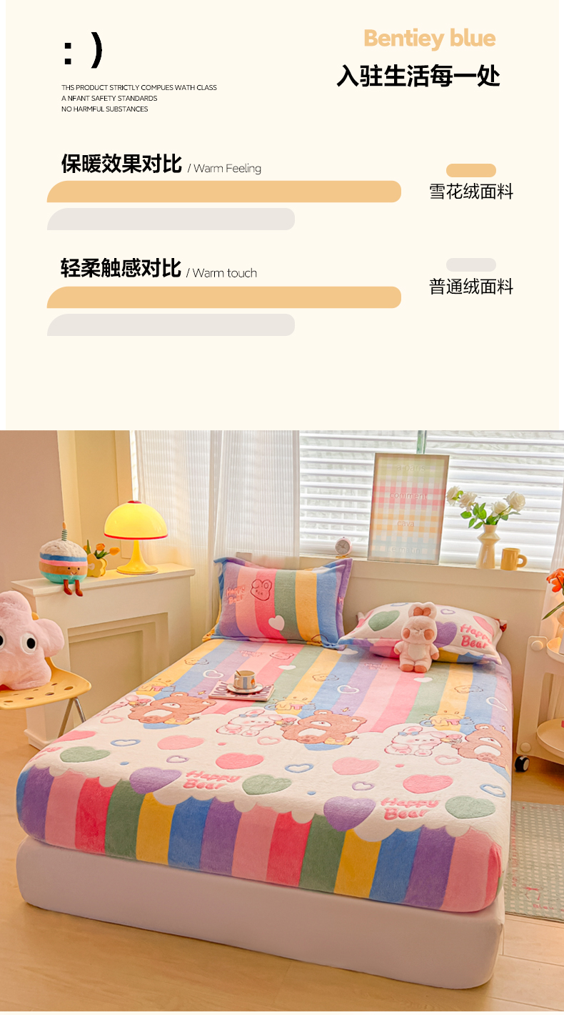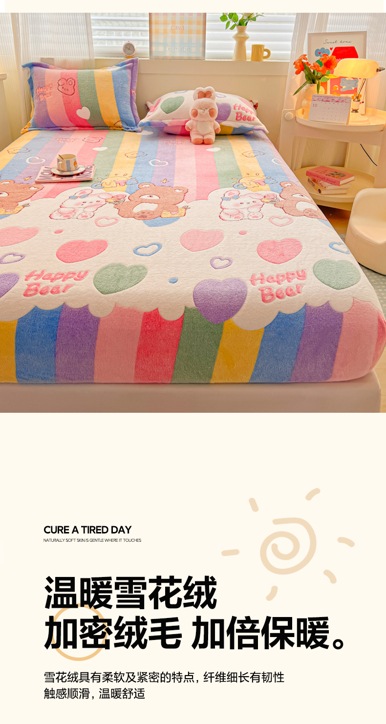 • 91家纺网 家纺一手货源 找家纺 韩巢家纺 2024新款加厚雪花绒卡通印花保暖牛奶绒珊瑚绒床笠三件套 七彩