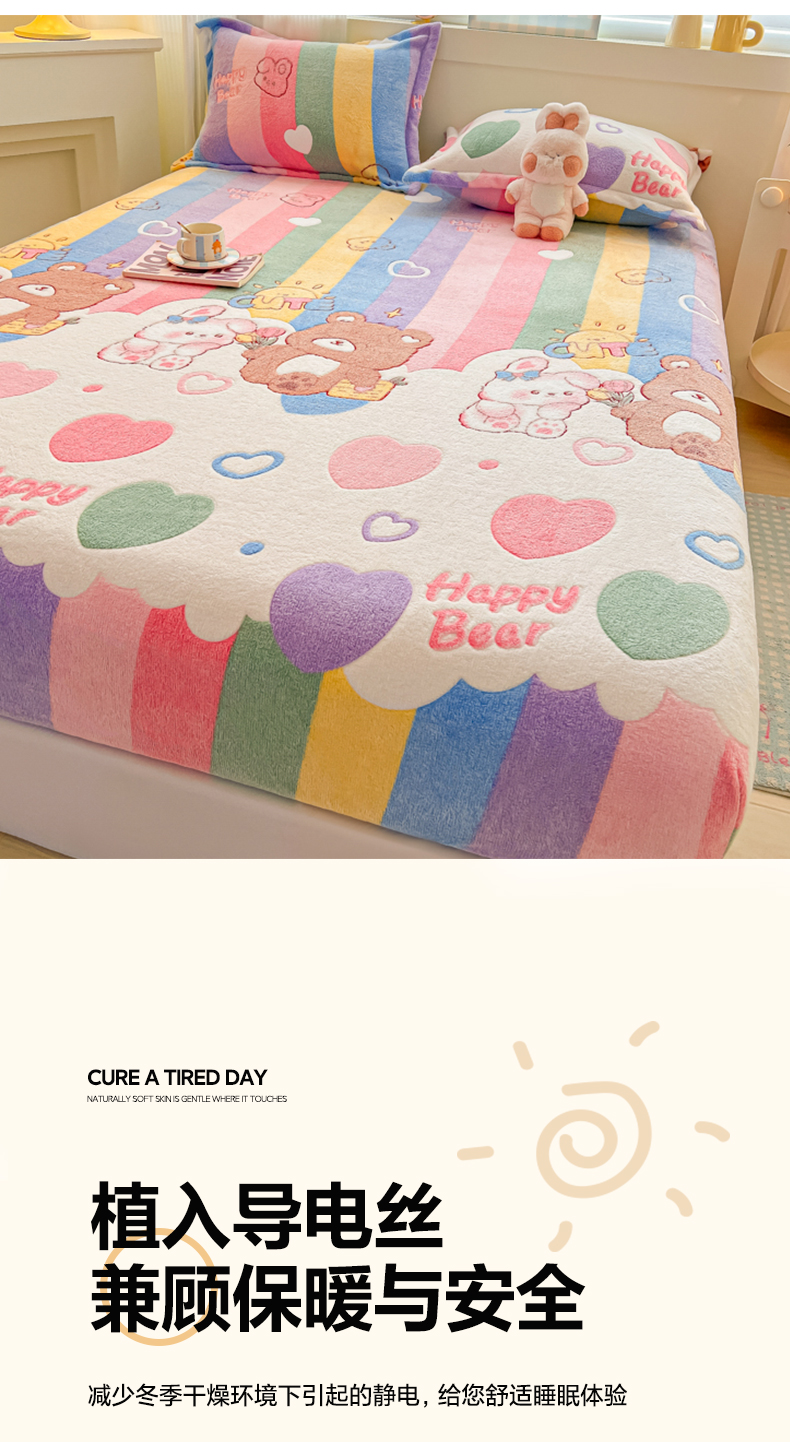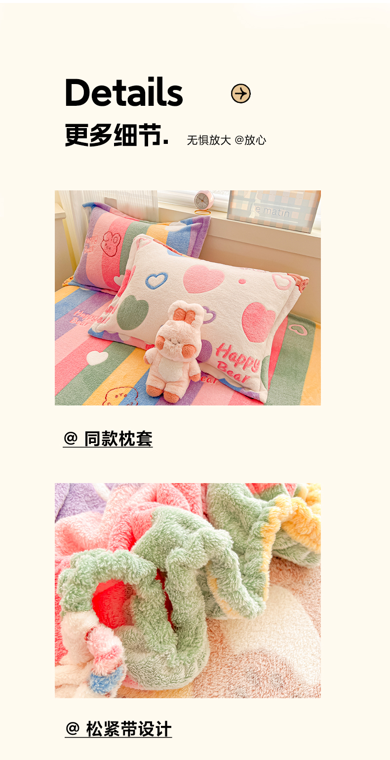 韩巢家纺 2024新款加厚雪花绒卡通印花保暖牛奶绒珊瑚绒床笠三件套 七彩