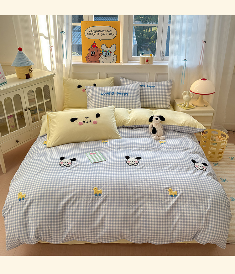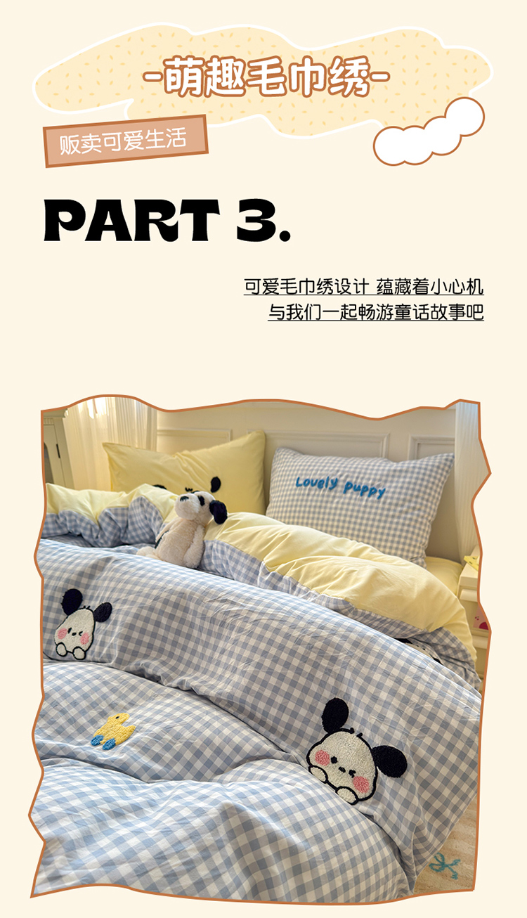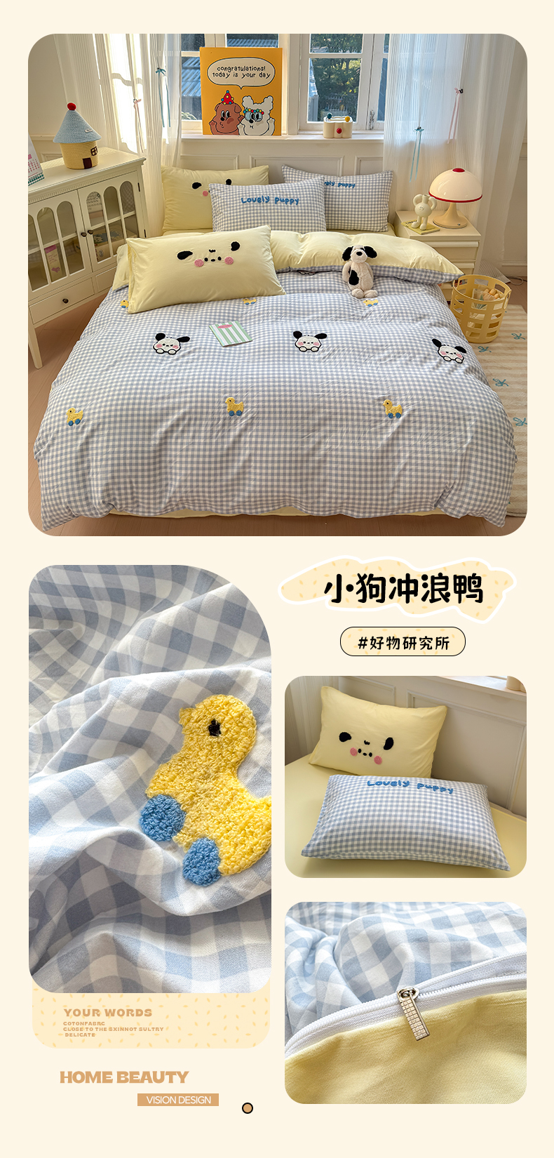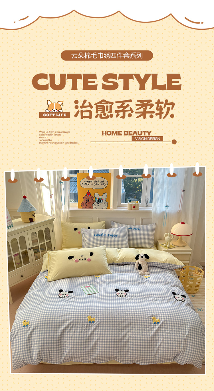 当前位置: 91家纺网 > 商品网购 > 床品套件 > 四件套 > 其它四件套 > 罗亿家纺 2025新款韩版糯糯棉(110克)毛巾绣四件套-场景三(提供买家秀) 小狗冲浪鸭