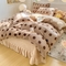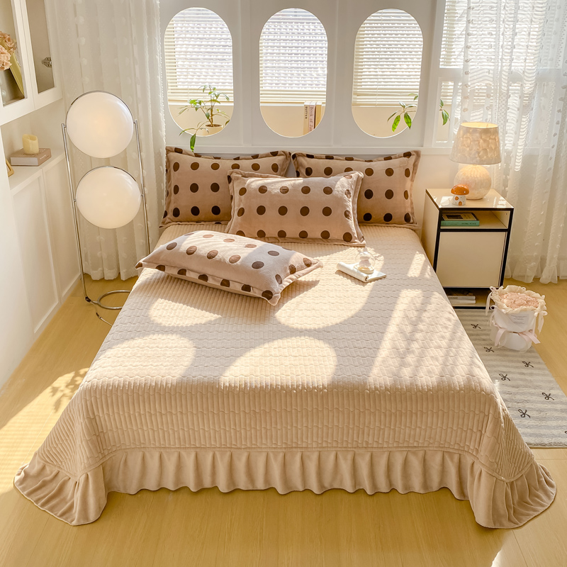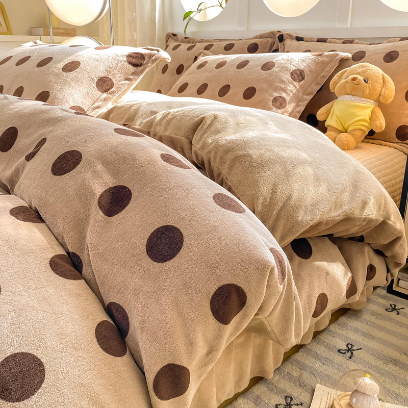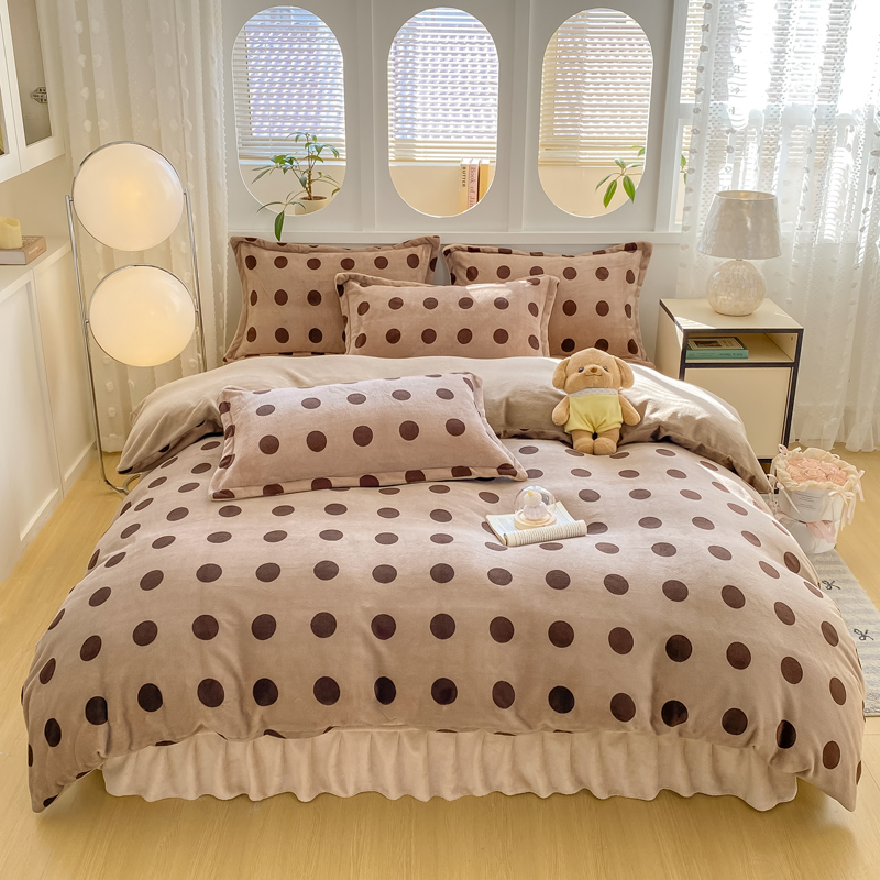 尚美 2024新款高克重印花花边牛奶绒床盖四件套咖圆点