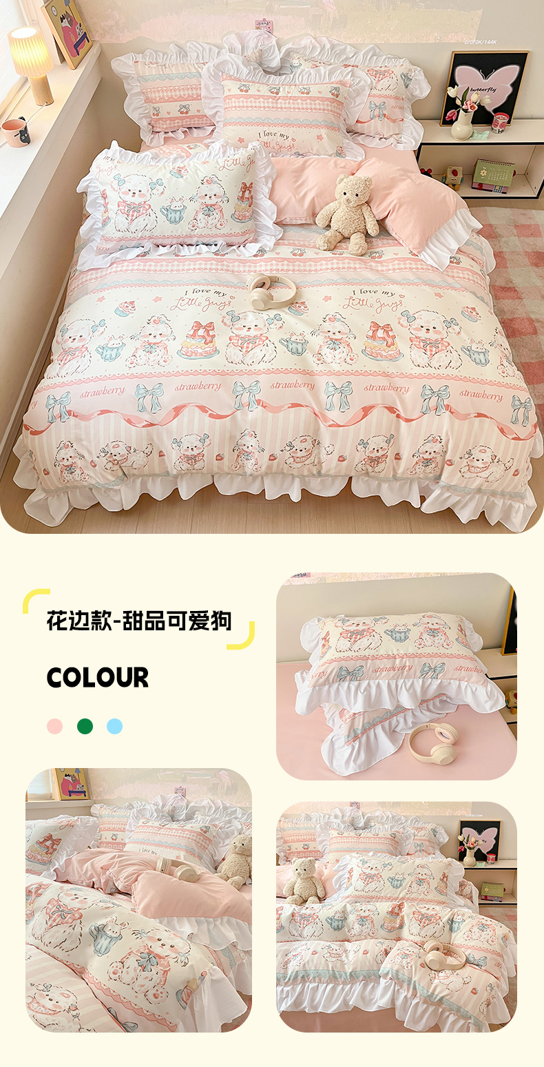 港岛妹妹 2025新款韩式INS减龄花边款卡通四件套(可提供买家秀) 花边款-甜品可爱狗