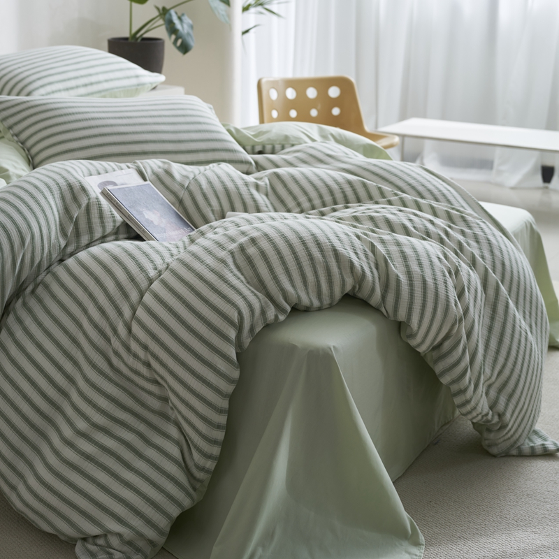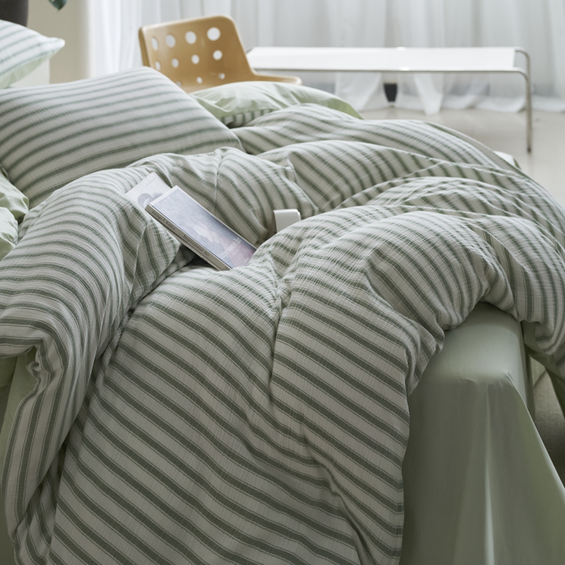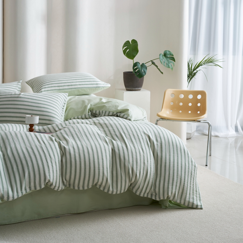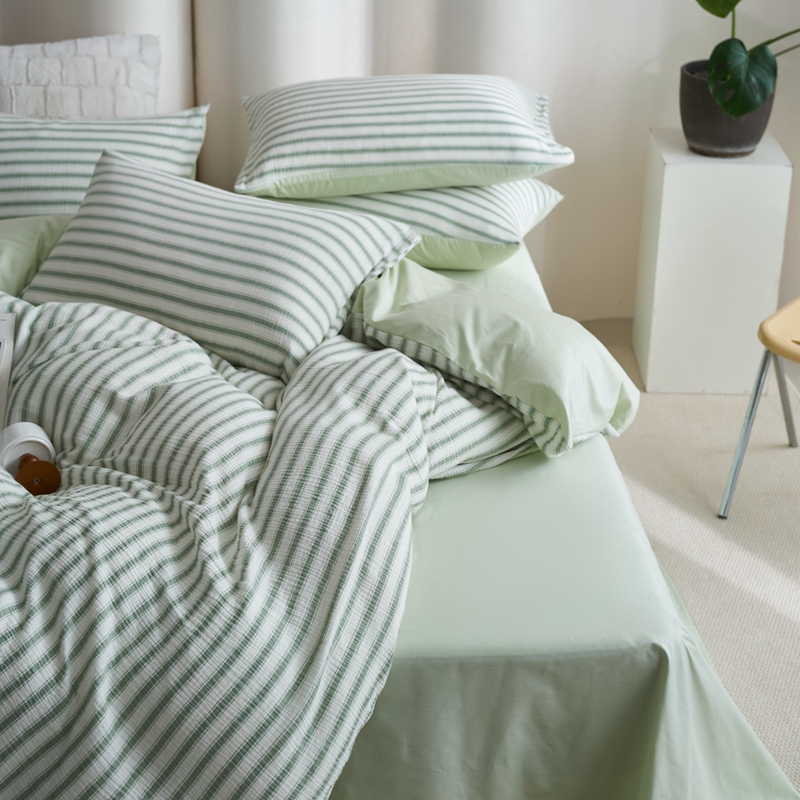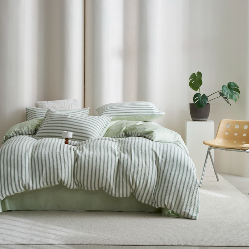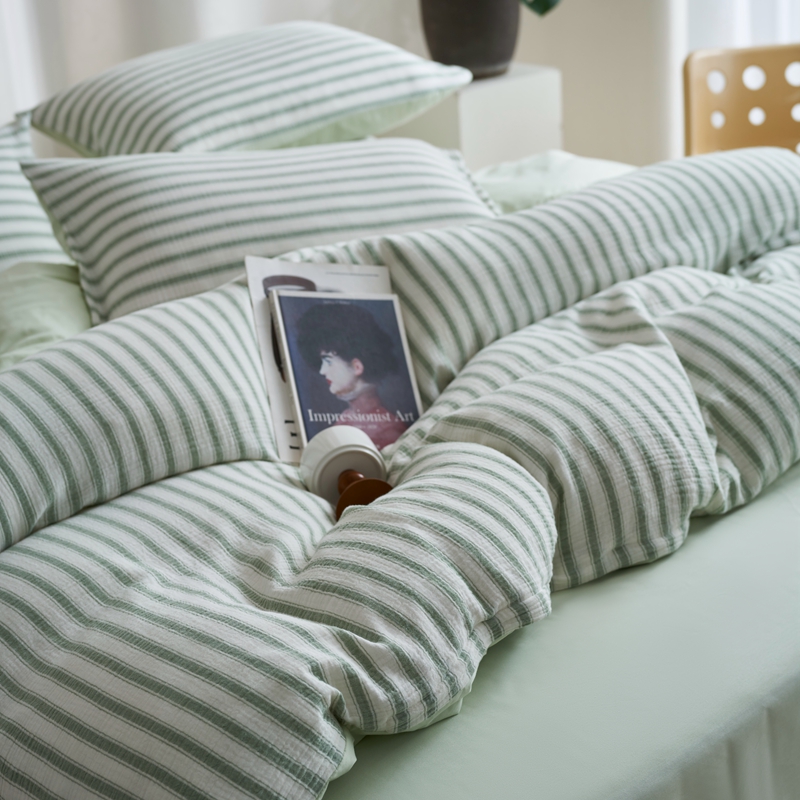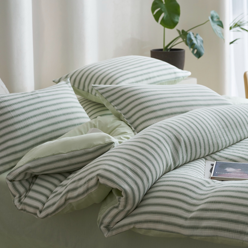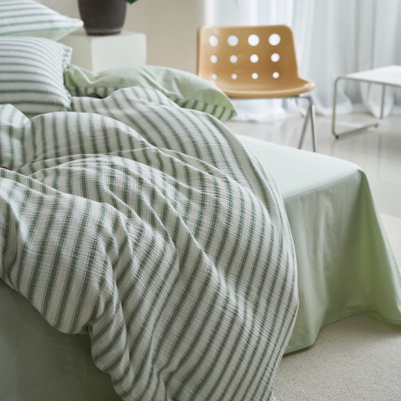当前位置: 91家纺网 > 商品网购 > 床品套件 > 四件套 > 全棉普通四件套 > 金丝鸟家纺 2025新款全棉皱皱纱系列四件套 皱皱纱条纹绿