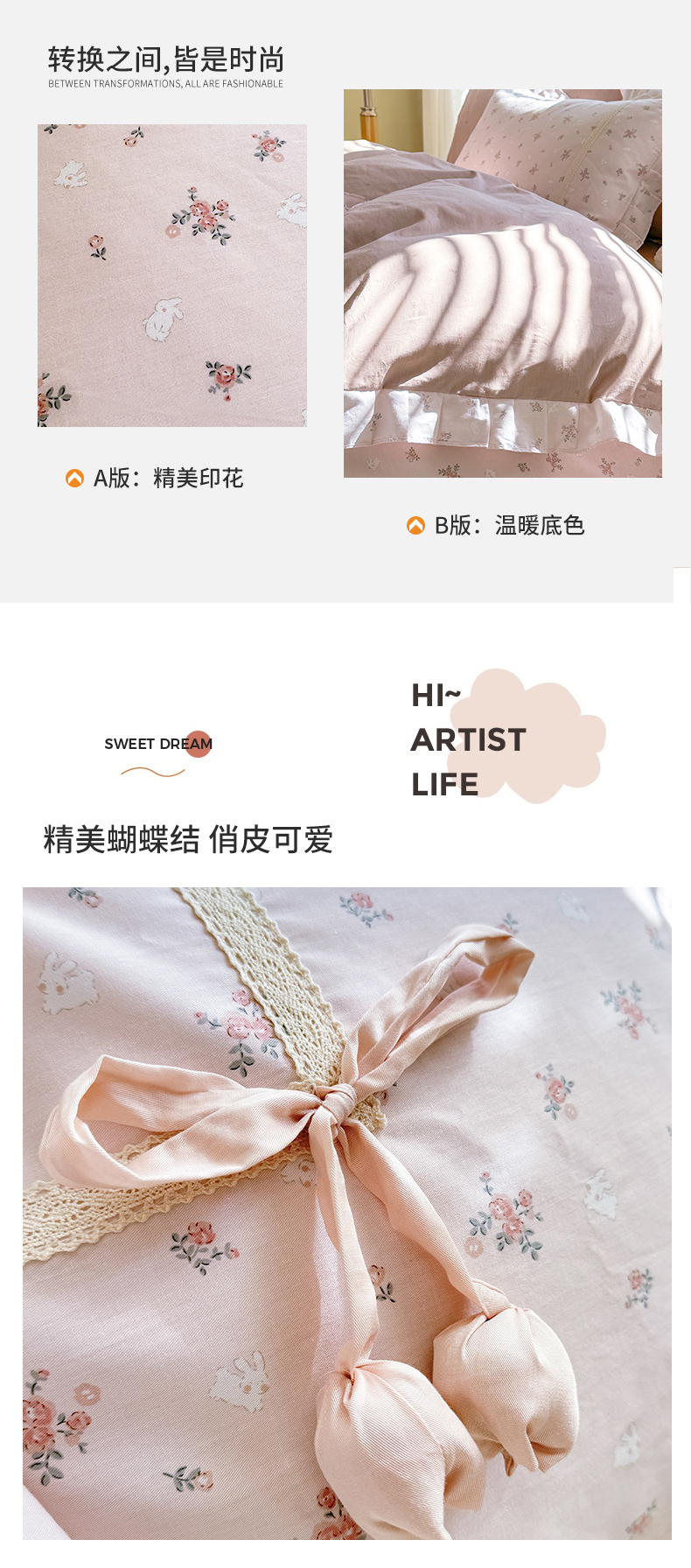 (总)艾唯希家纺 2025新款全棉纯棉色织小提花工艺四件套-开心兔系列,开心兔-粉,开心兔-灰