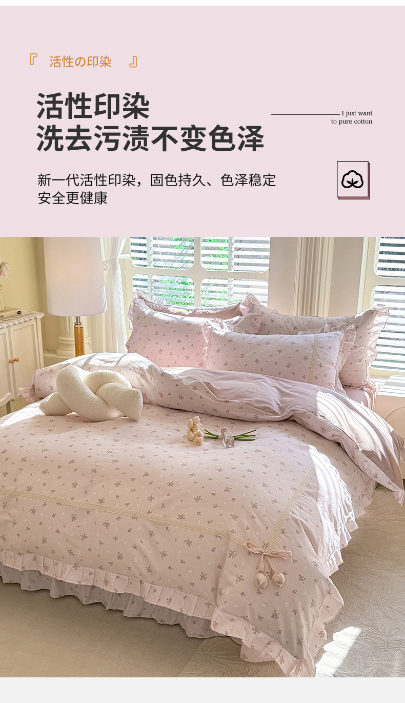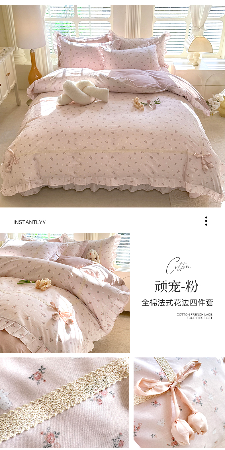 商品名称:艾唯希家纺 2025新款韩式全棉蝴蝶结工艺四件套纯棉公主风花边系列 顽宠-粉