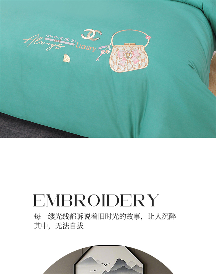 商品名称:浩情国际婚庆供货中心 2026新款100支全棉高端刺绣中式风四件套--米尔顿系列 米尔顿-翡翠绿