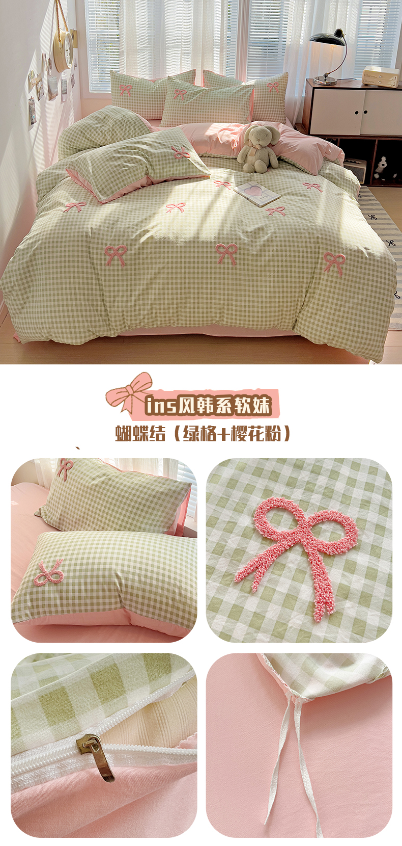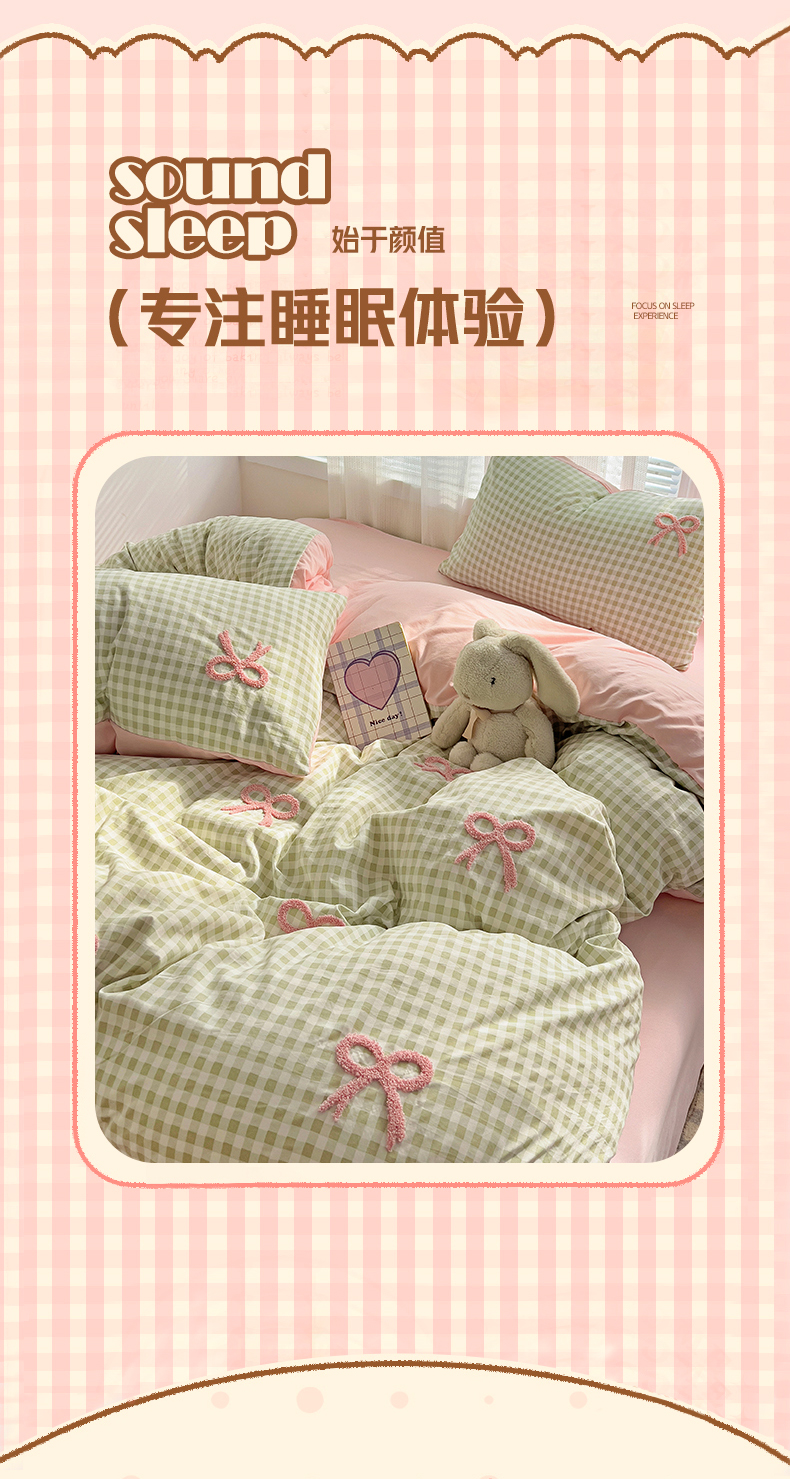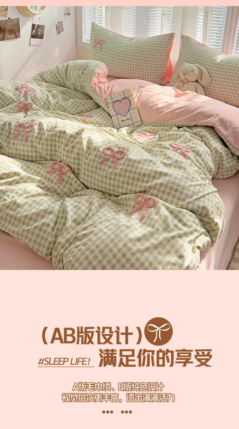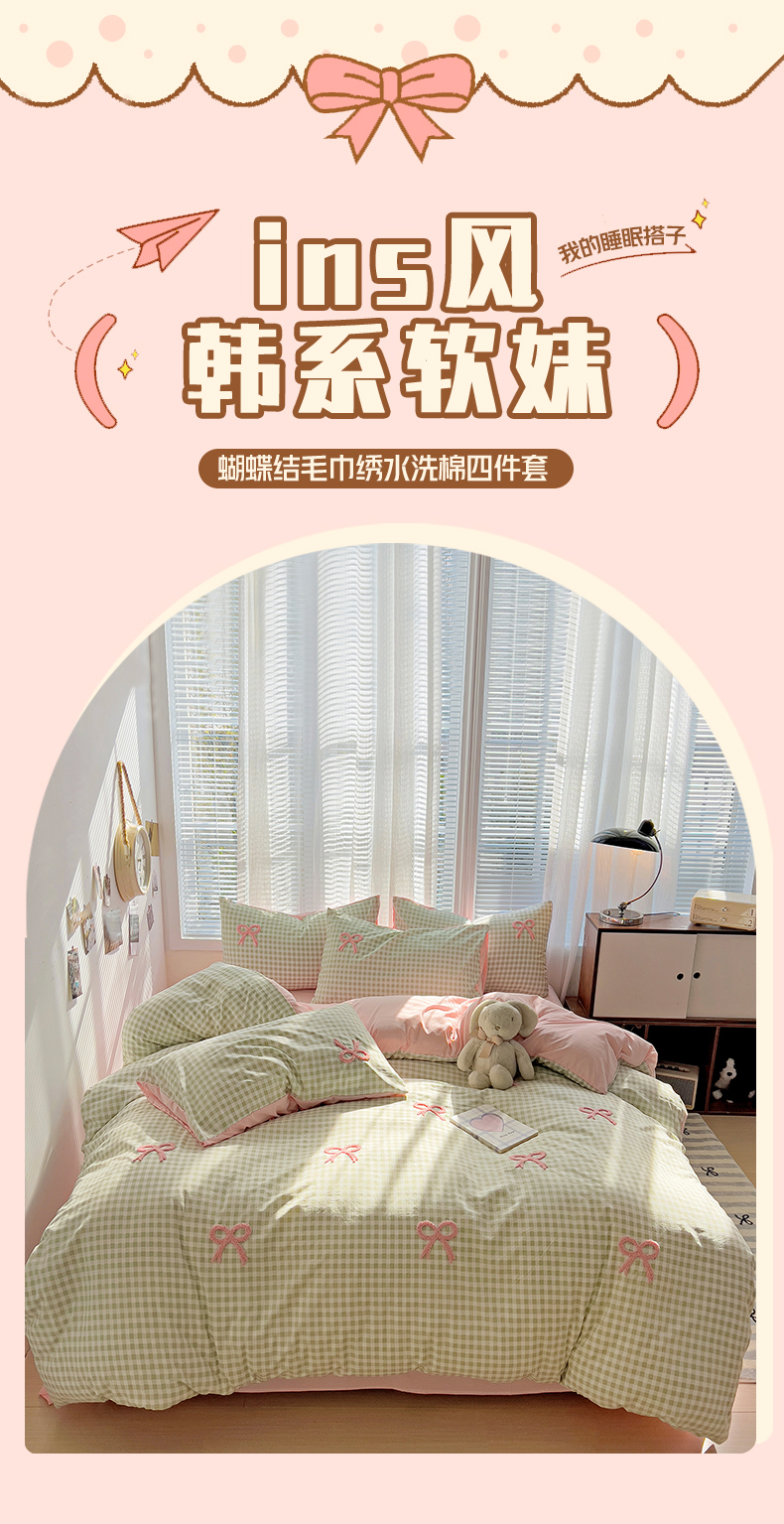 当前位置: 91家纺网 > 商品网购 > 床品套件 > 四件套 > 毛巾绣四件套 > 灰鲸2025新款ins韩系软妹风蝴蝶结毛巾绣四件套 蝴蝶结(绿格+樱花粉)
