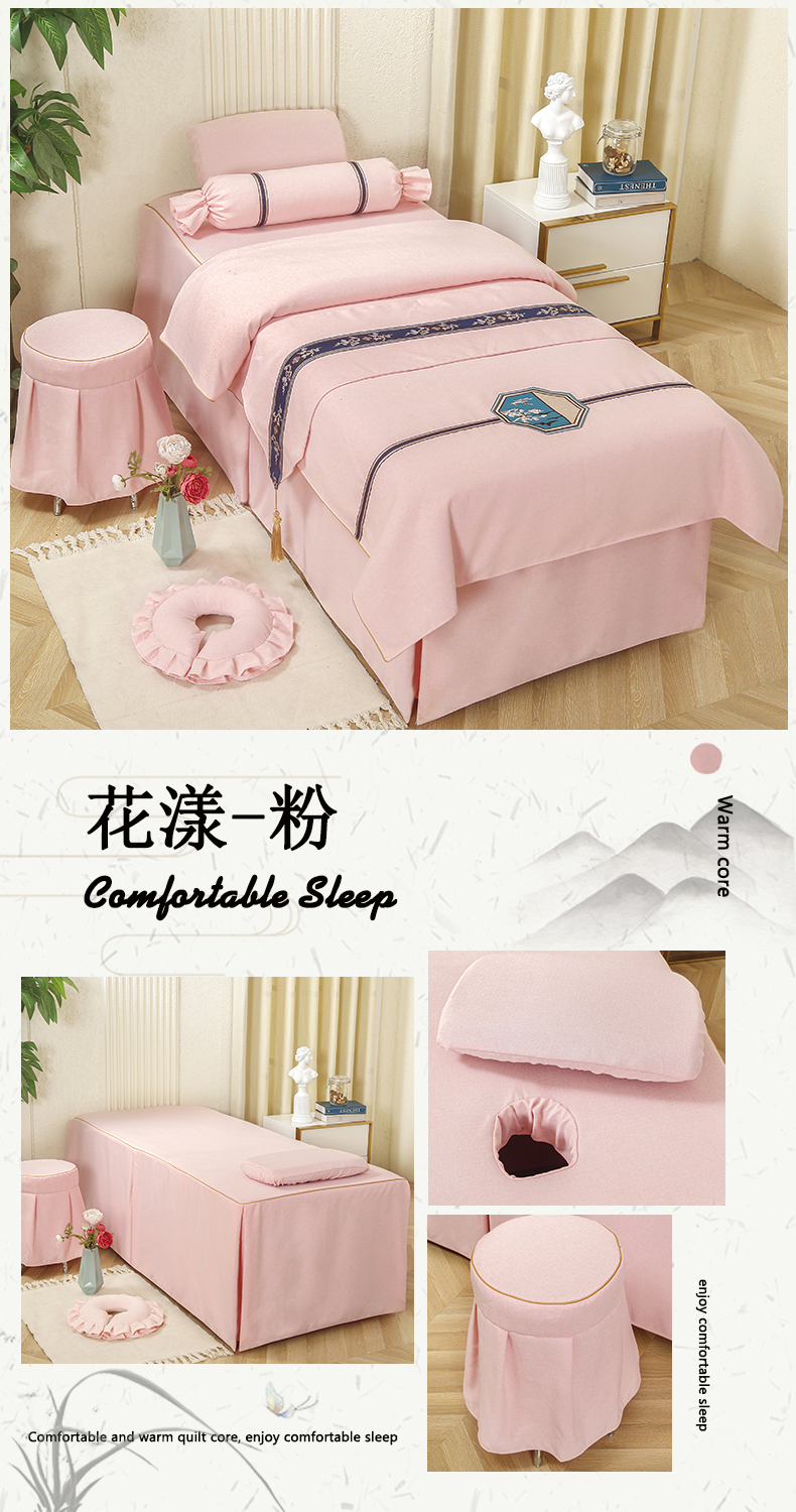 当前位置: 91家纺网 > 商品网购 > 床上用品 > 床罩 > 芙怡 2025春夏新款8023款棉麻绒贴花美 容床罩-花漾系列 花漾-粉
