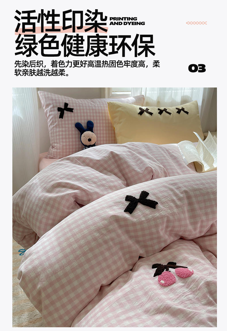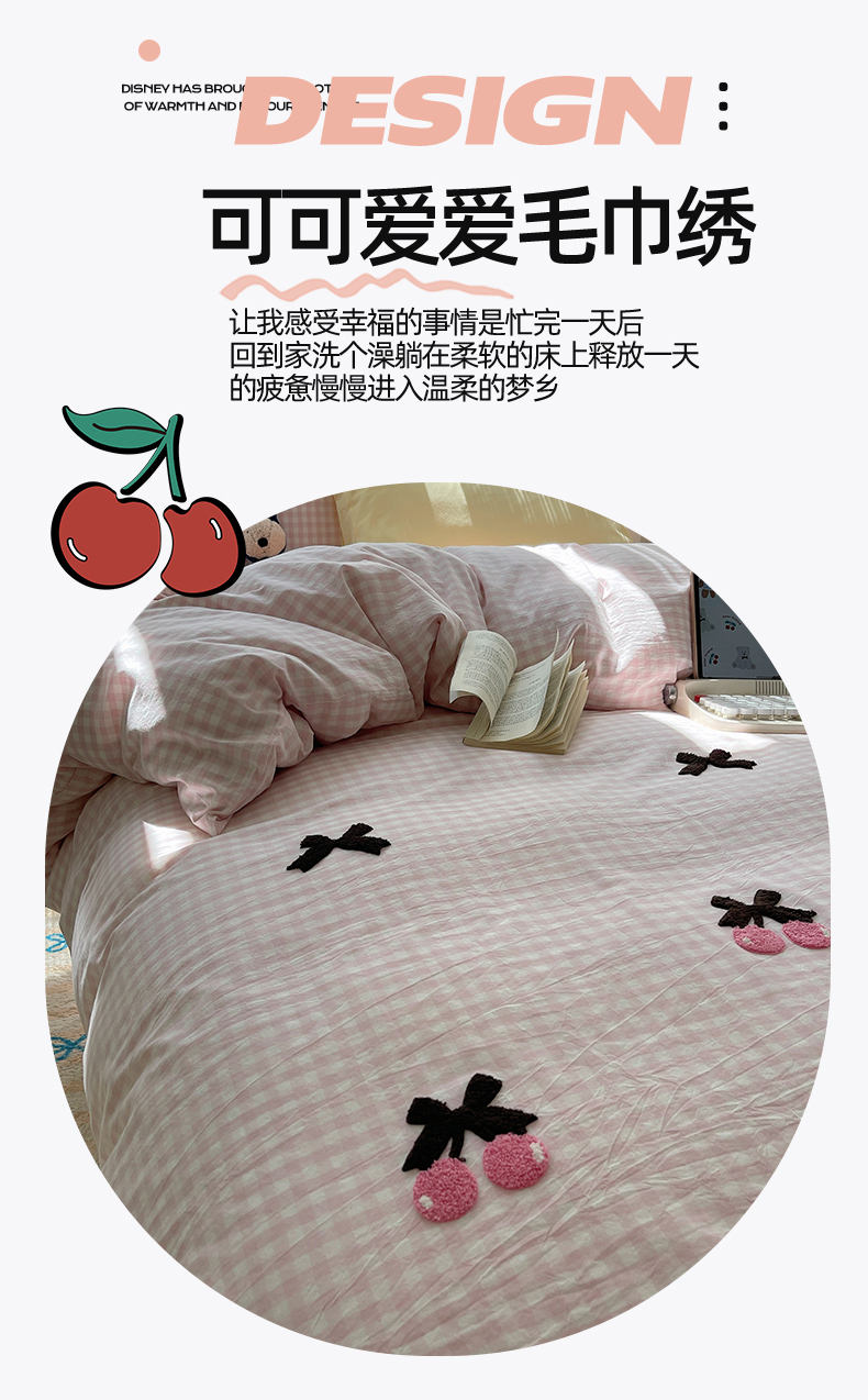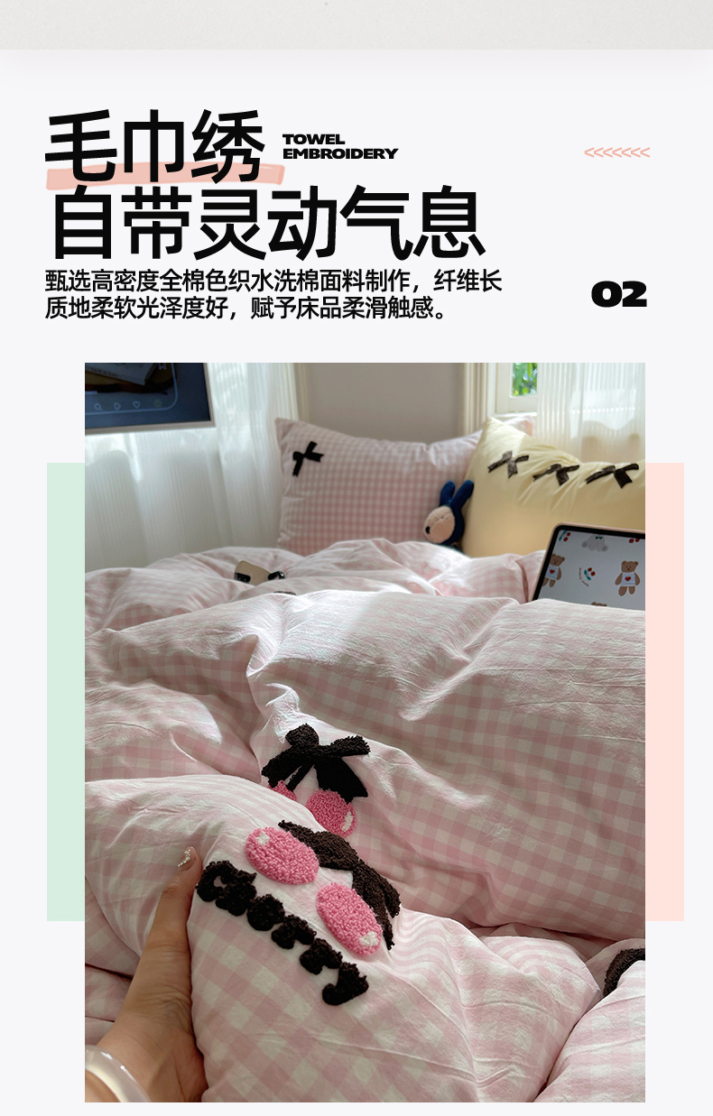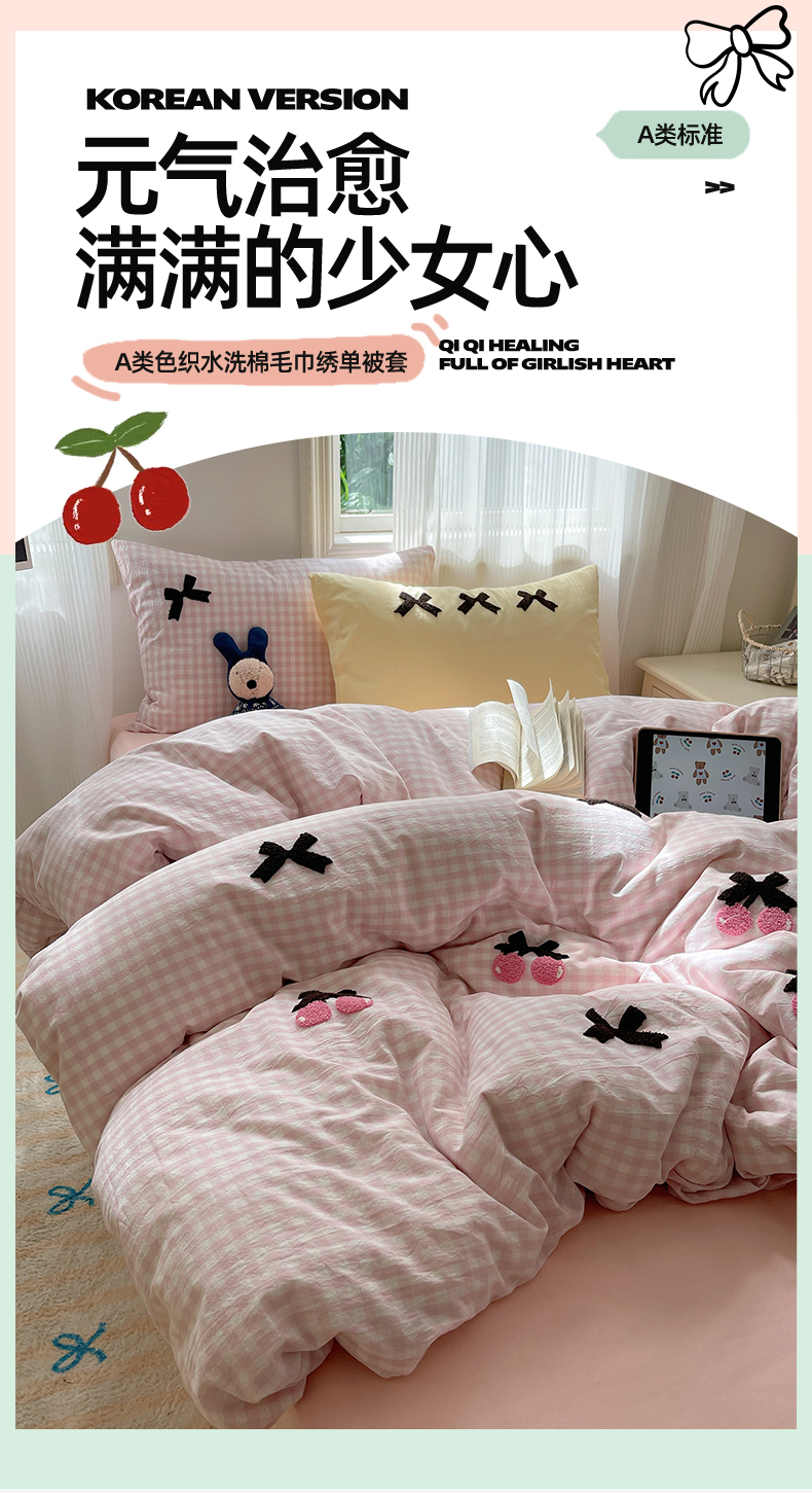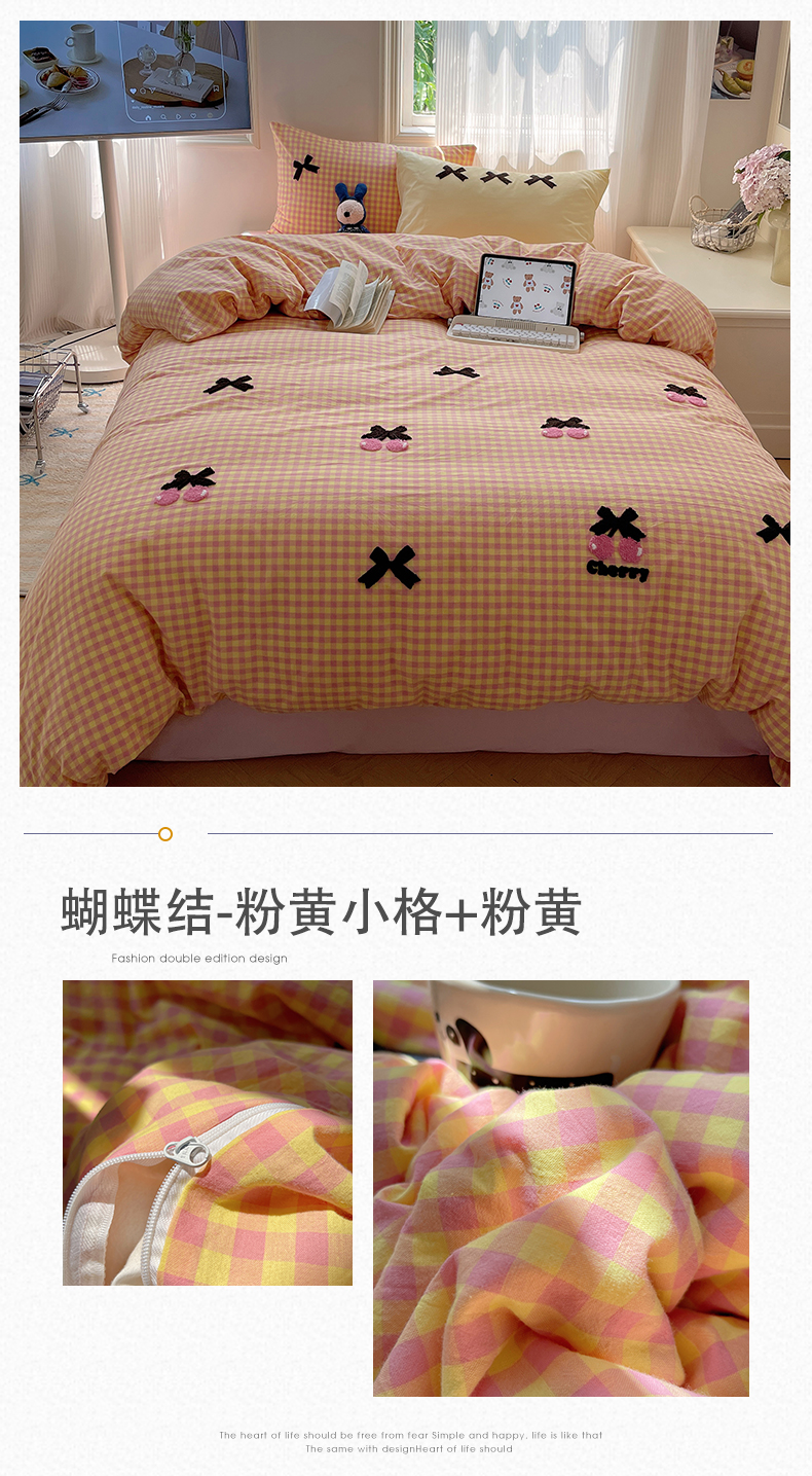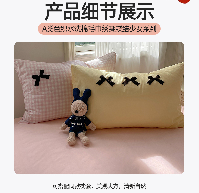 • 91家纺网 家纺一手货源 找家纺 北欧良品 2025新款A类色织水洗棉毛巾绣蝴蝶结少女系列单被套 蝴蝶结-奶油格粉+粉黄