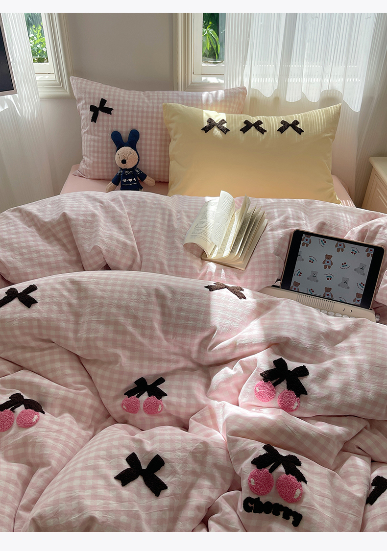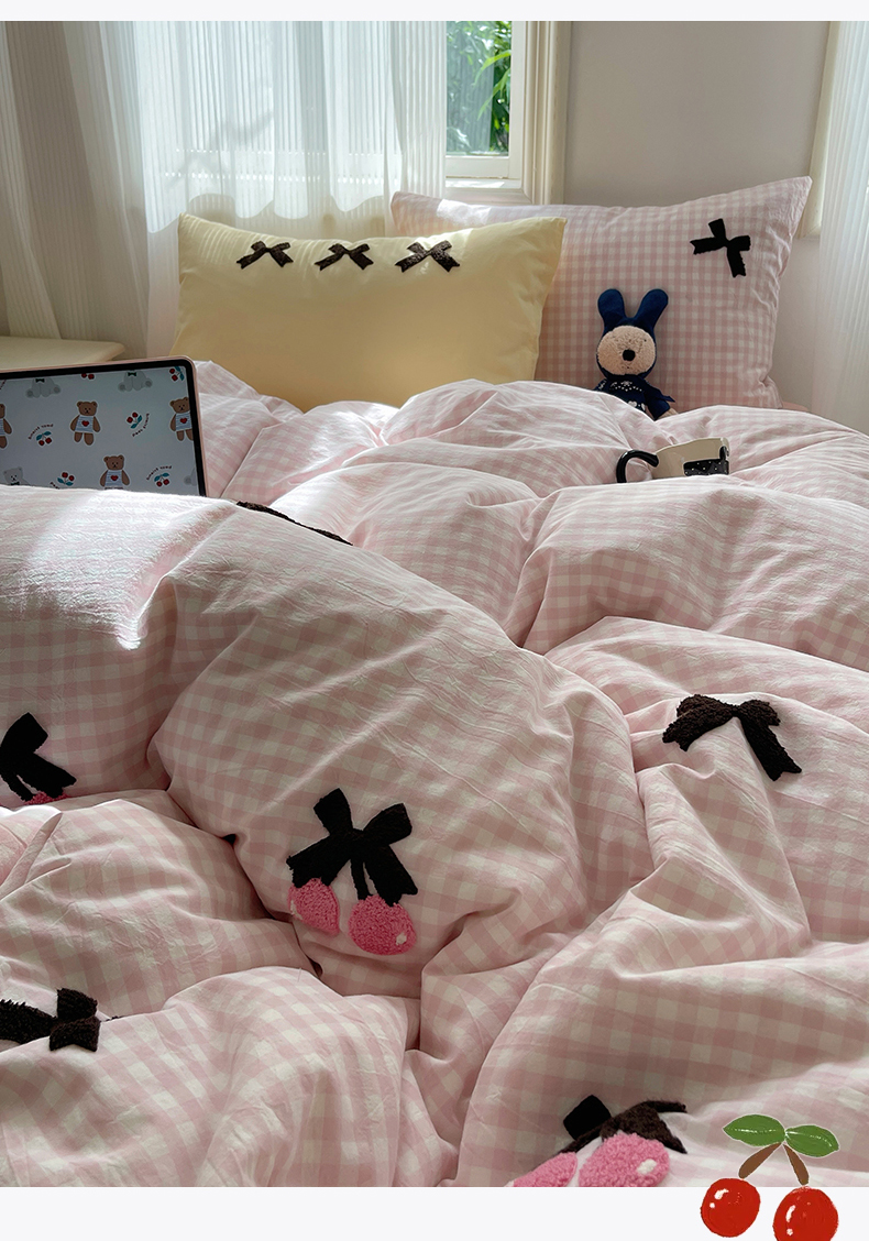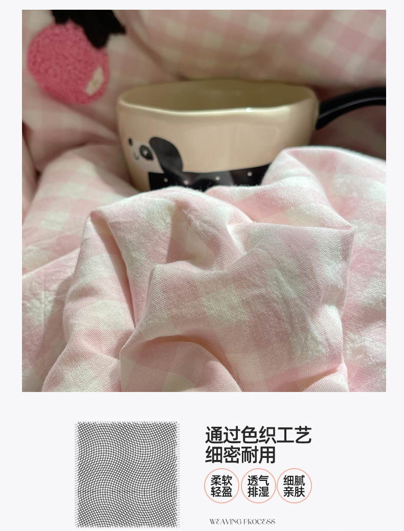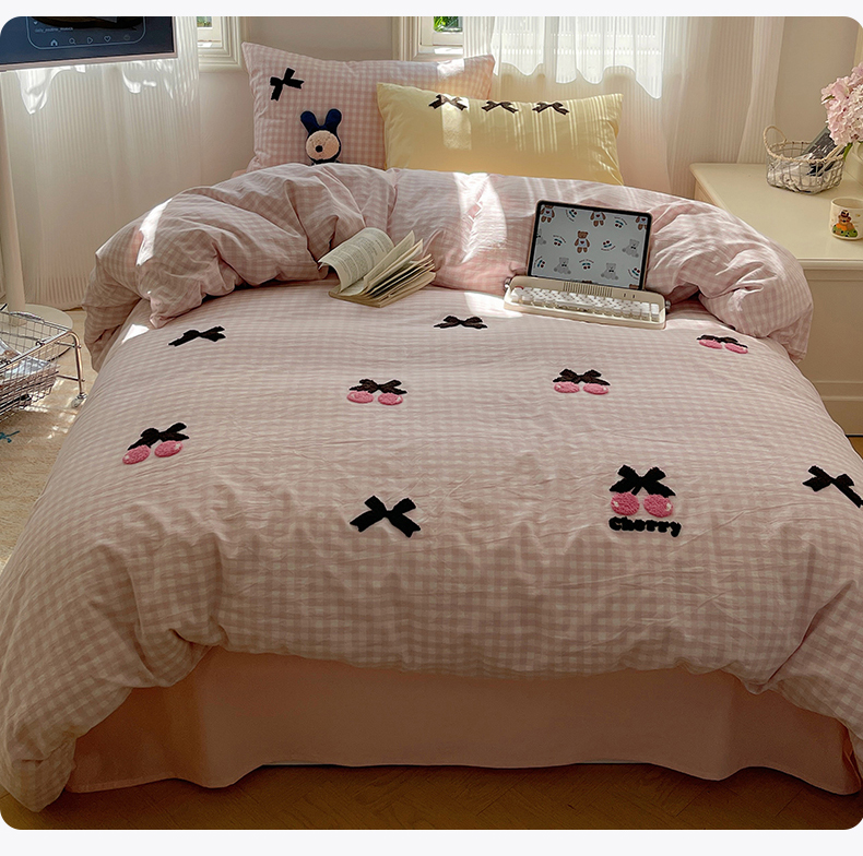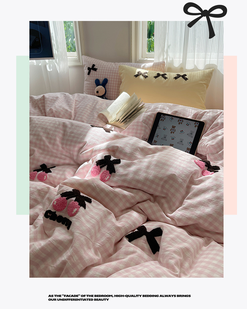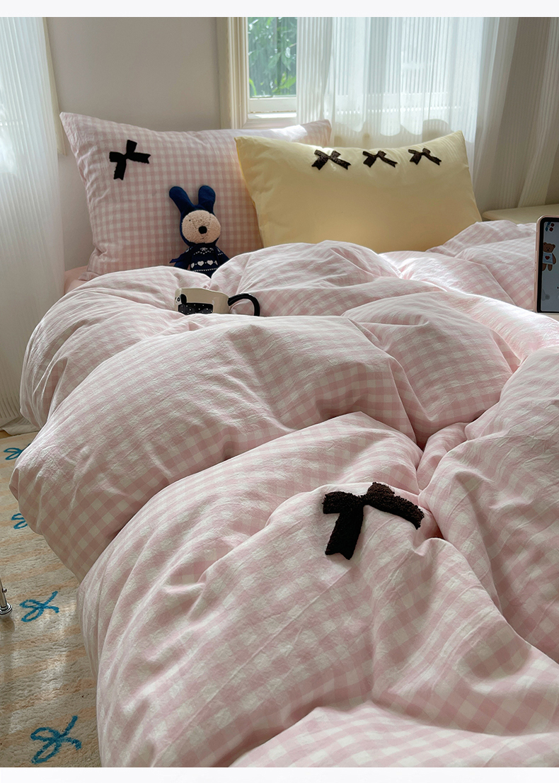 • 91家纺网 家纺一手货源 找家纺 北欧良品 2025新款A类色织水洗棉毛巾绣蝴蝶结少女系列单被套 蝴蝶结-奶油格粉+粉黄