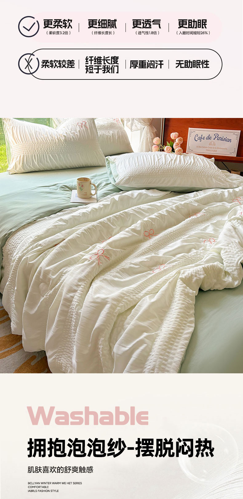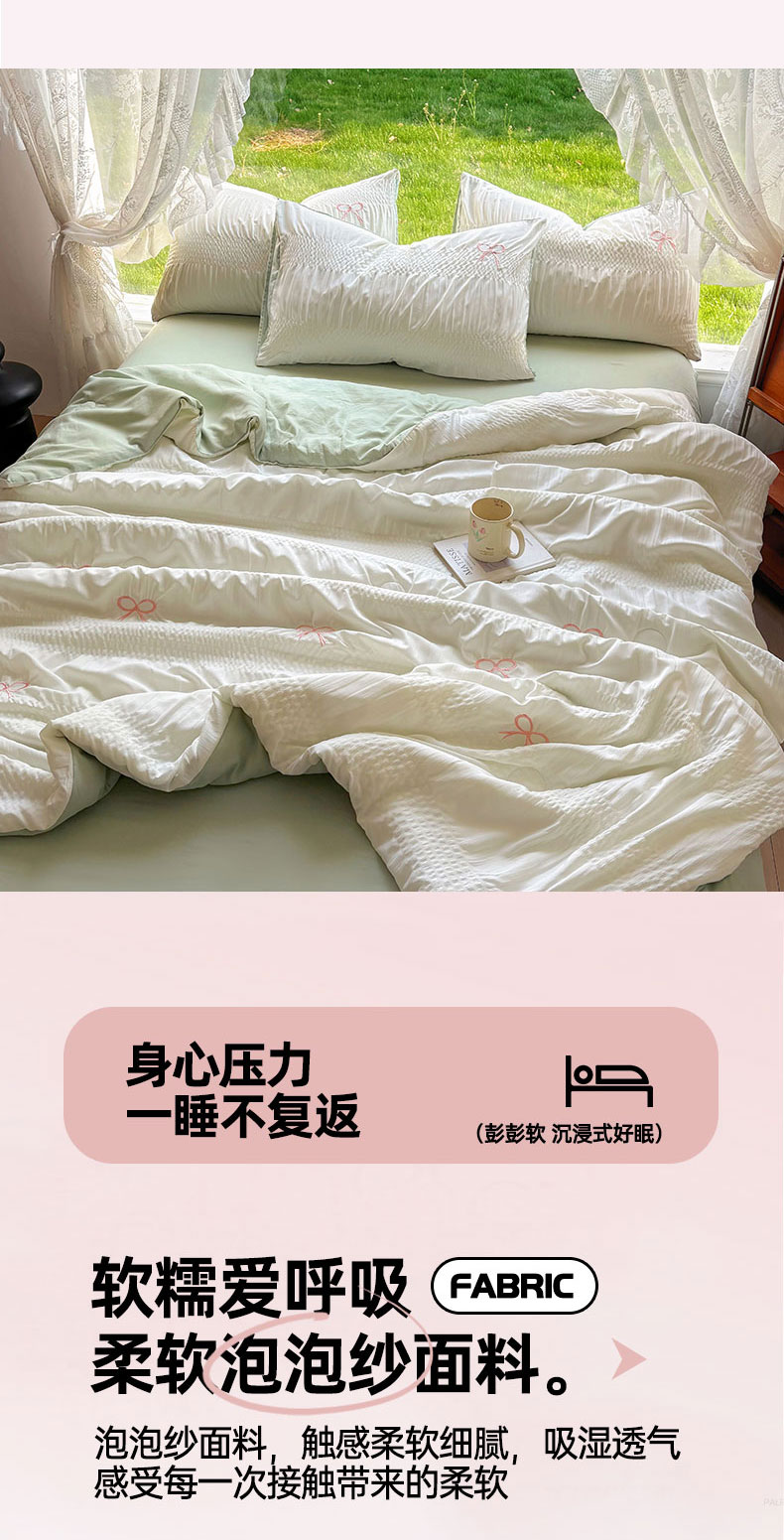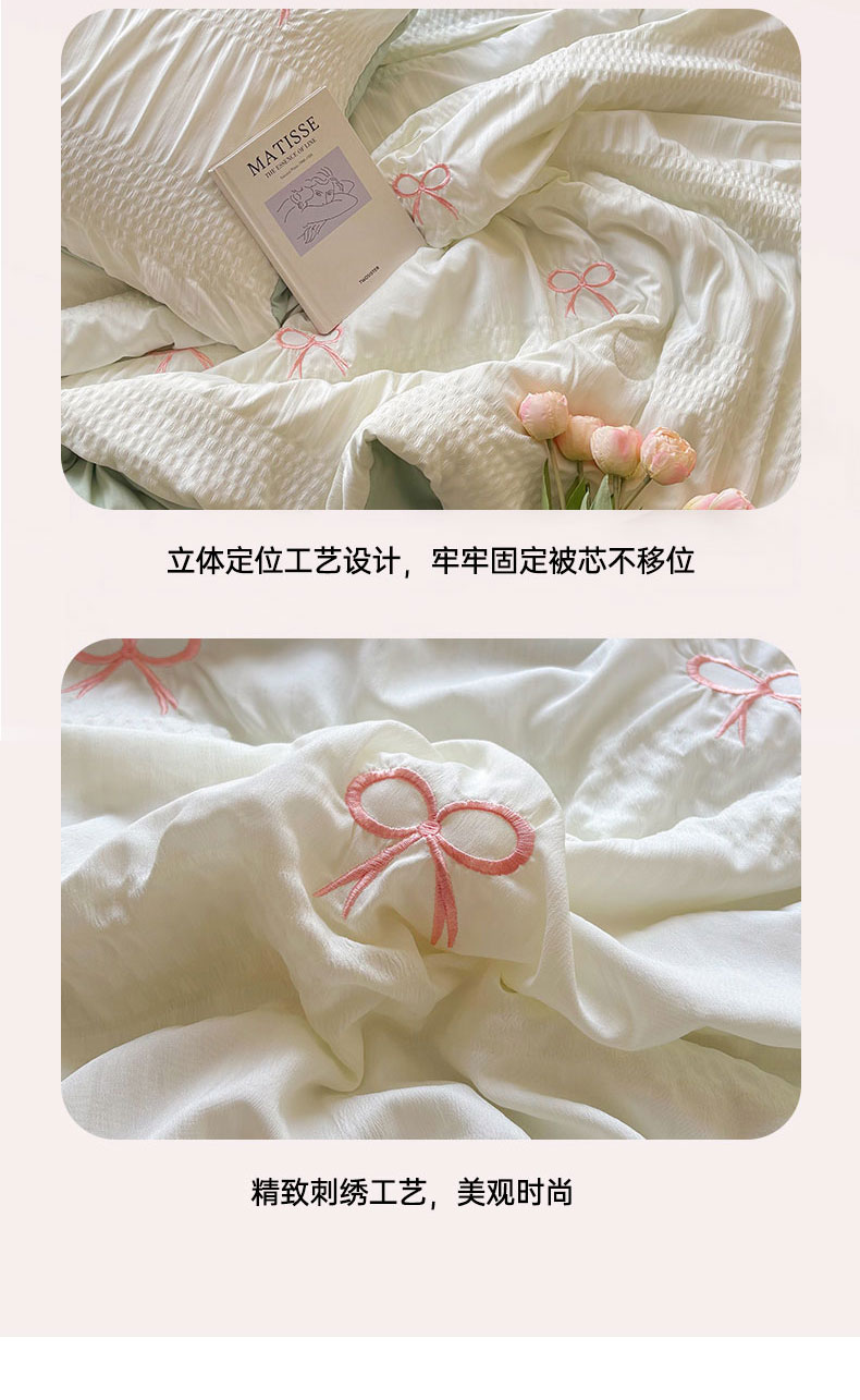 当前位置: 91家纺网 > 商品网购 > 床品套件 > 四件套 > 全棉普通四件套 > 灰鲸 2025新款泡泡纱郁金香,蝴蝶结满绣系列夏被四件套 蝴蝶结-奶昔白+抹茶绿