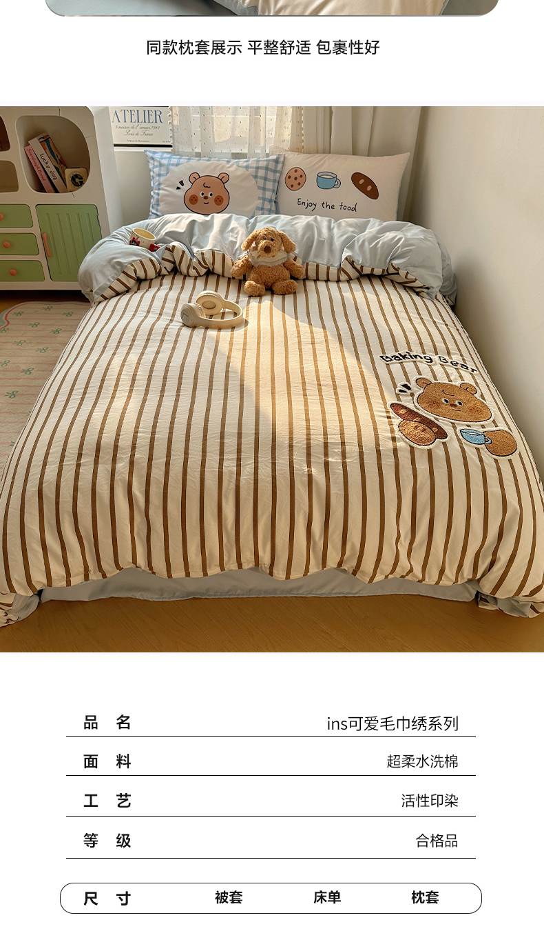 当前位置: 91家纺网 > 商品网购 > 床品套件 > 四件套 > 毛巾绣四件套 > 贝扬思家纺 2025新款萌萌哒卡通毛巾绣四件套 法棍面包小熊