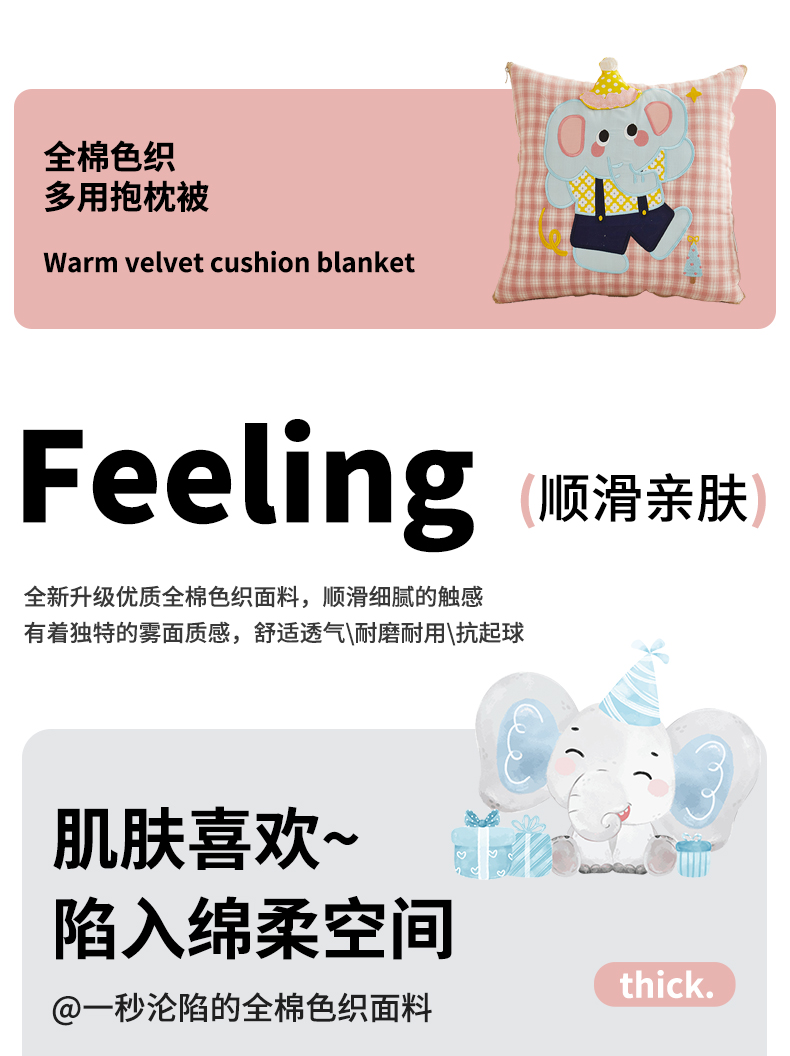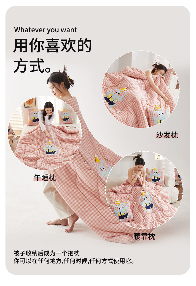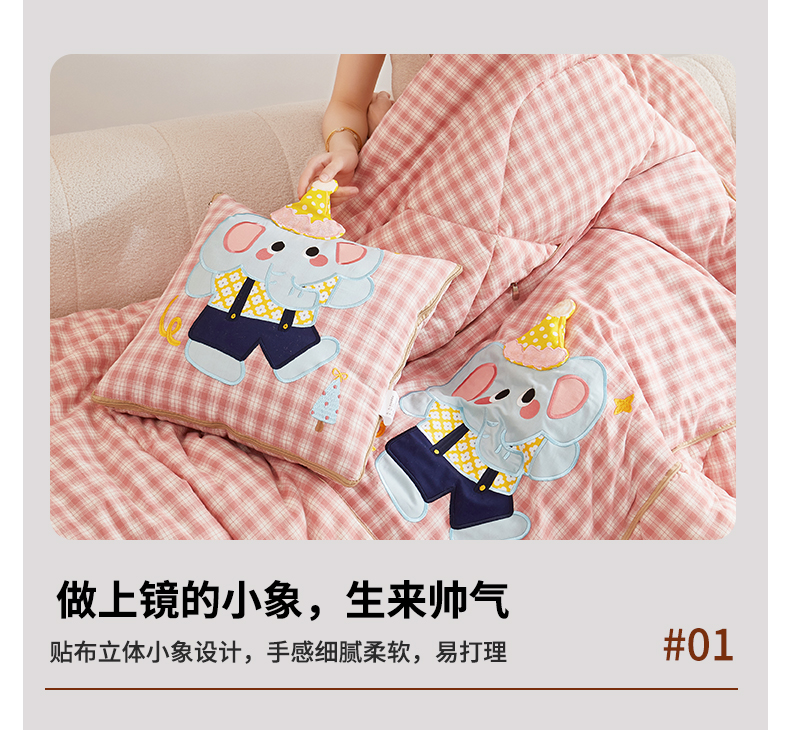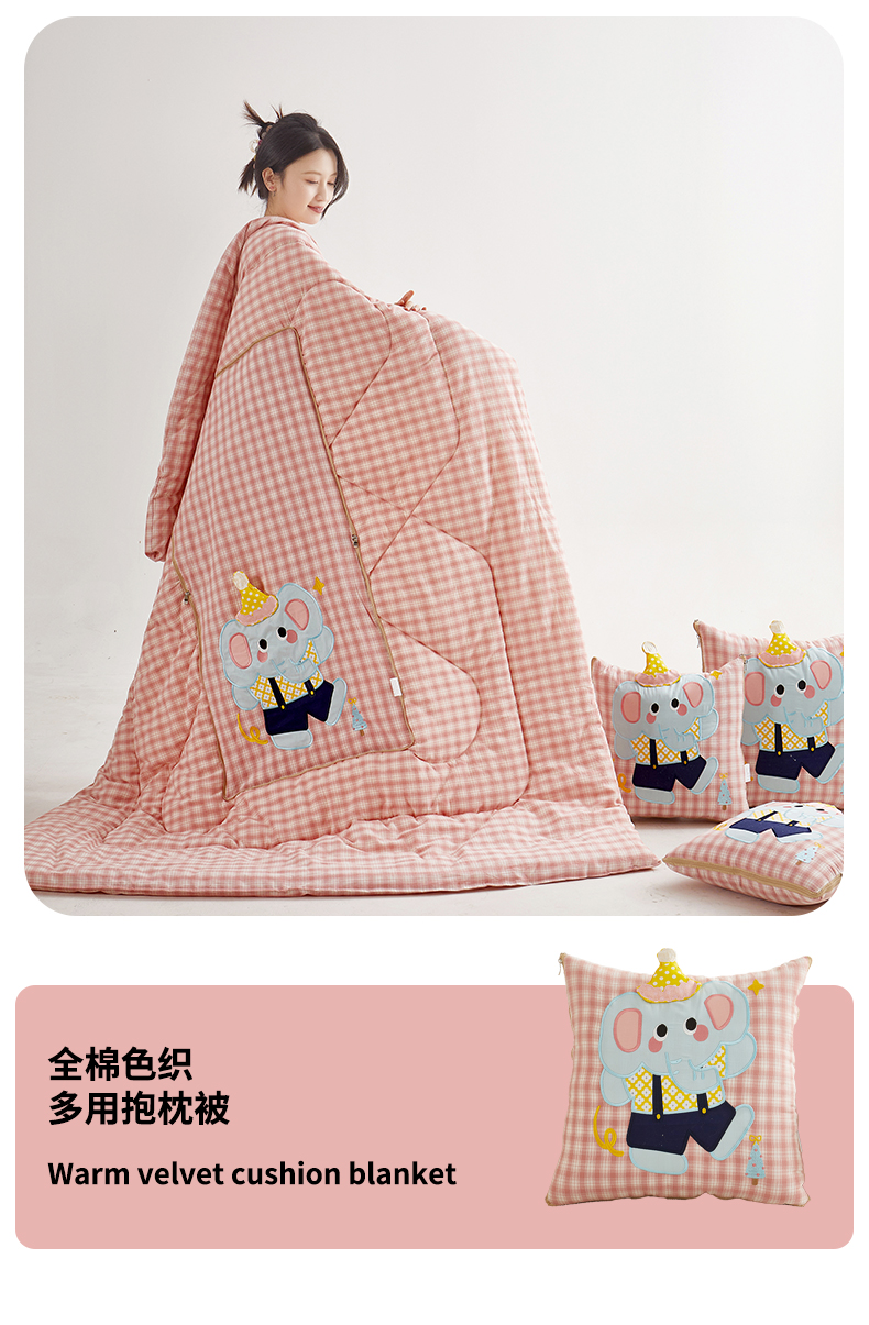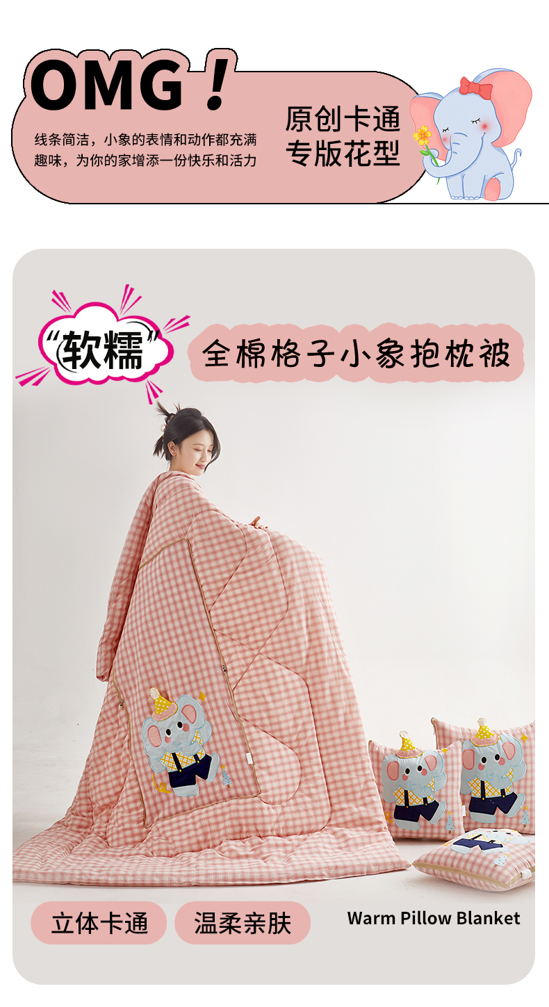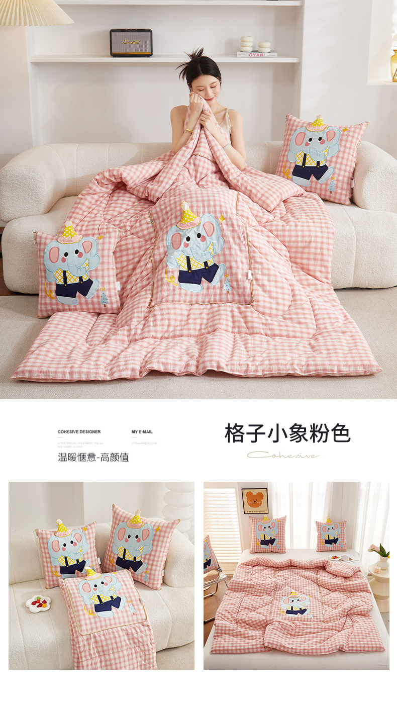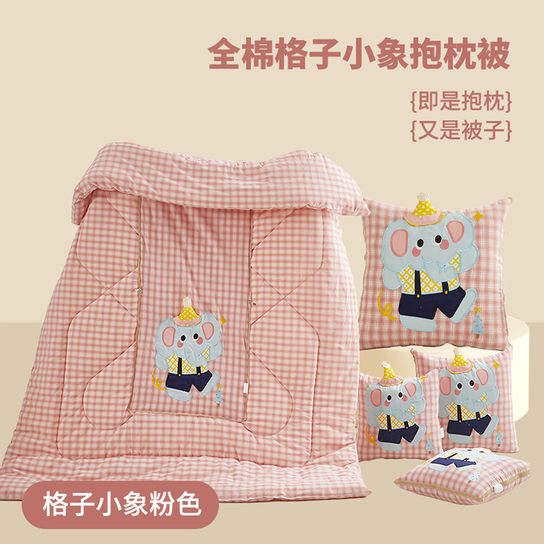 商品名称:古本家居 2025新款四季款全棉格子小象抱枕被 格子小象粉色