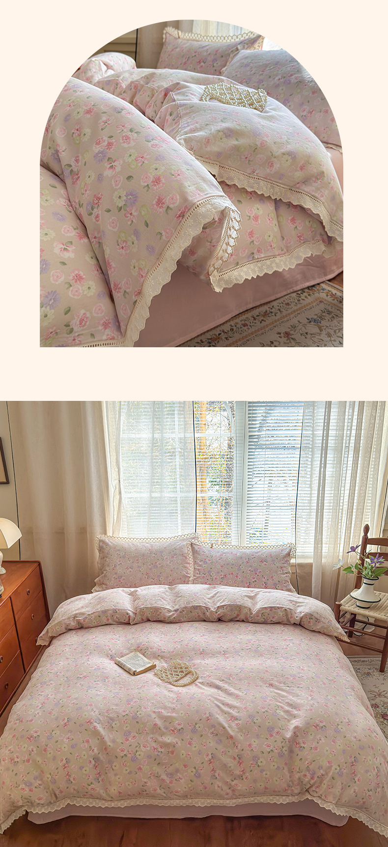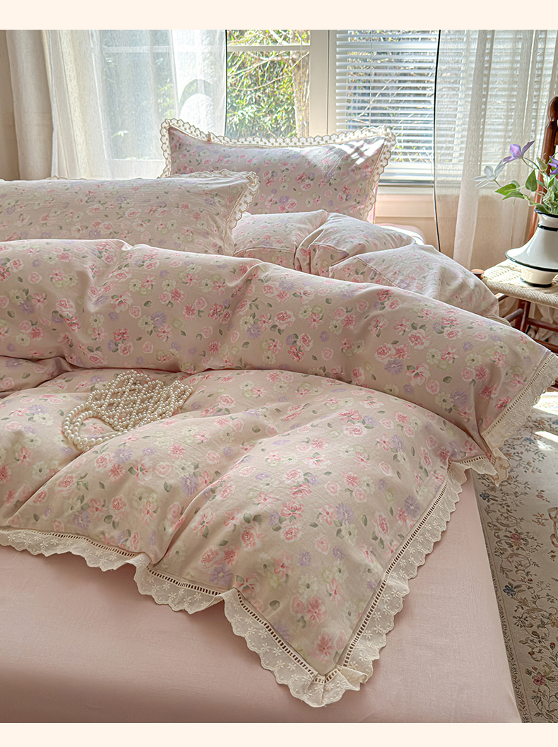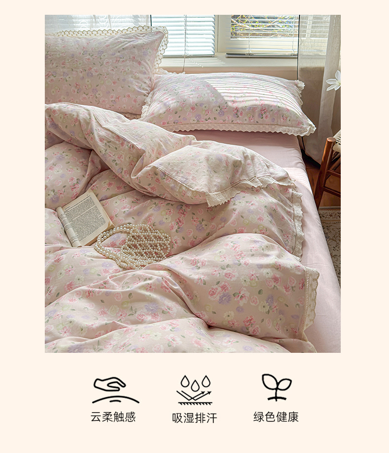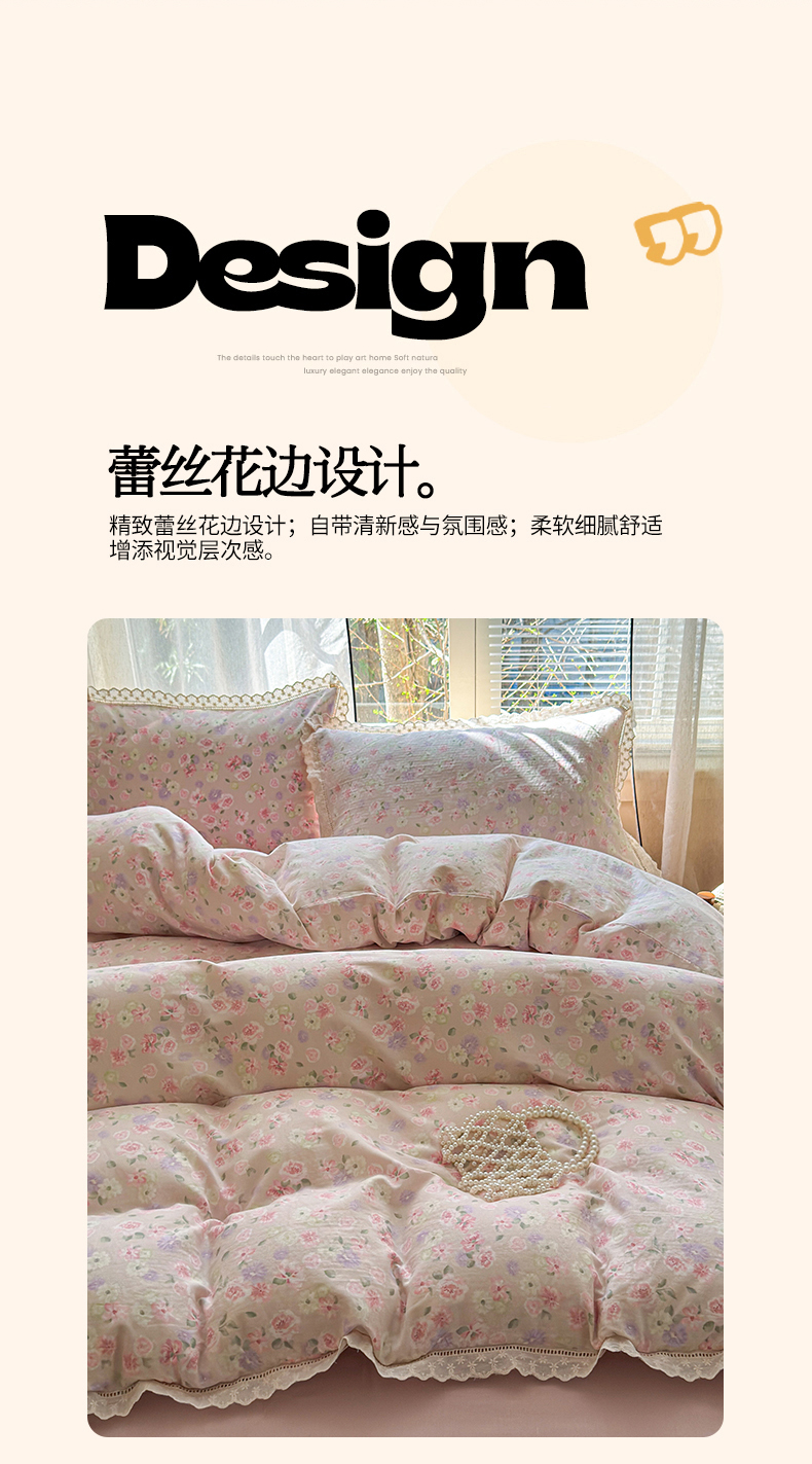 商品名称:曼之夏 2025新款A类全棉双层纱花边四件套 晚香玉