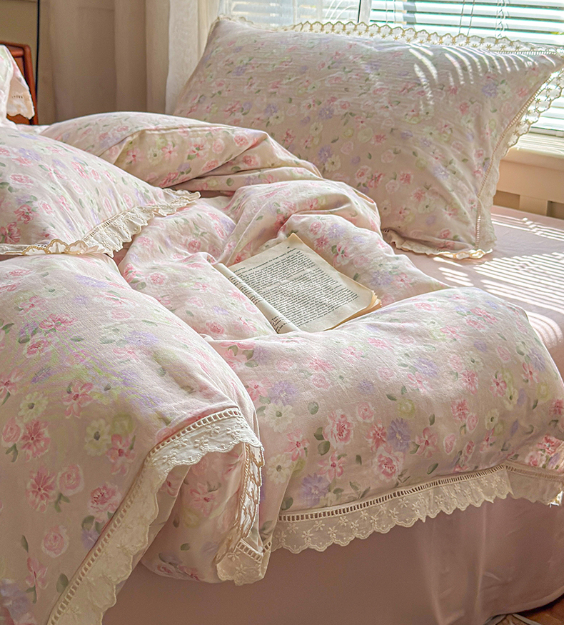 曼之夏 2025新款A类全棉双层纱花边四件套 晚香玉
